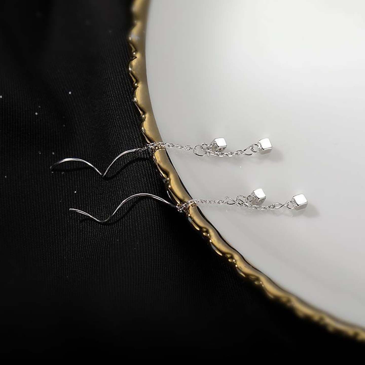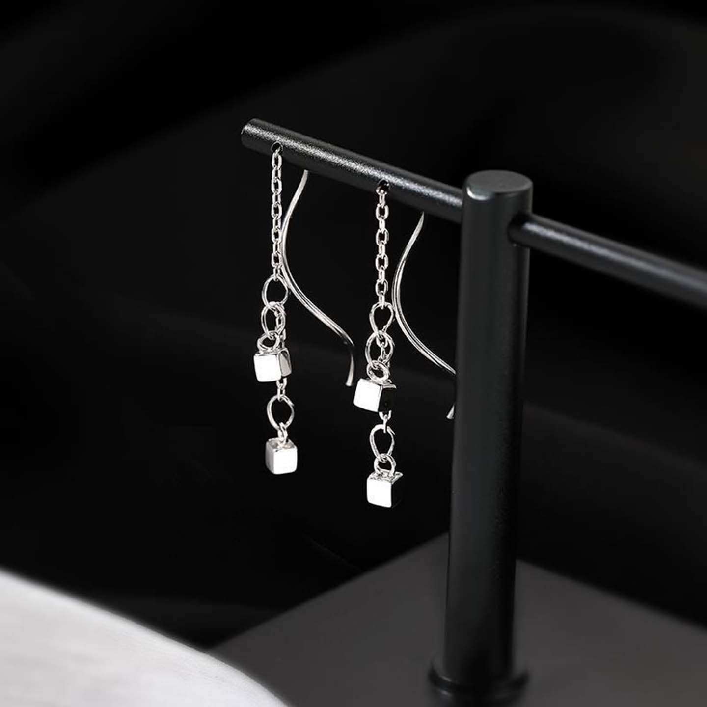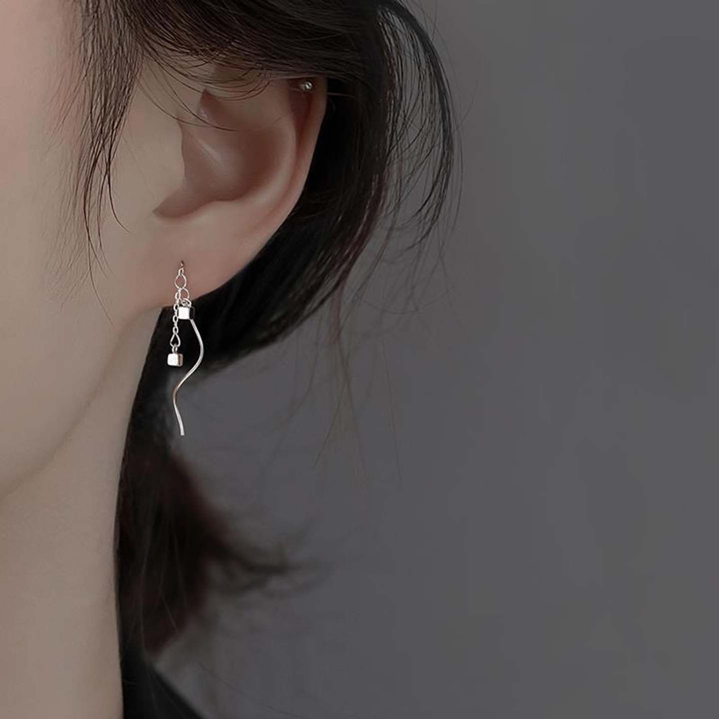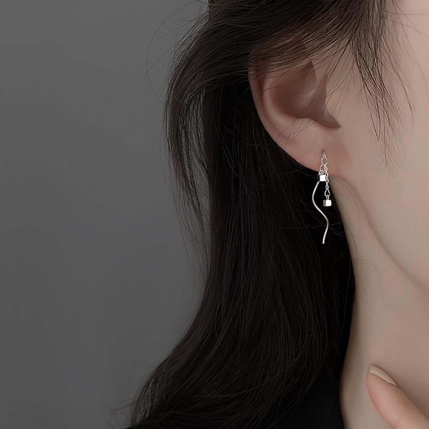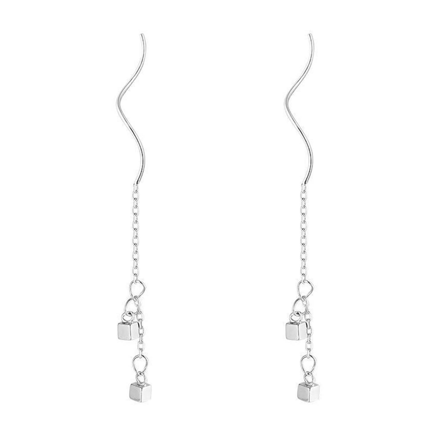 双层小方块耳线波浪链条流苏耳环女简约个性小众冷淡风气质耳坠