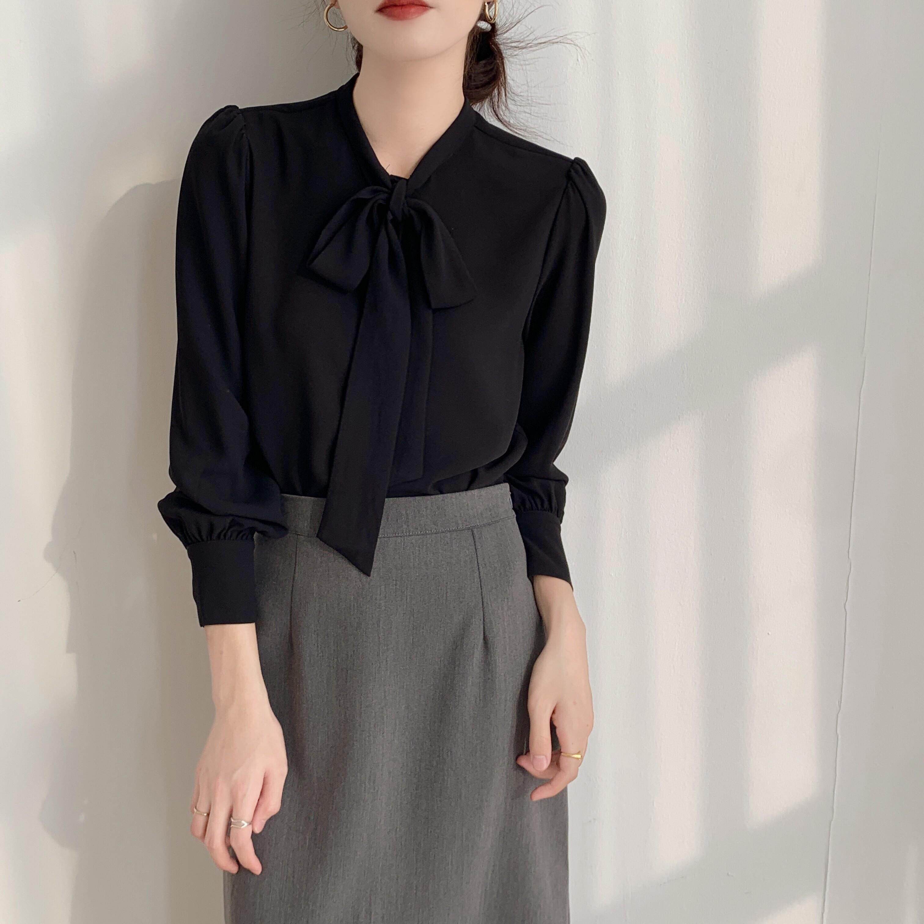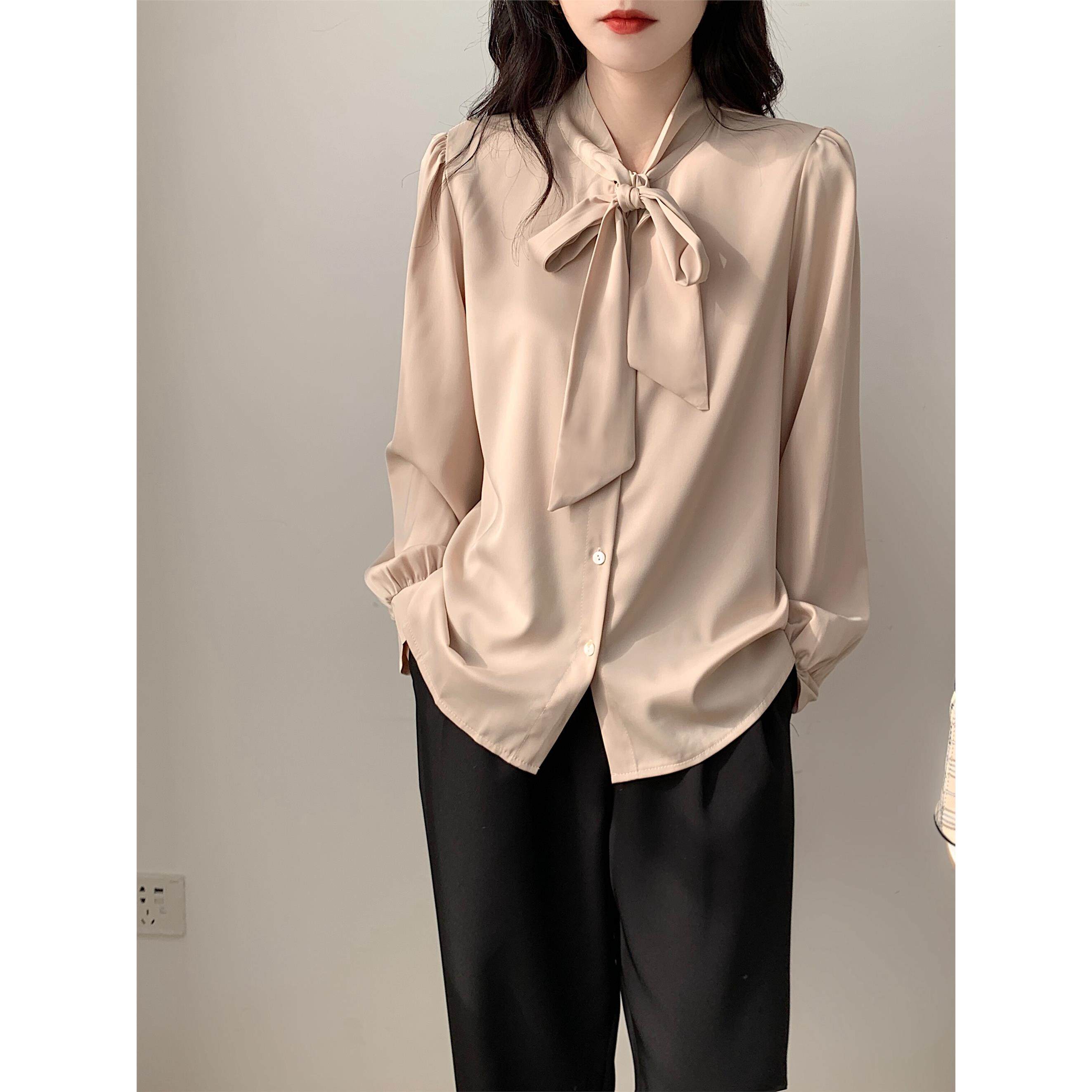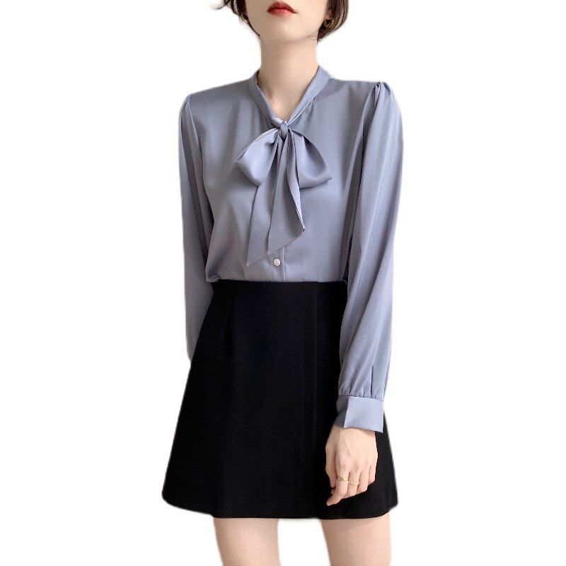蓝色蝴蝶结衬衫女设计感小众职业气质衬衫雪纺上衣系带春秋长袖