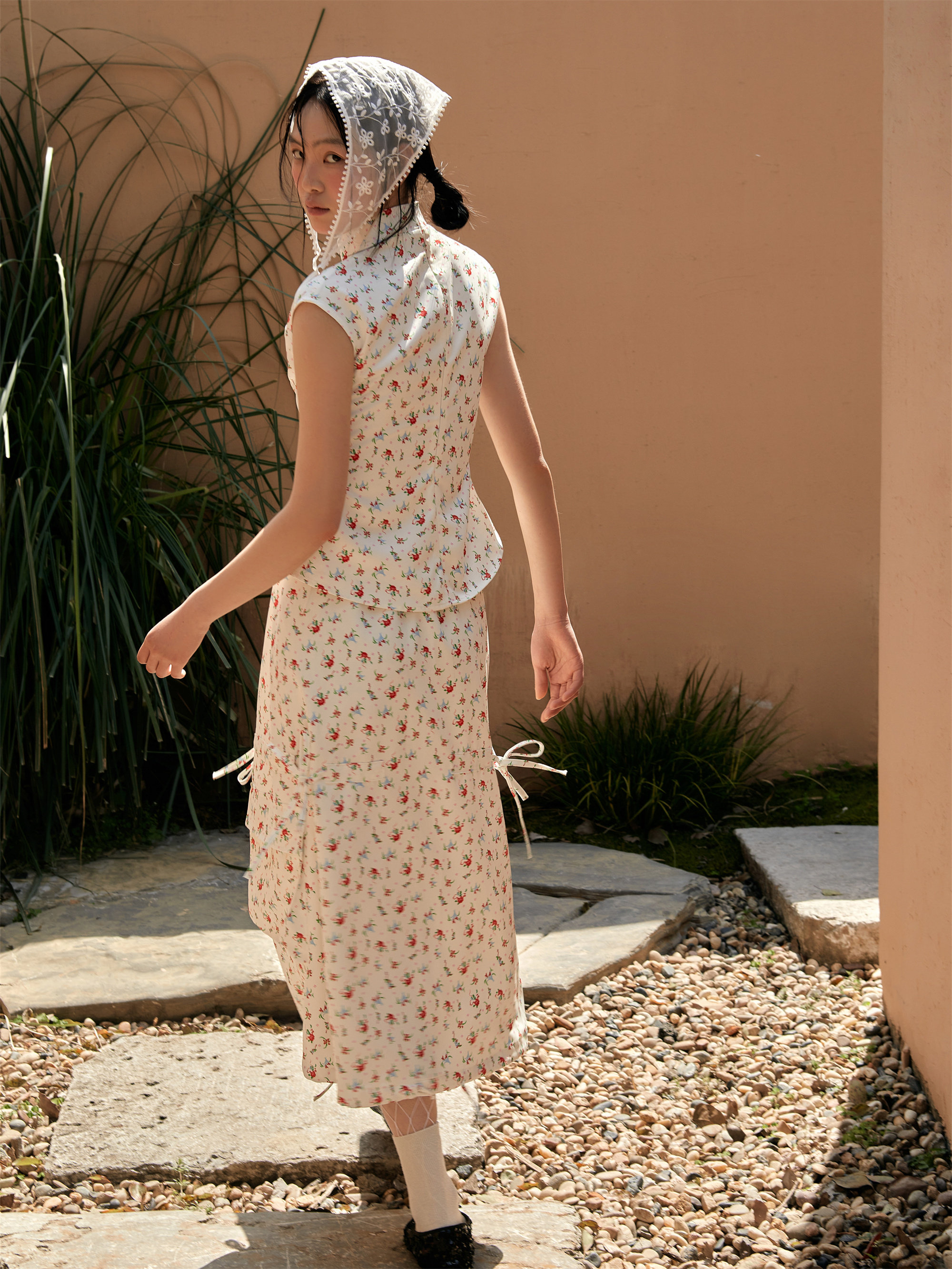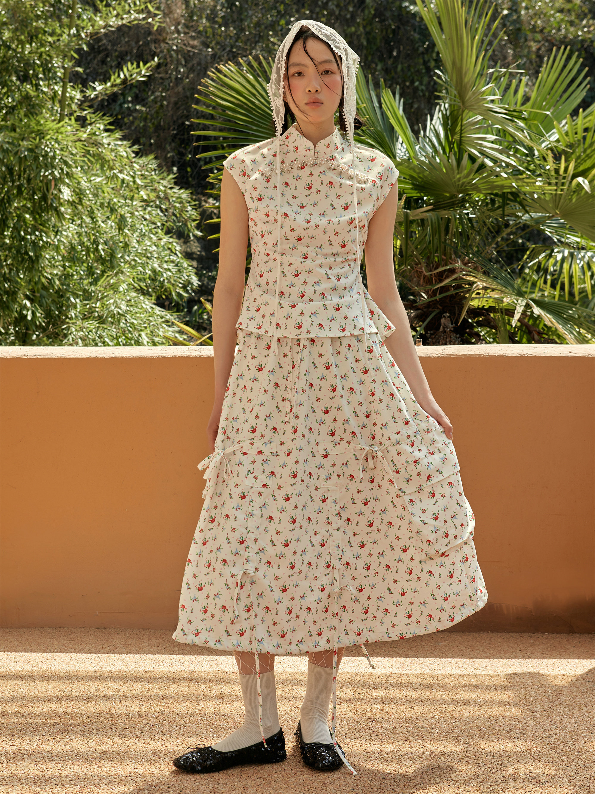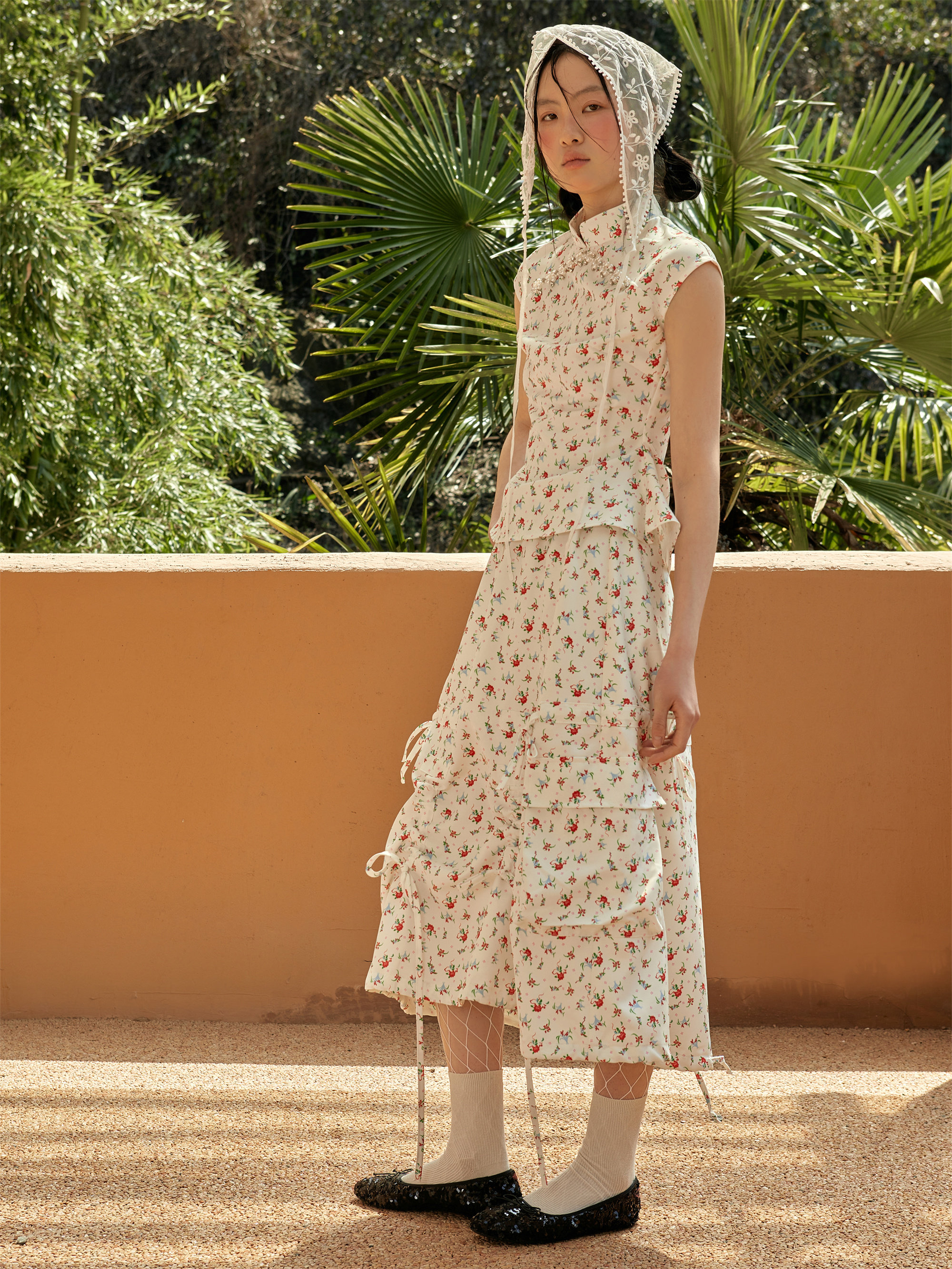 Shiitake 花卉画卷清甜碎花印花不规则抽褶设计半身裙女