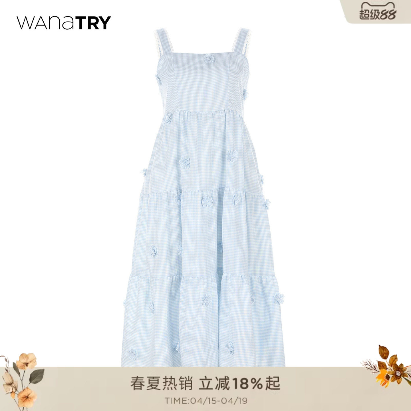 wana try格纹装饰花朵蓝白连衣裙2026年夏季新款温柔甜美女款裙