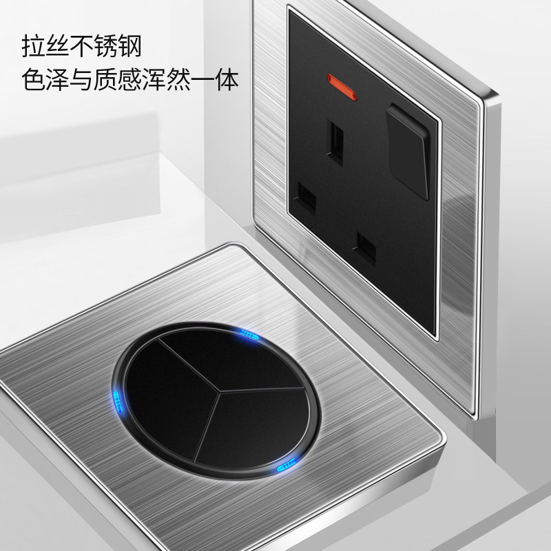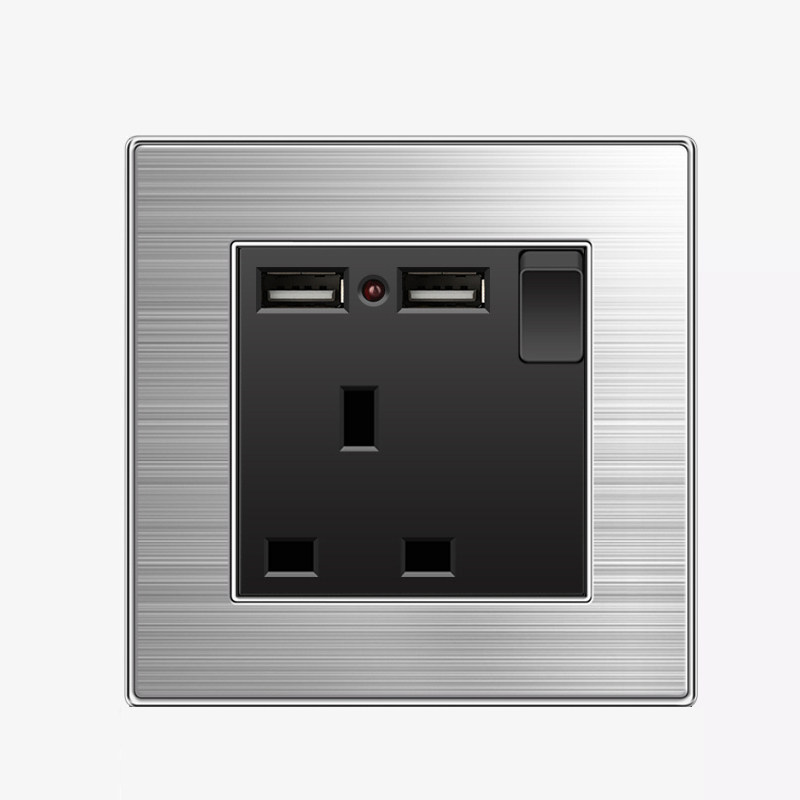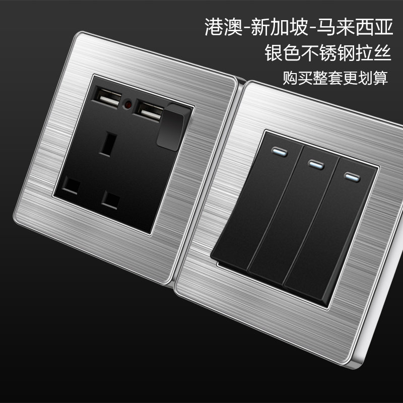澳门英式13A开关插座带USB港版电制灯掣不锈钢拉丝银英标插苏面板