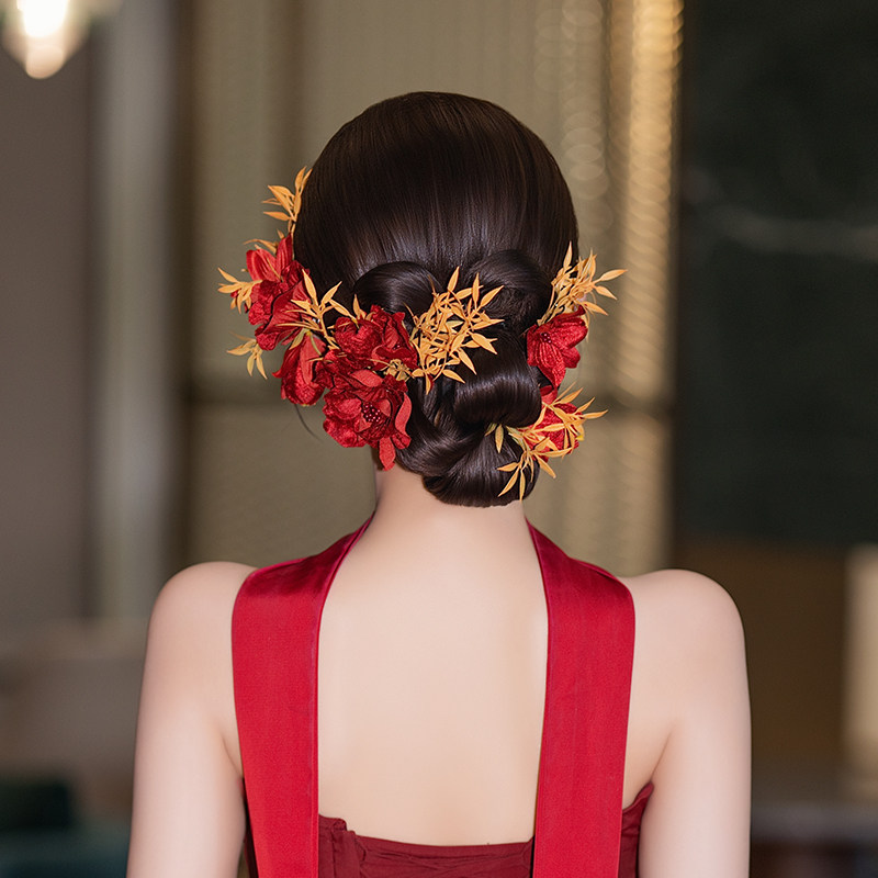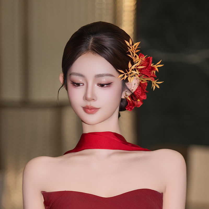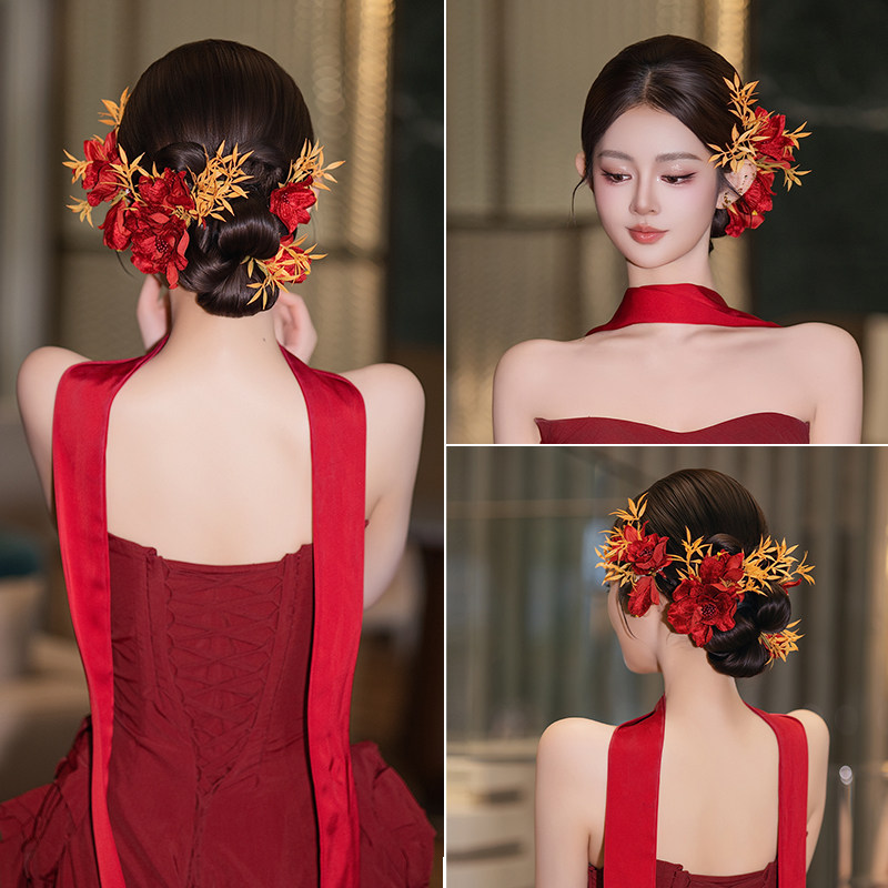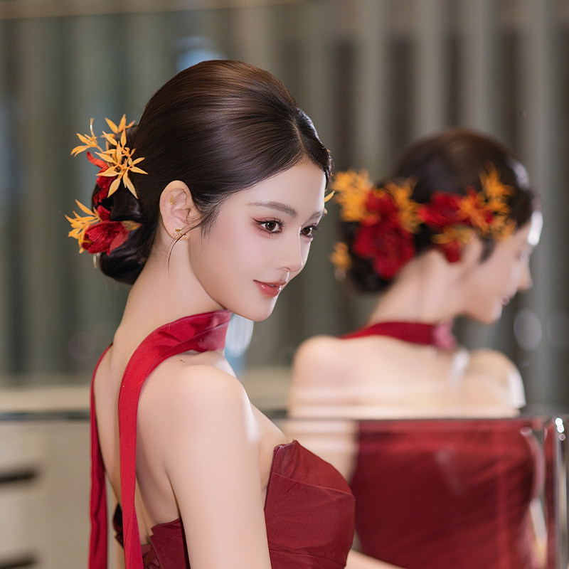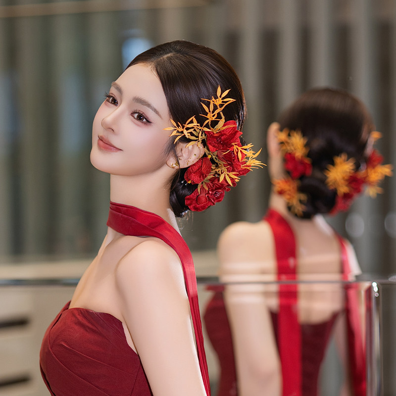 新娘发饰红色系高端手作花朵晚宴敬酒服后区盘发造型气质森系发饰