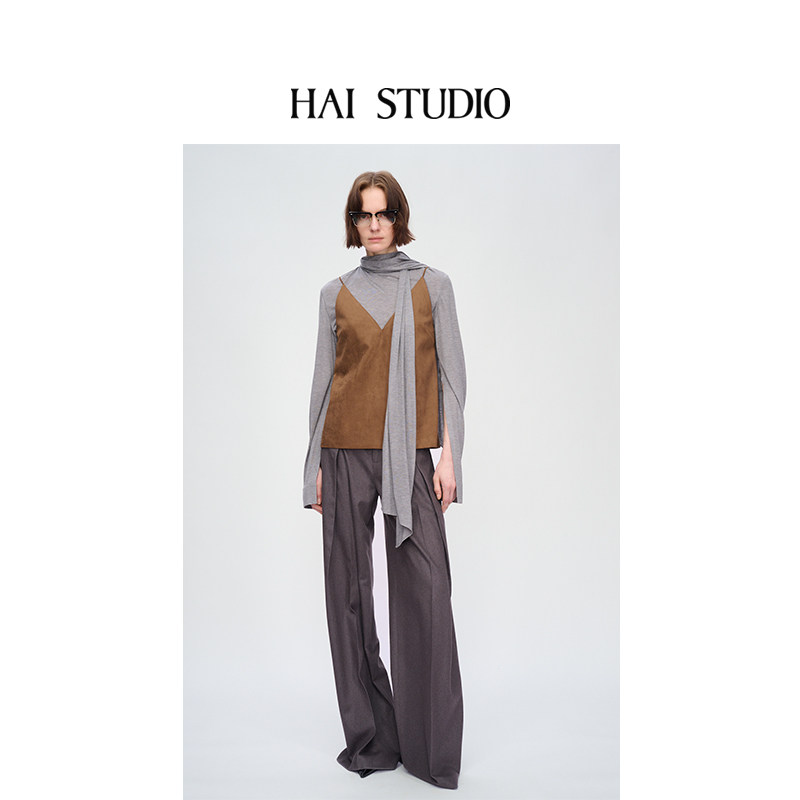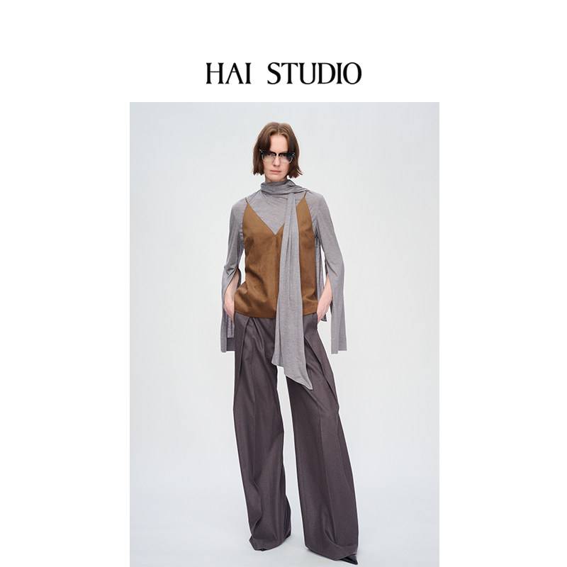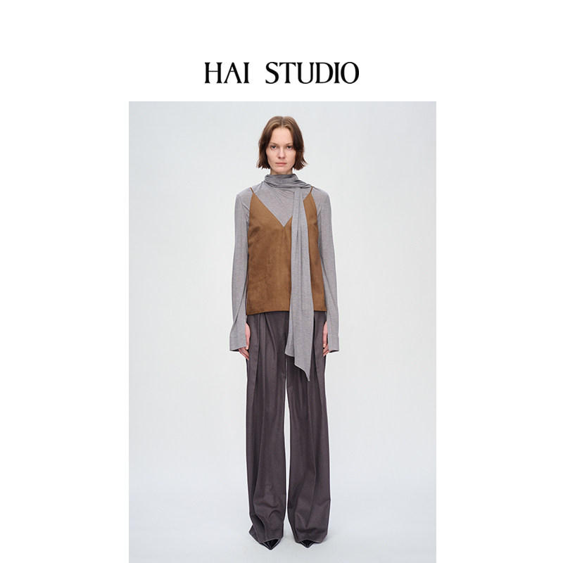 HAI STUDIO秋冬 女士咖色麂皮绒吊带衫上衣 V领外穿背心