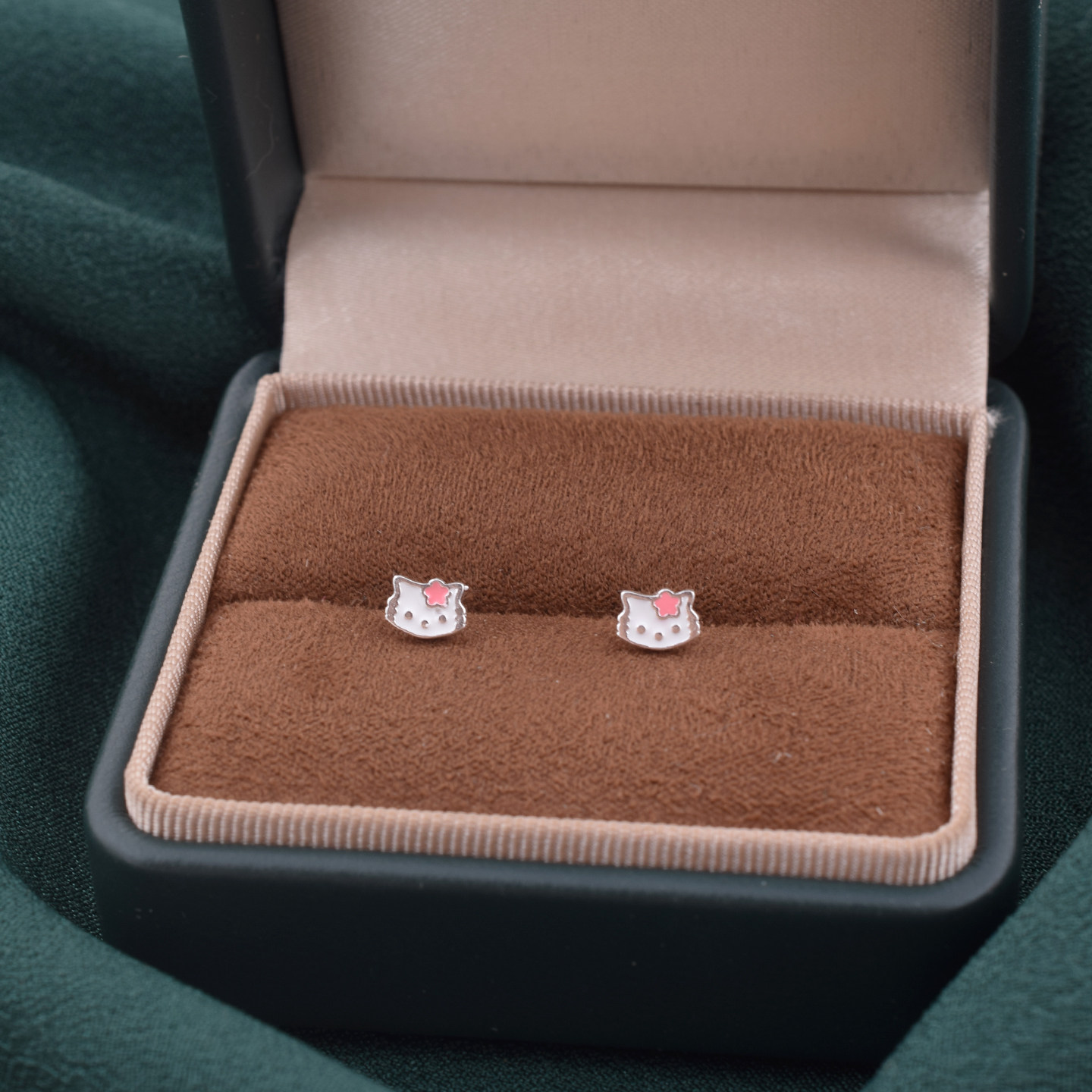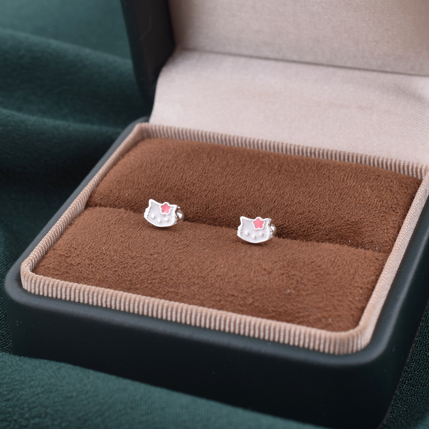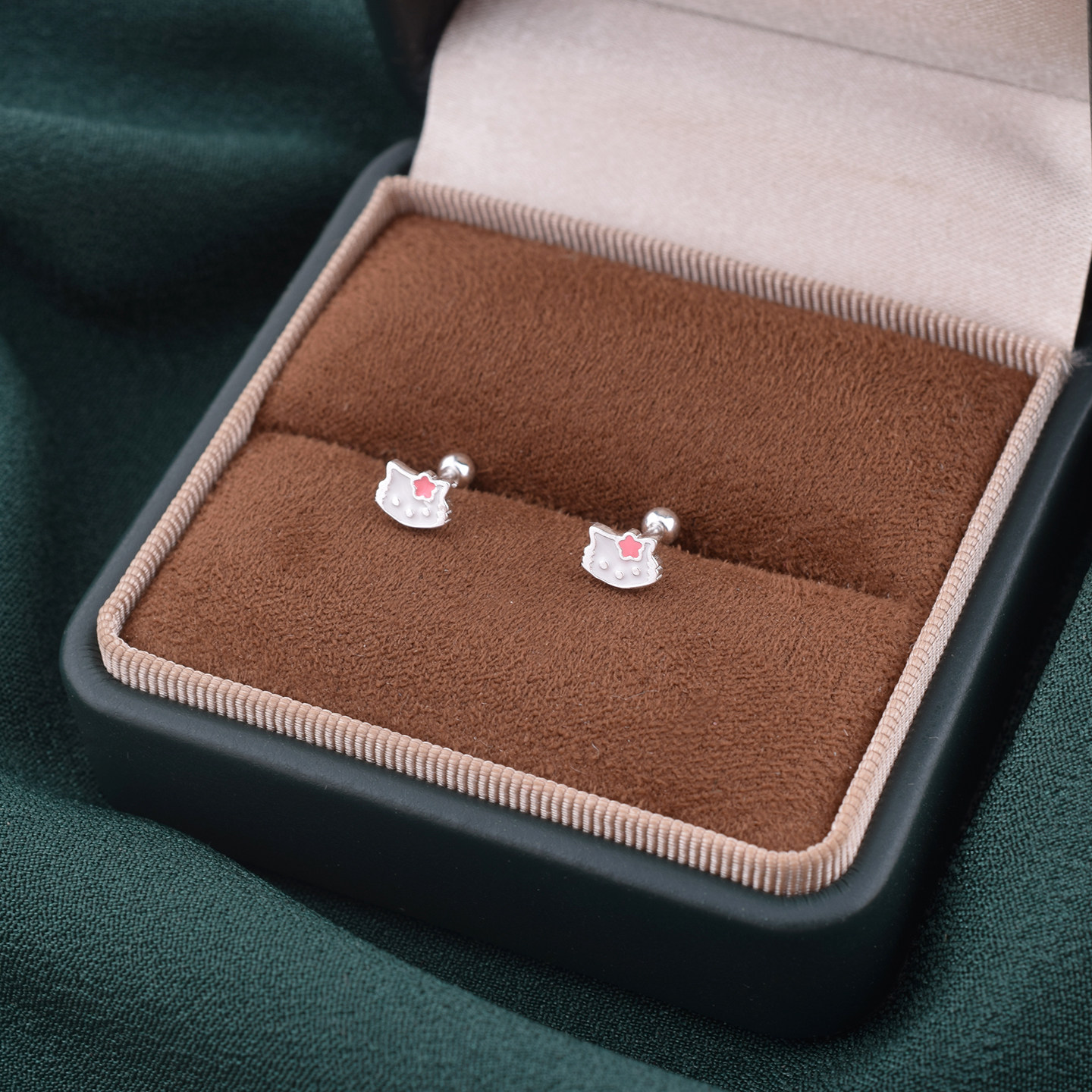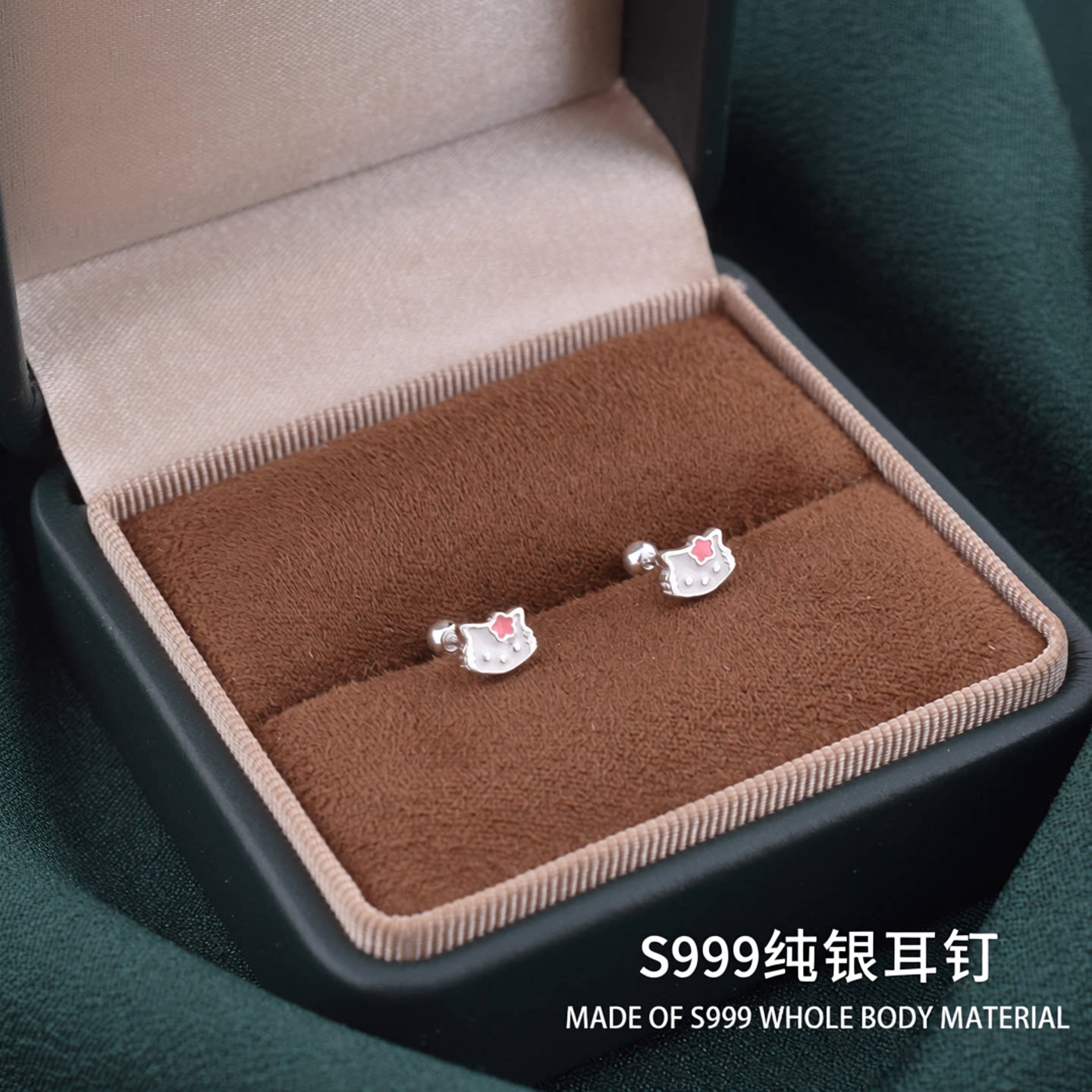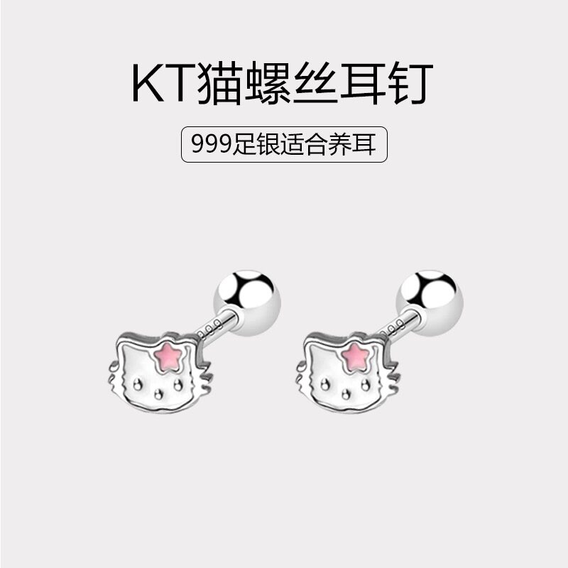 S999足银KT猫咪螺丝耳钉女童可爱甜美养耳耳环纯银耳骨儿童耳饰品