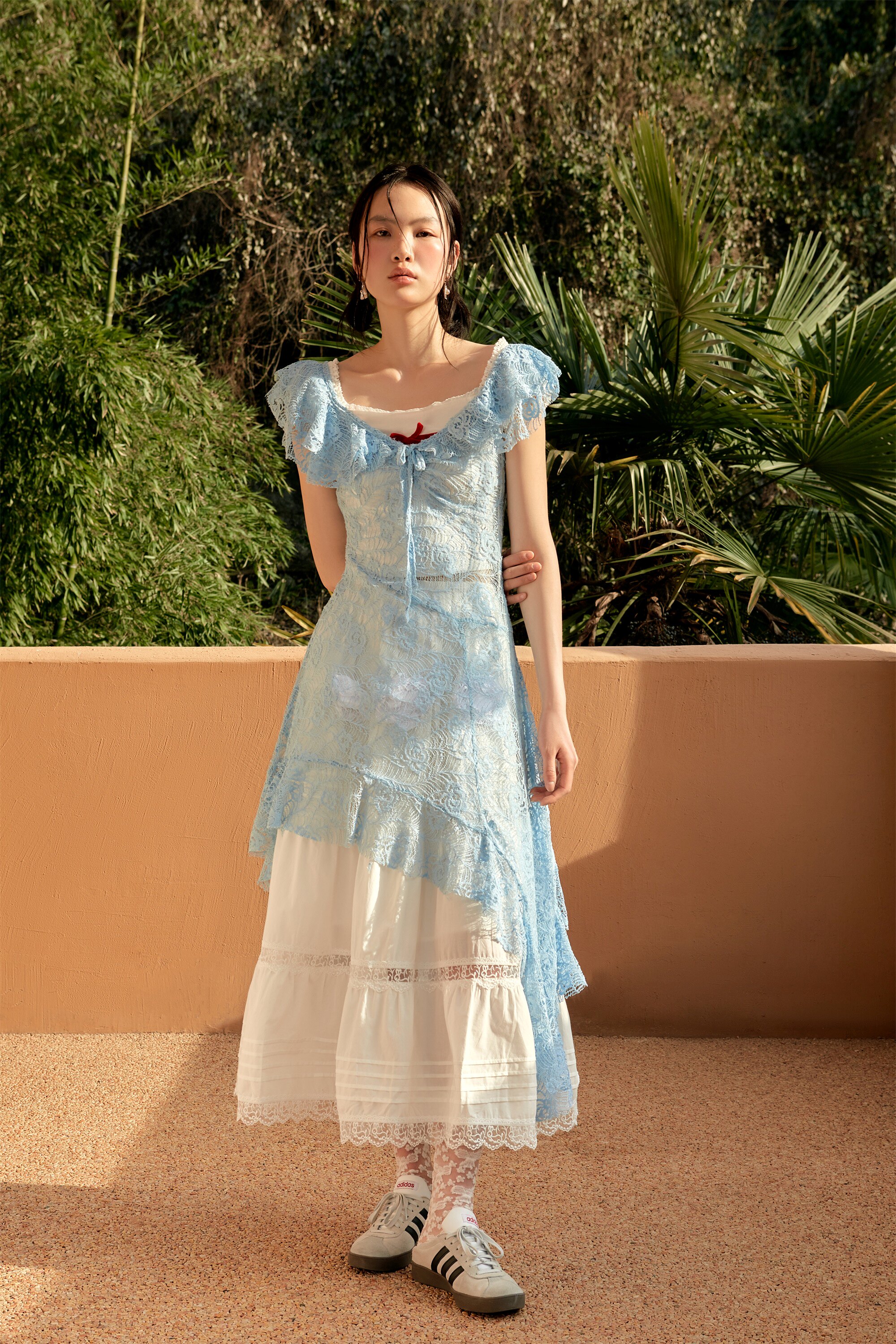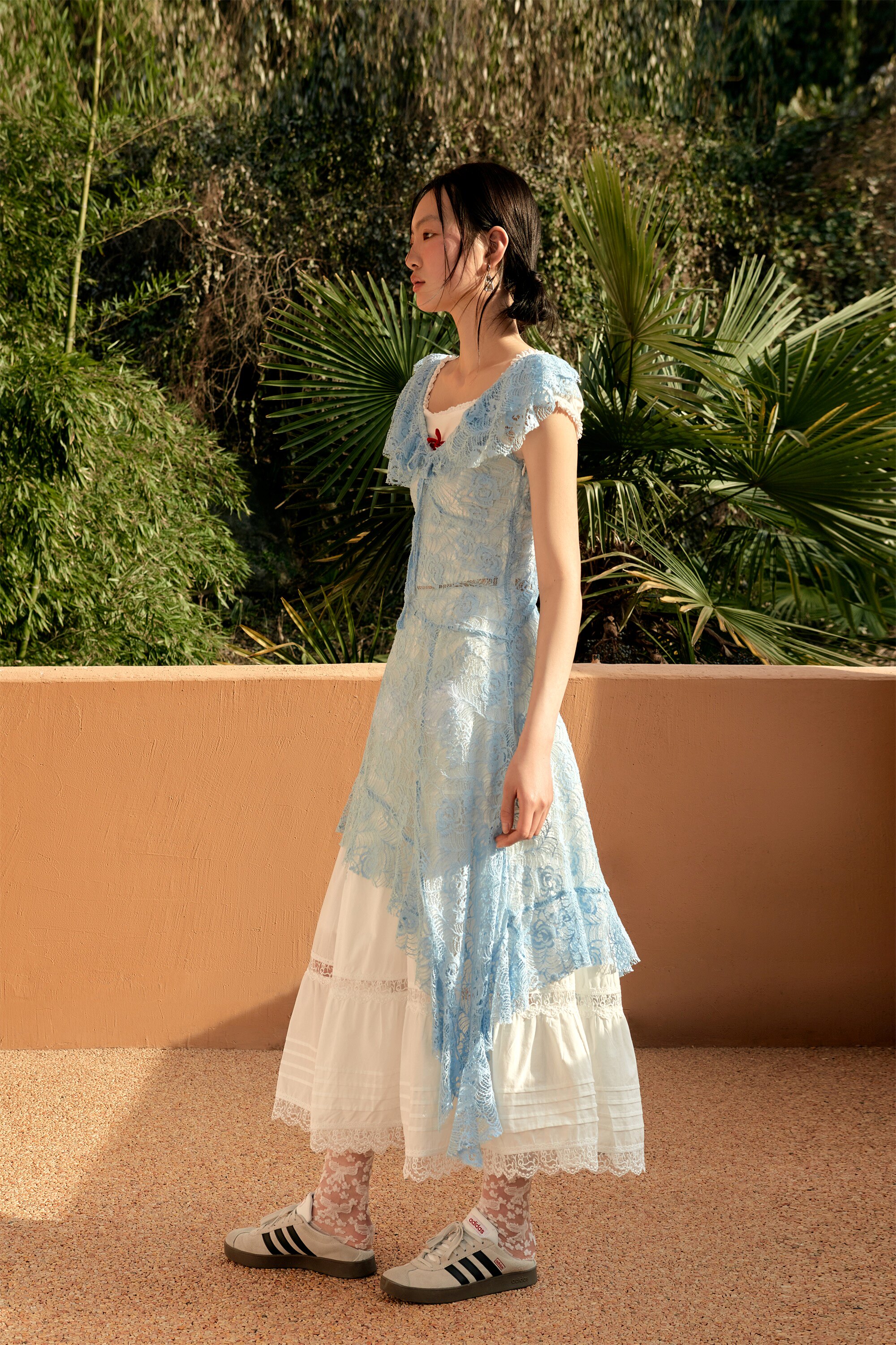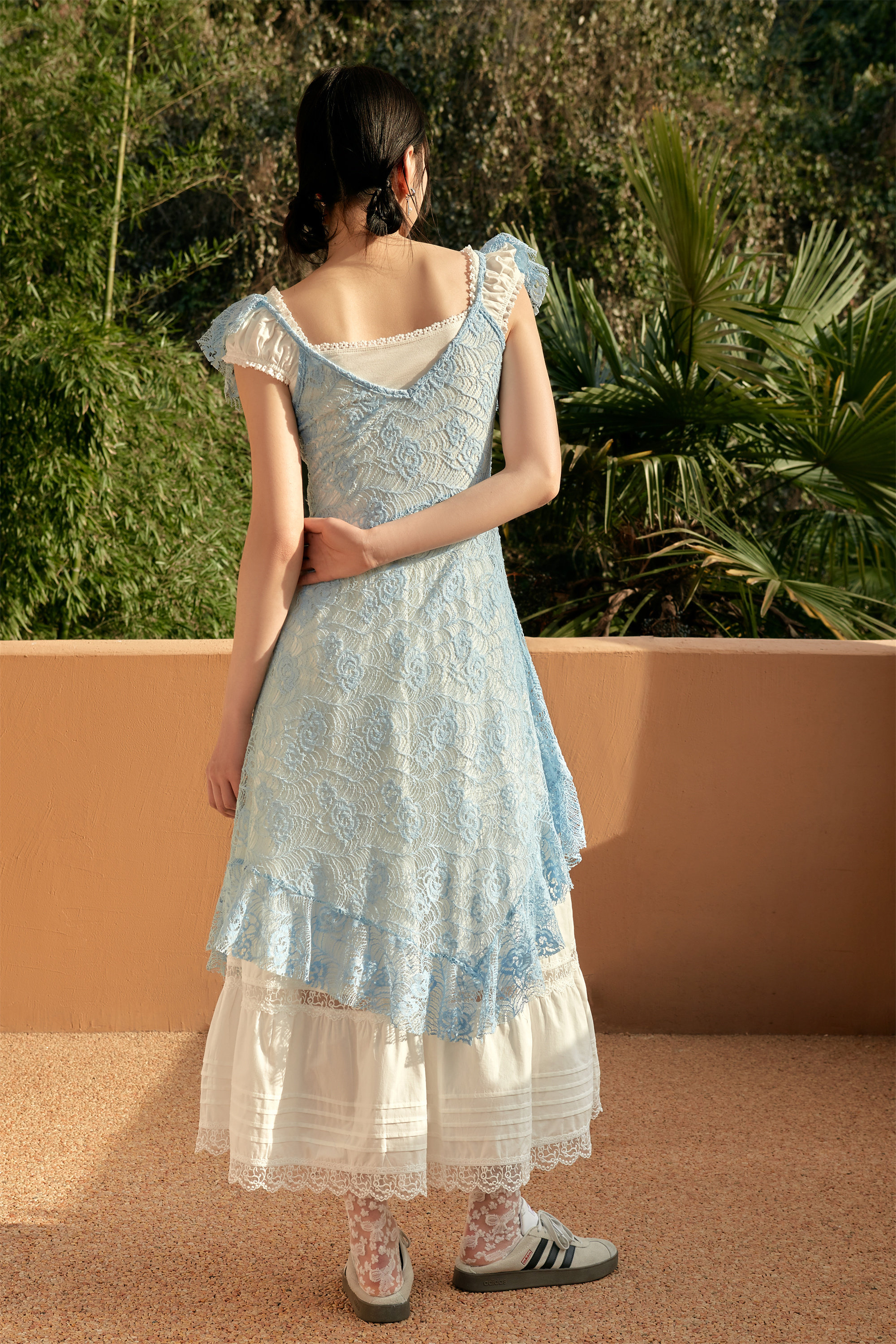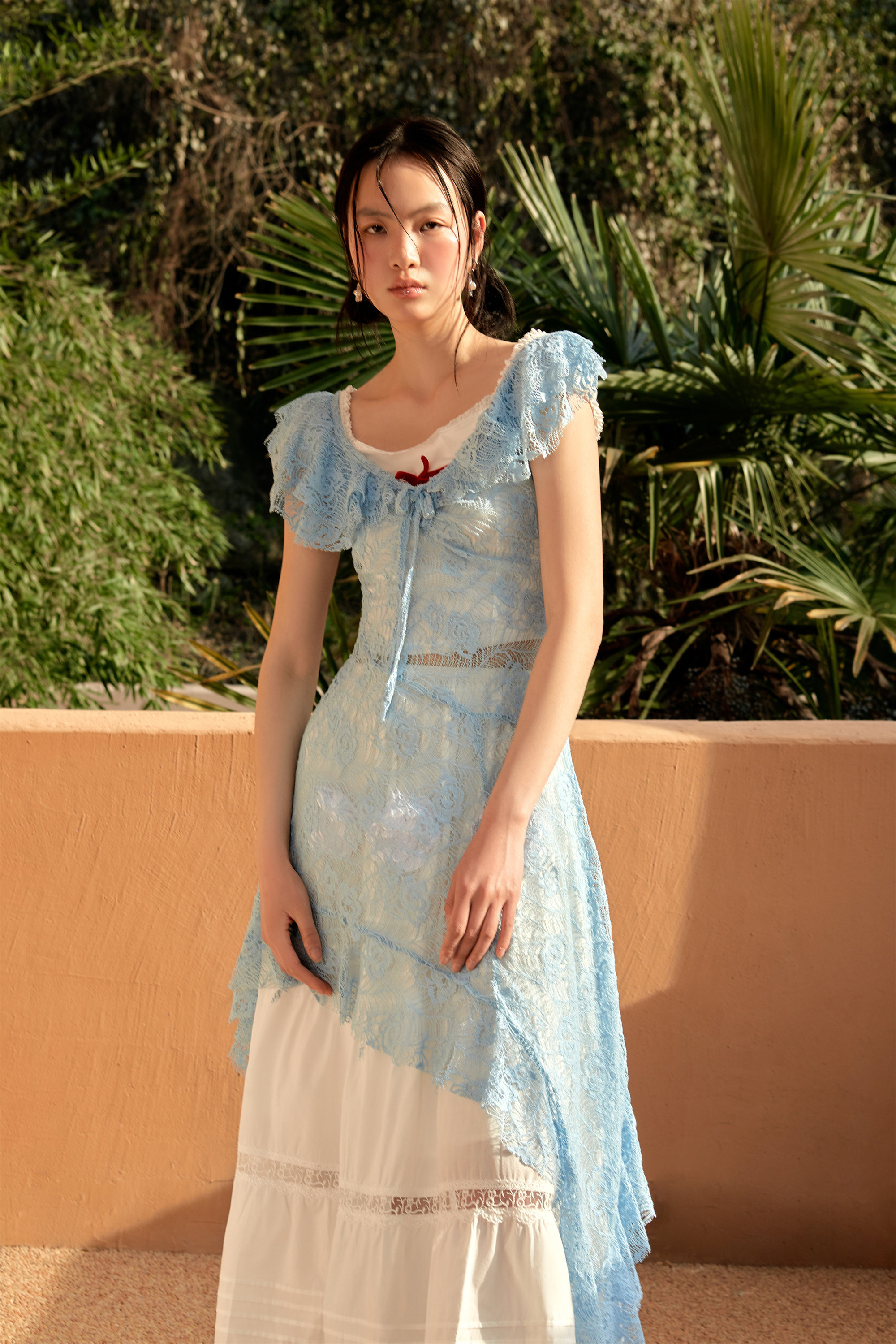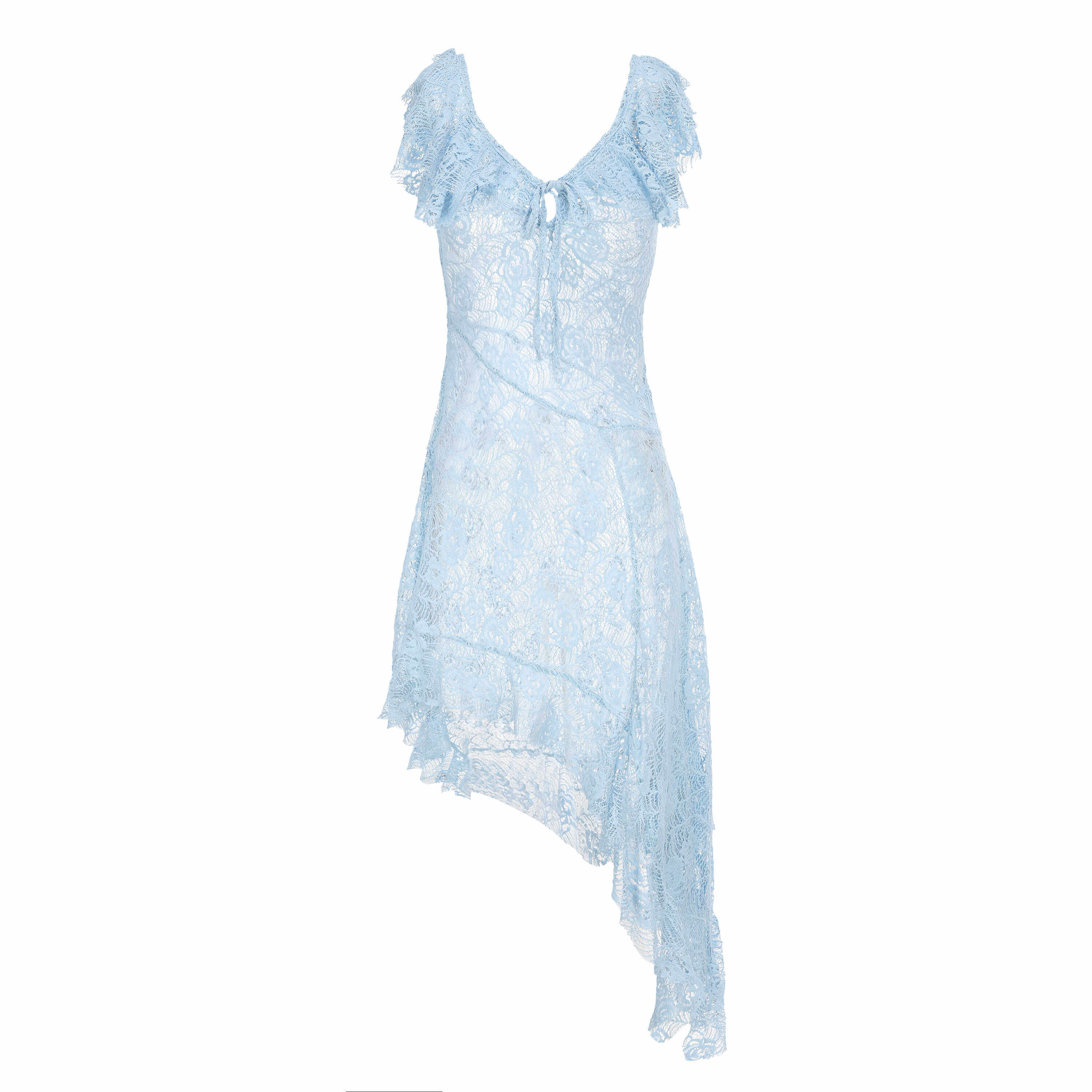 Shiitake 蓝色氧气感蕾丝镂空大领不规则叠穿连衣裙