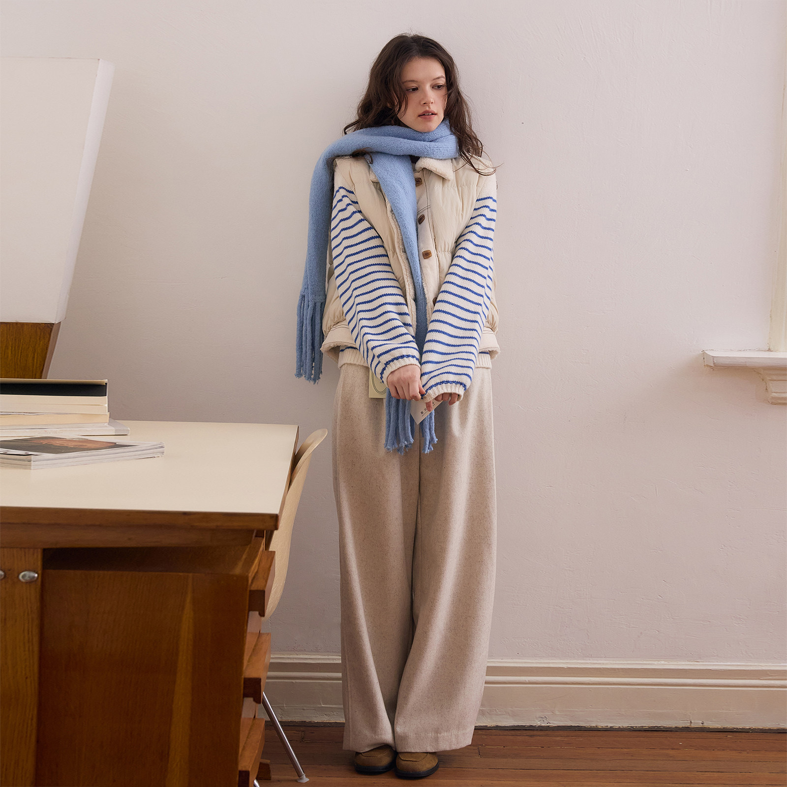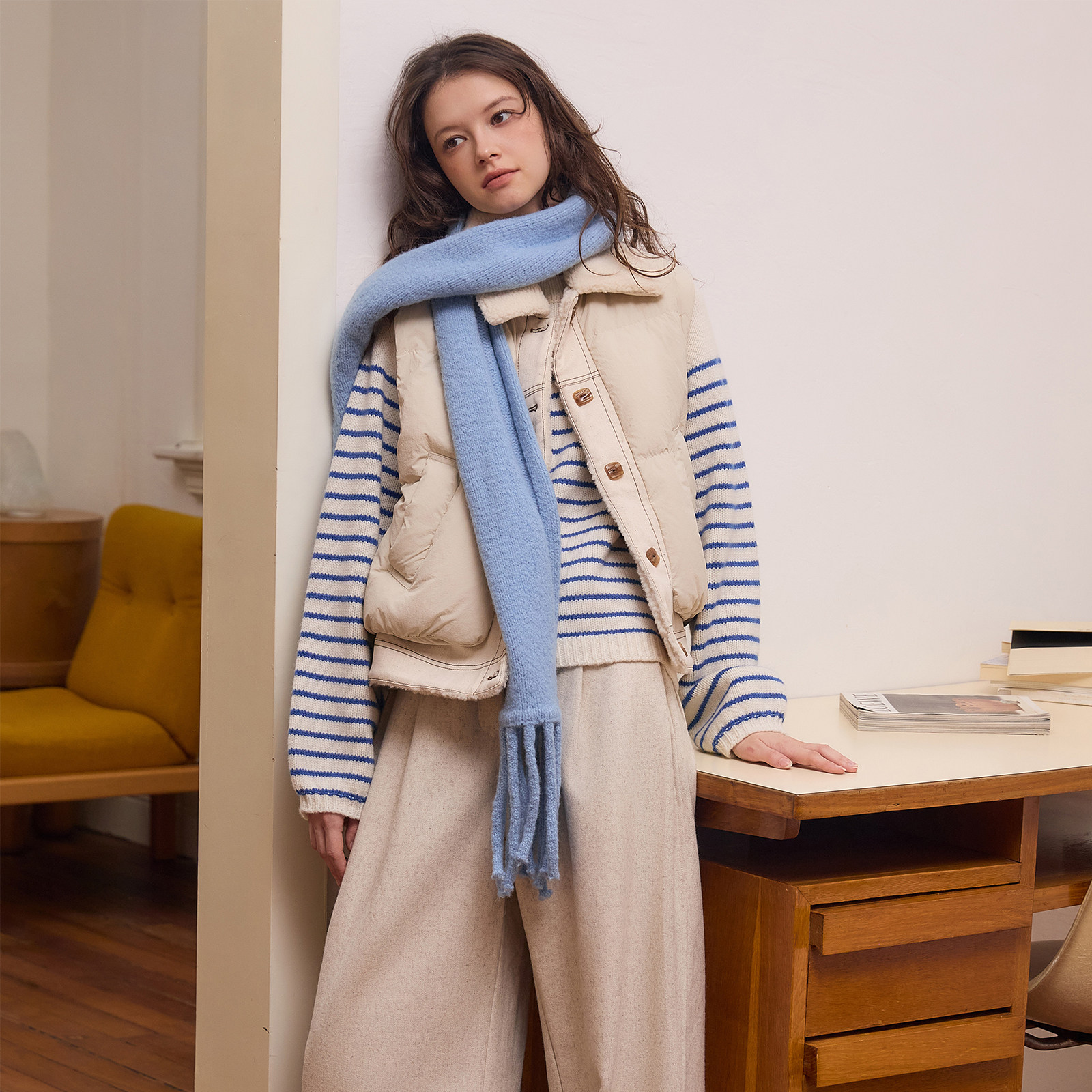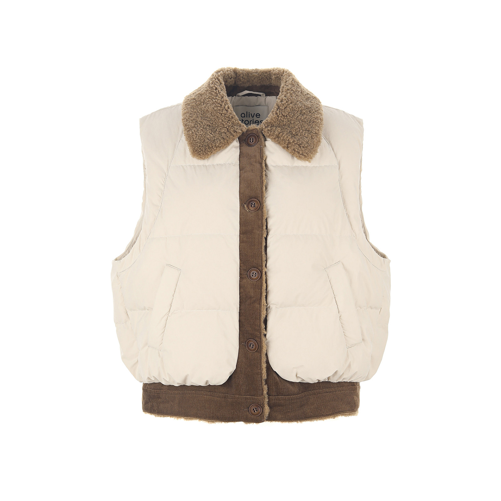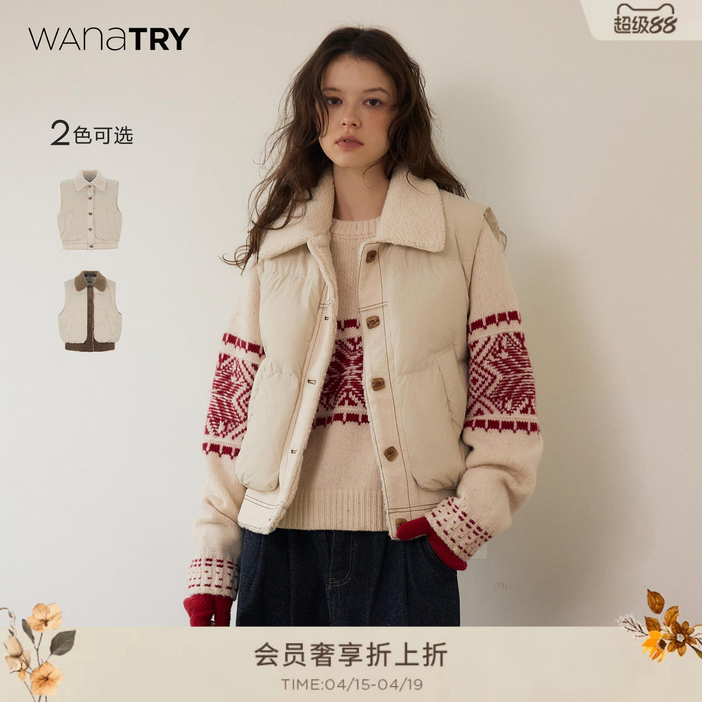 wana try仿毛拼接90绒白鸭绒羽绒马甲秋冬新款翻领女款上衣马夹