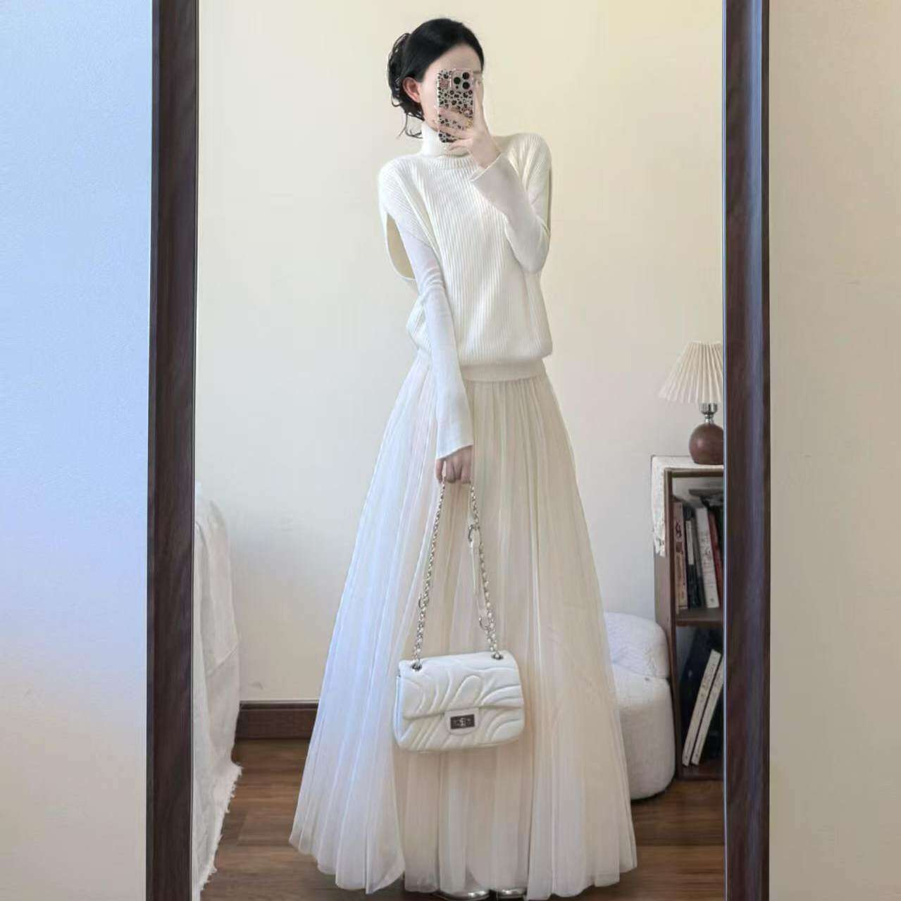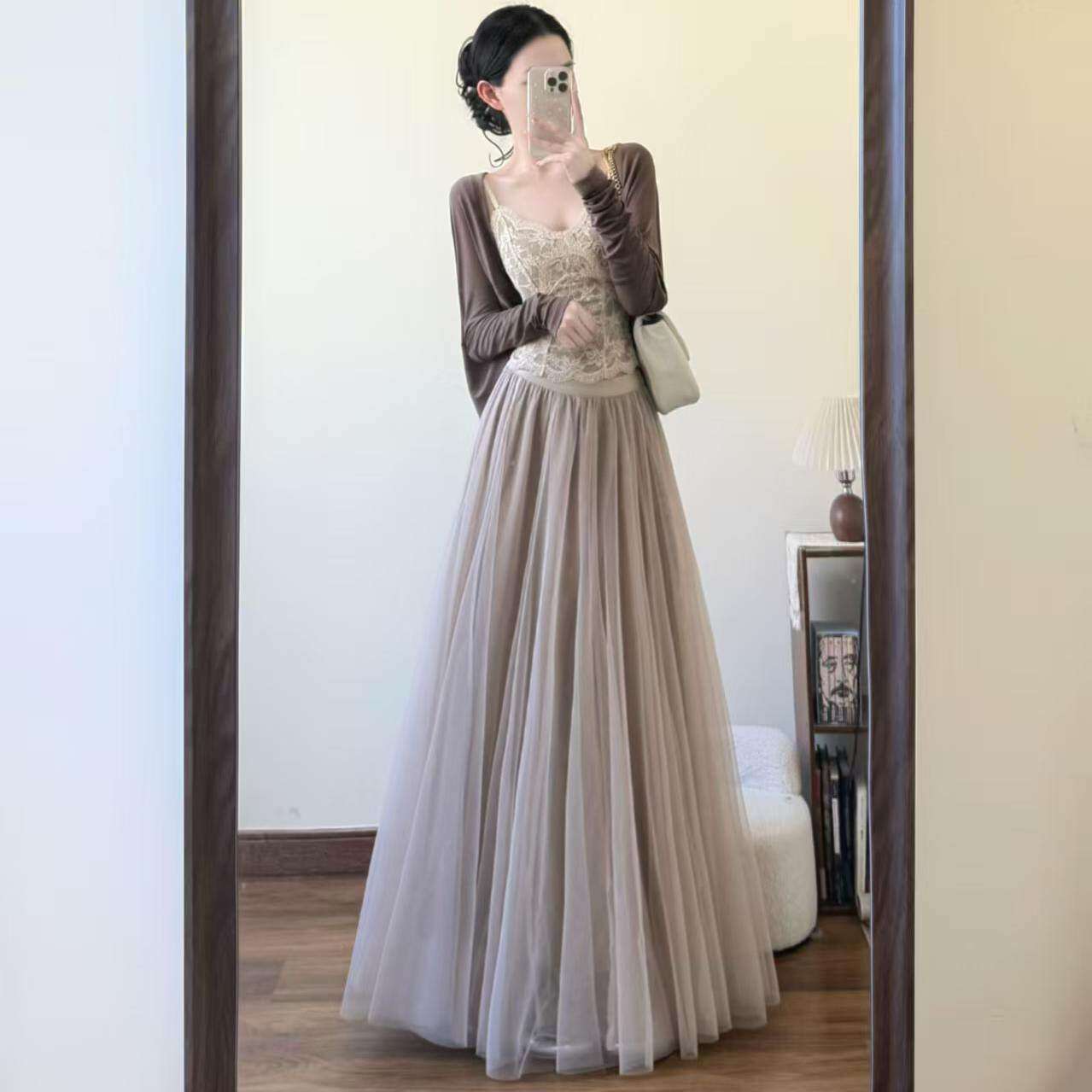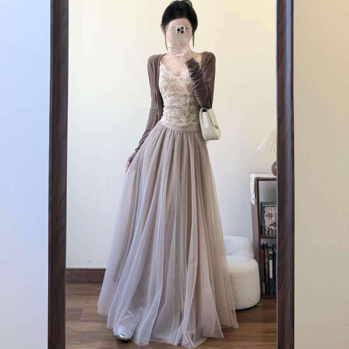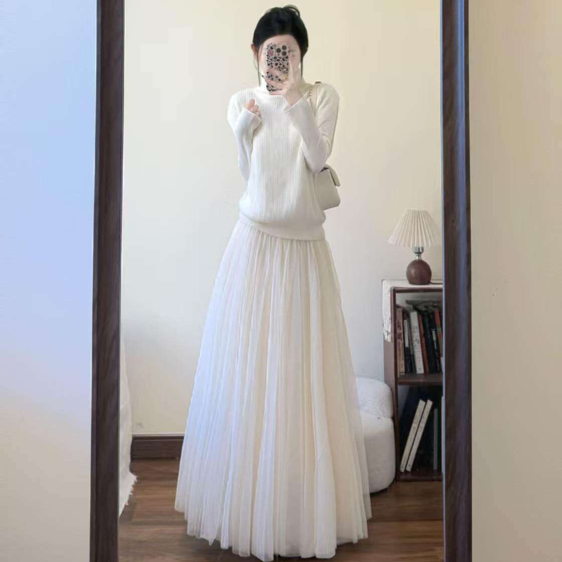2026新款春秋白色a字纱裙高腰中长款网纱半身裙女超仙伞裙垂感