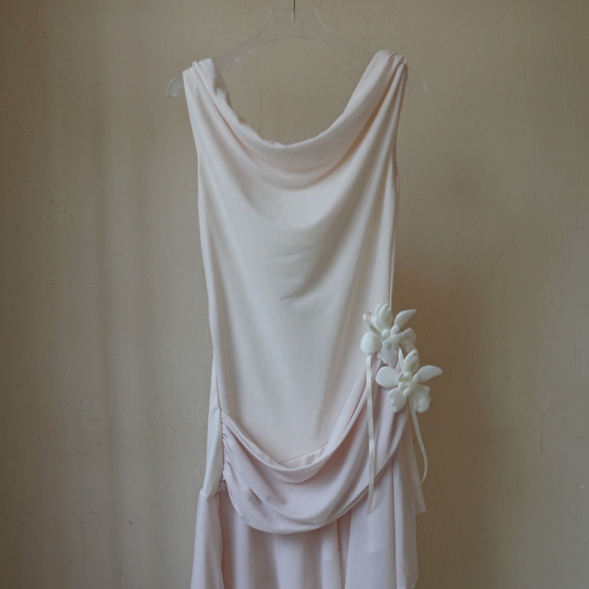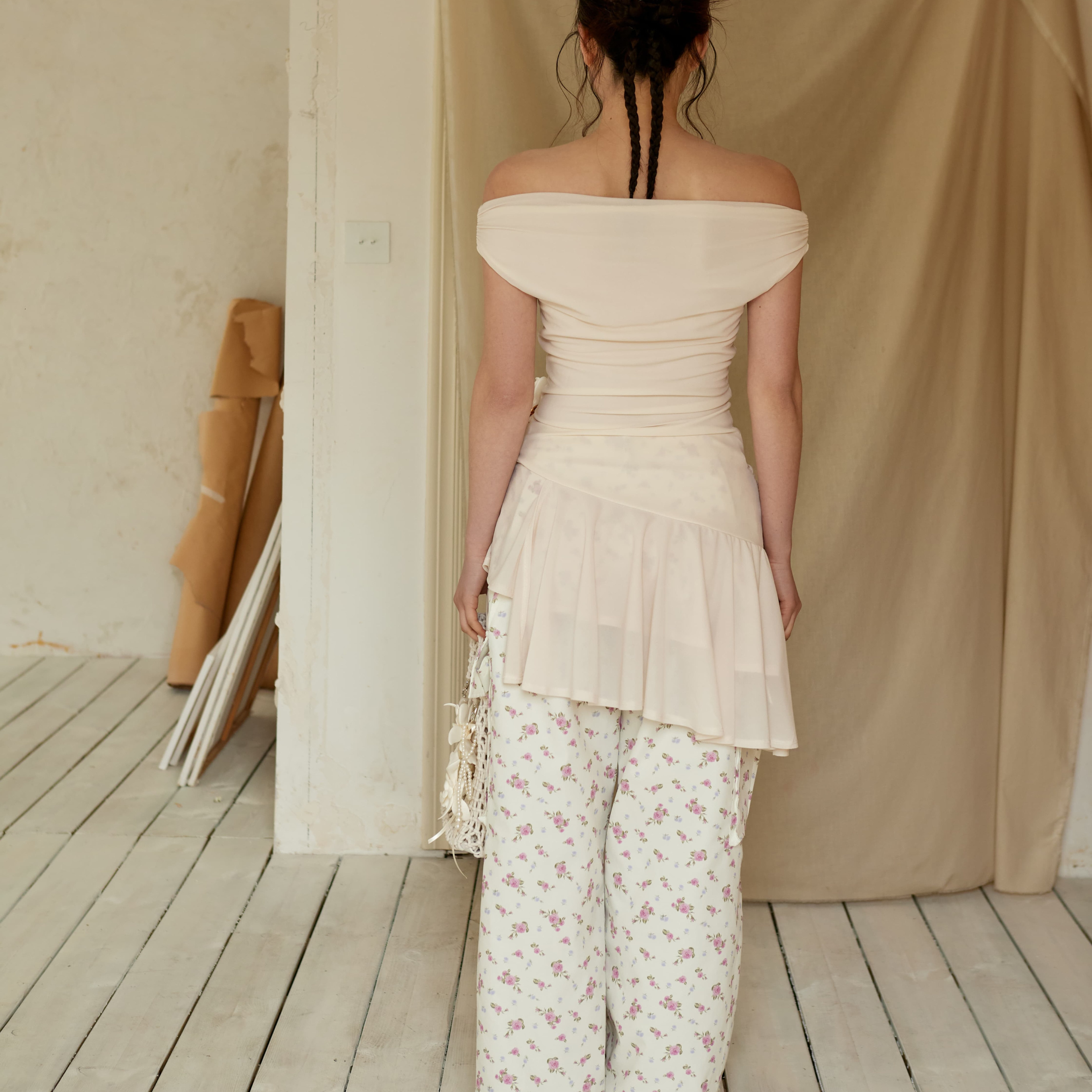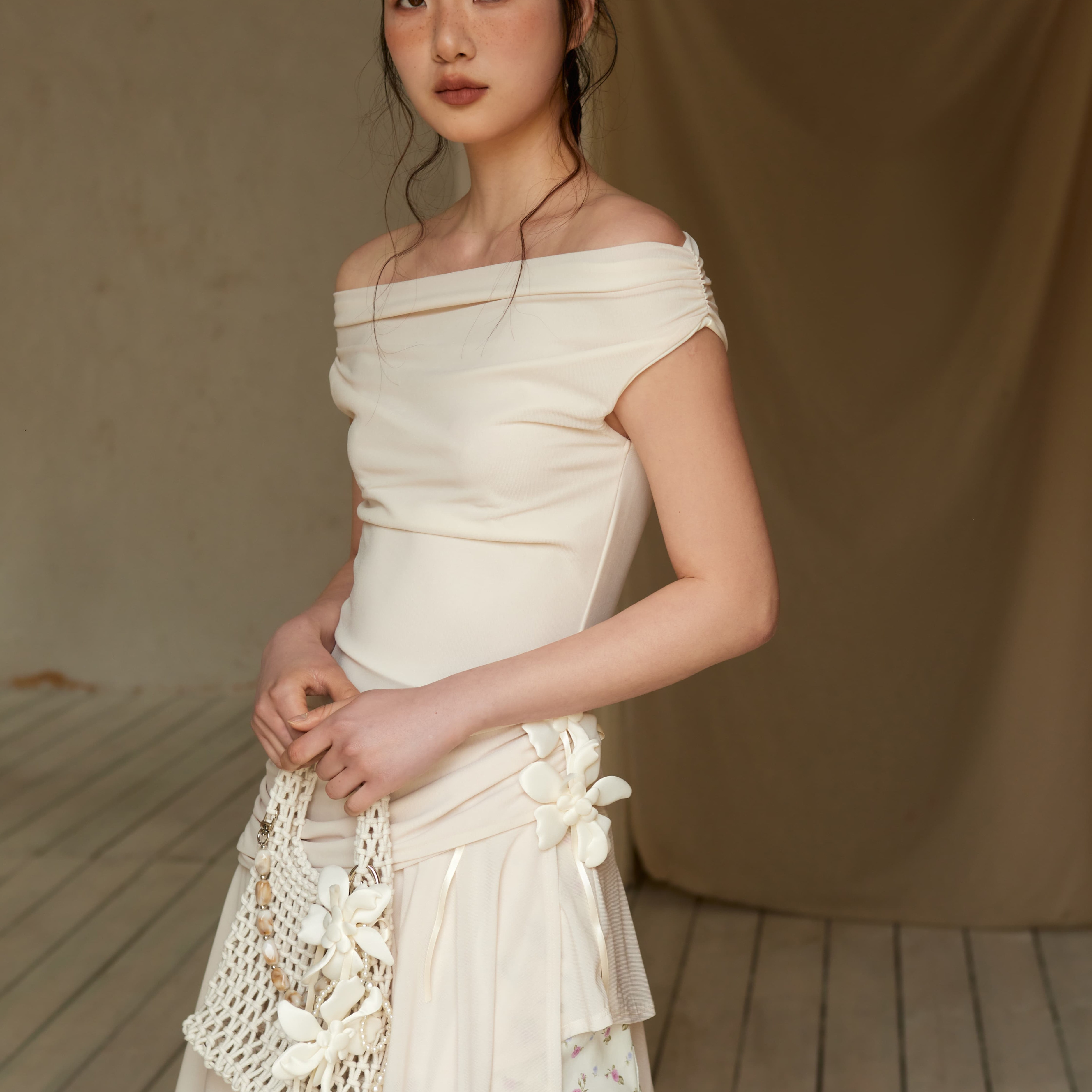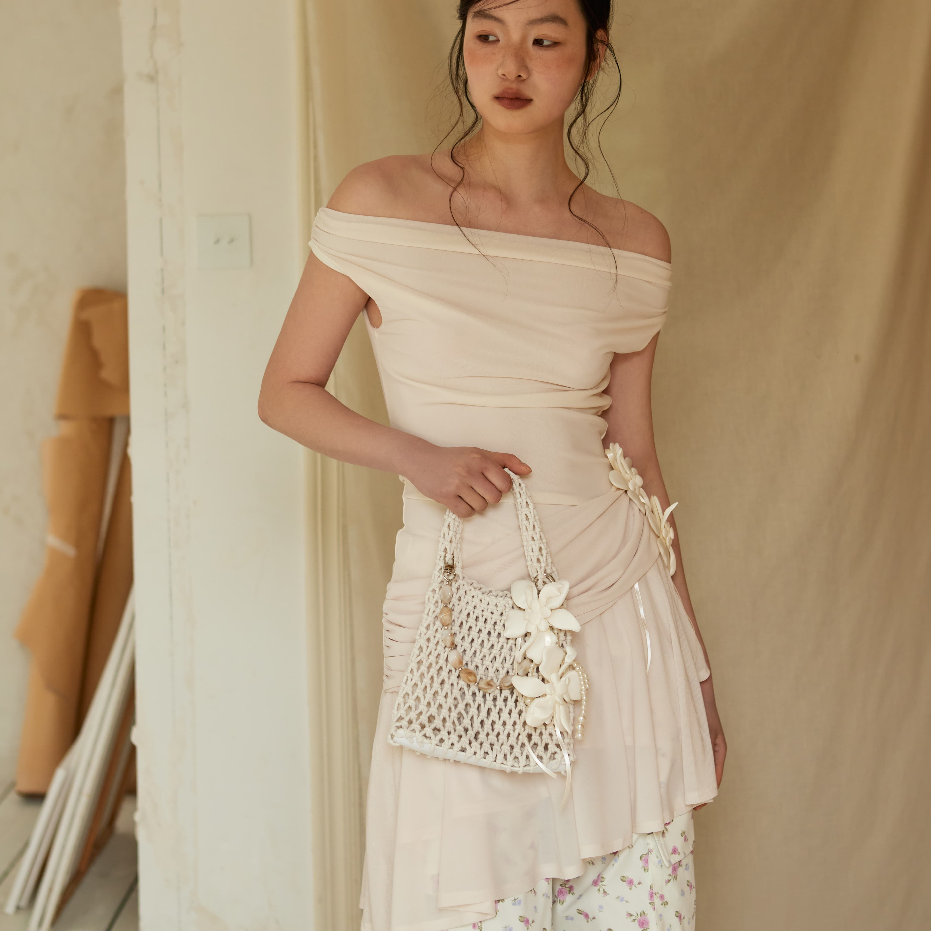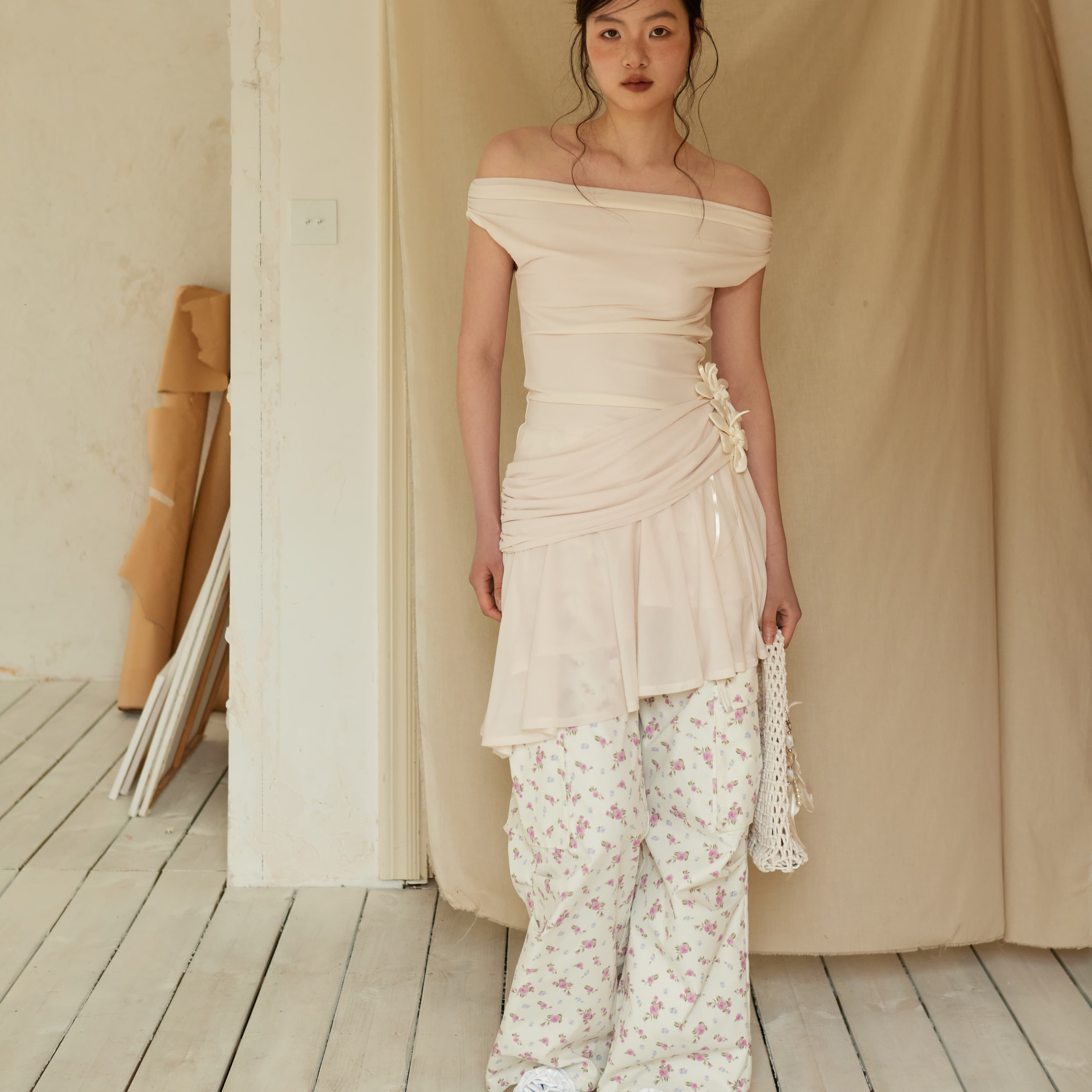 Shiitake 不规则一字领小花装饰短连衣裙碎花工装阔腿裤