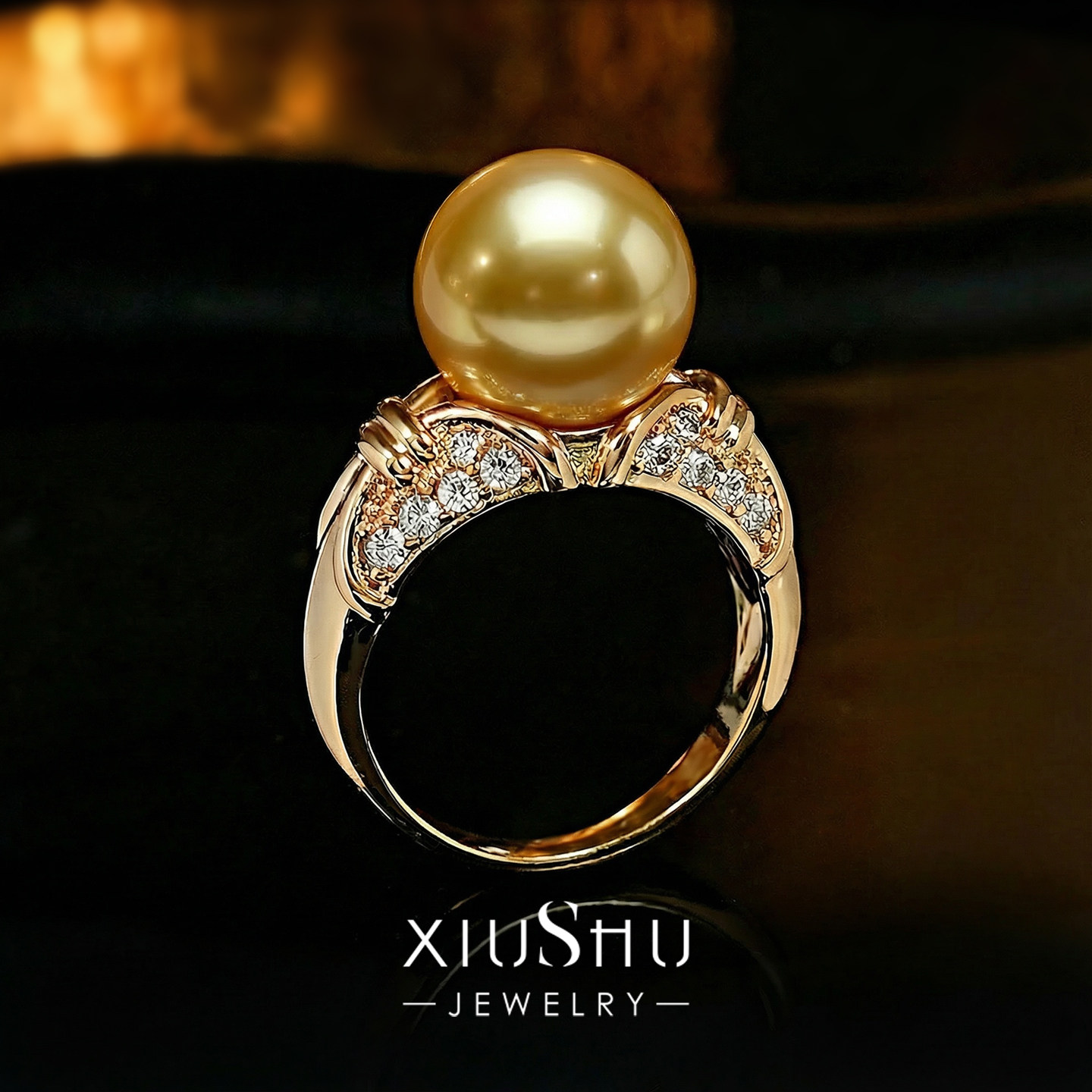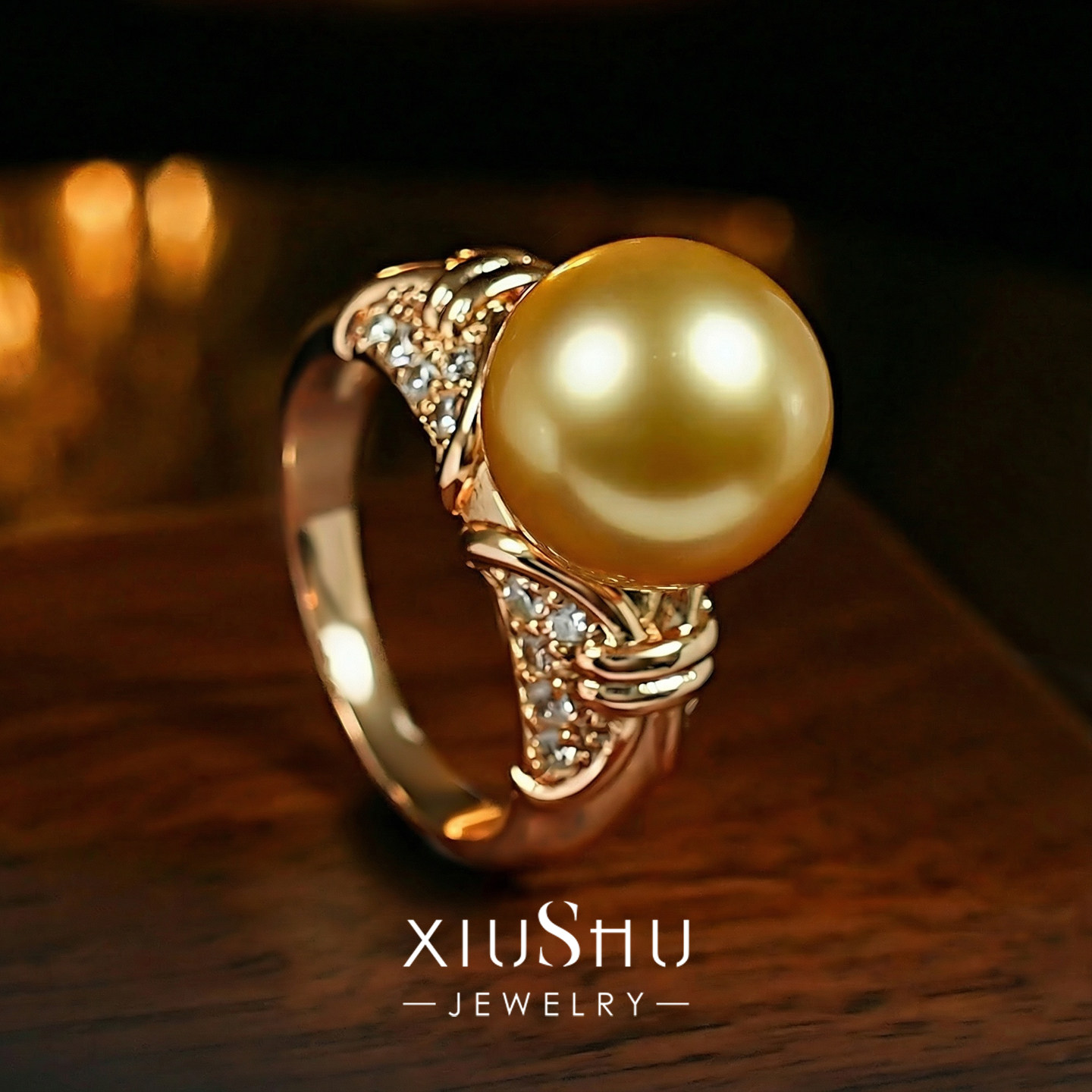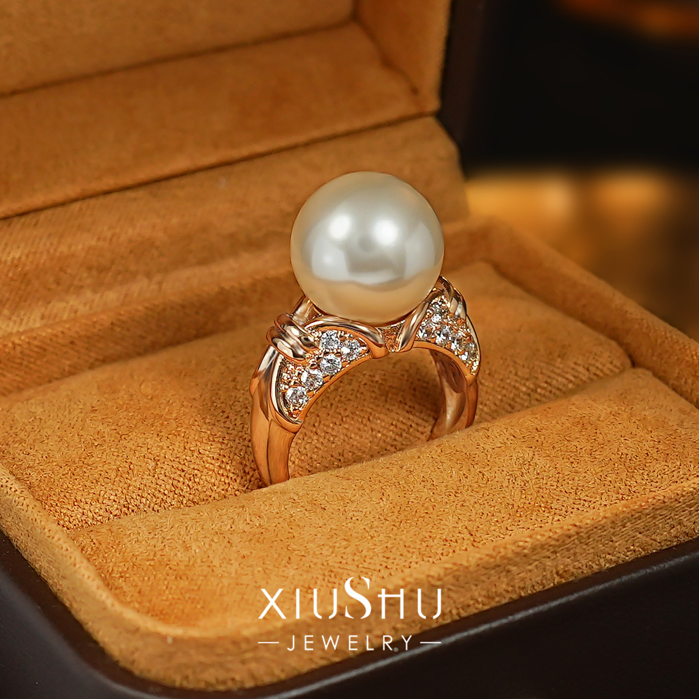 定制款【落日金芒】正圆强光贝母珍珠三色戒指香槟金戒臂温柔轻奢