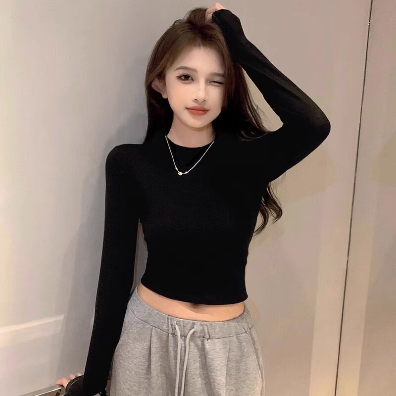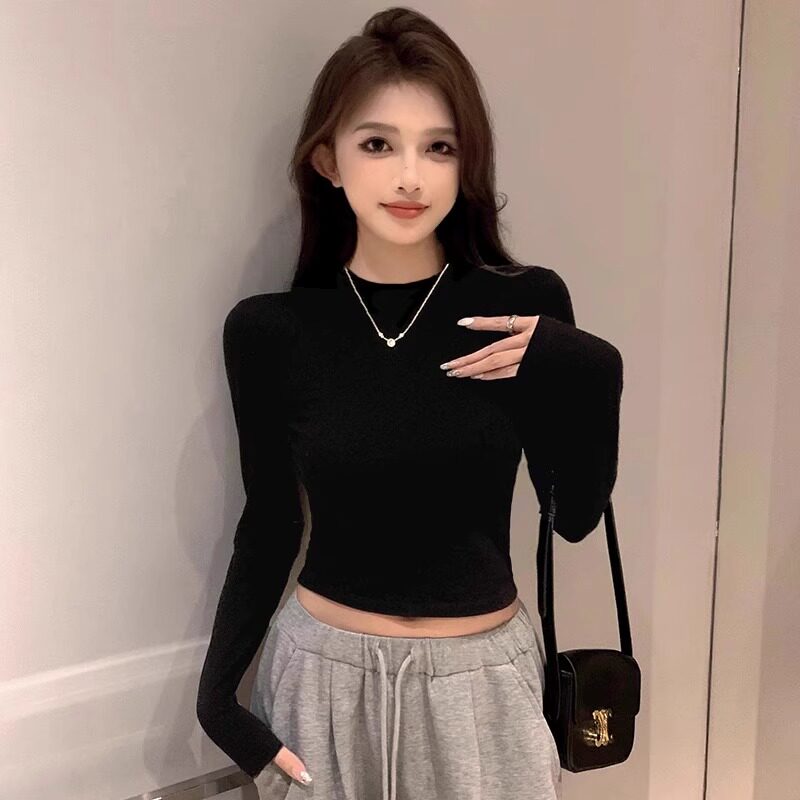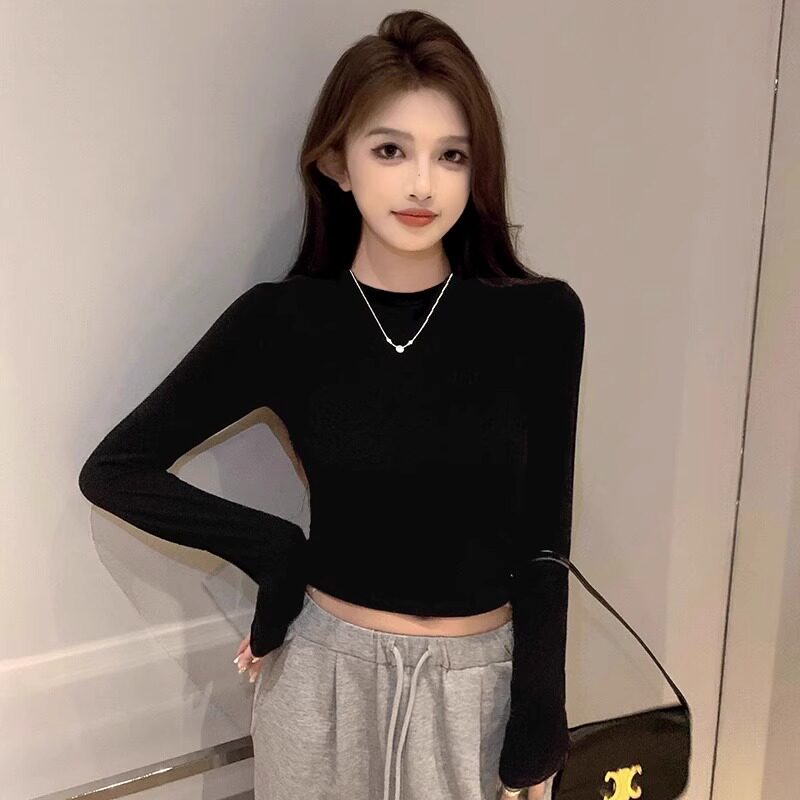 拉夏贝尔黑色纯棉小高领打底衫女春秋冬短款内搭长袖上衣高腰长袖
