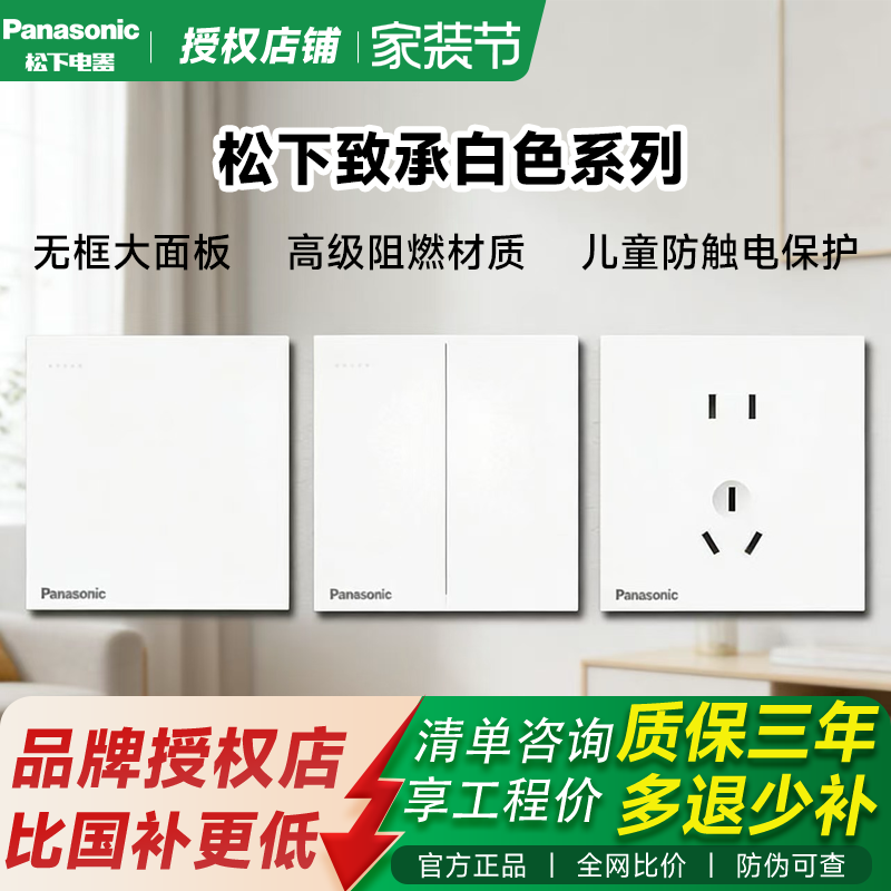松下致承系列白色开关面板家用空调16A插座五孔10A无框大面板暗装