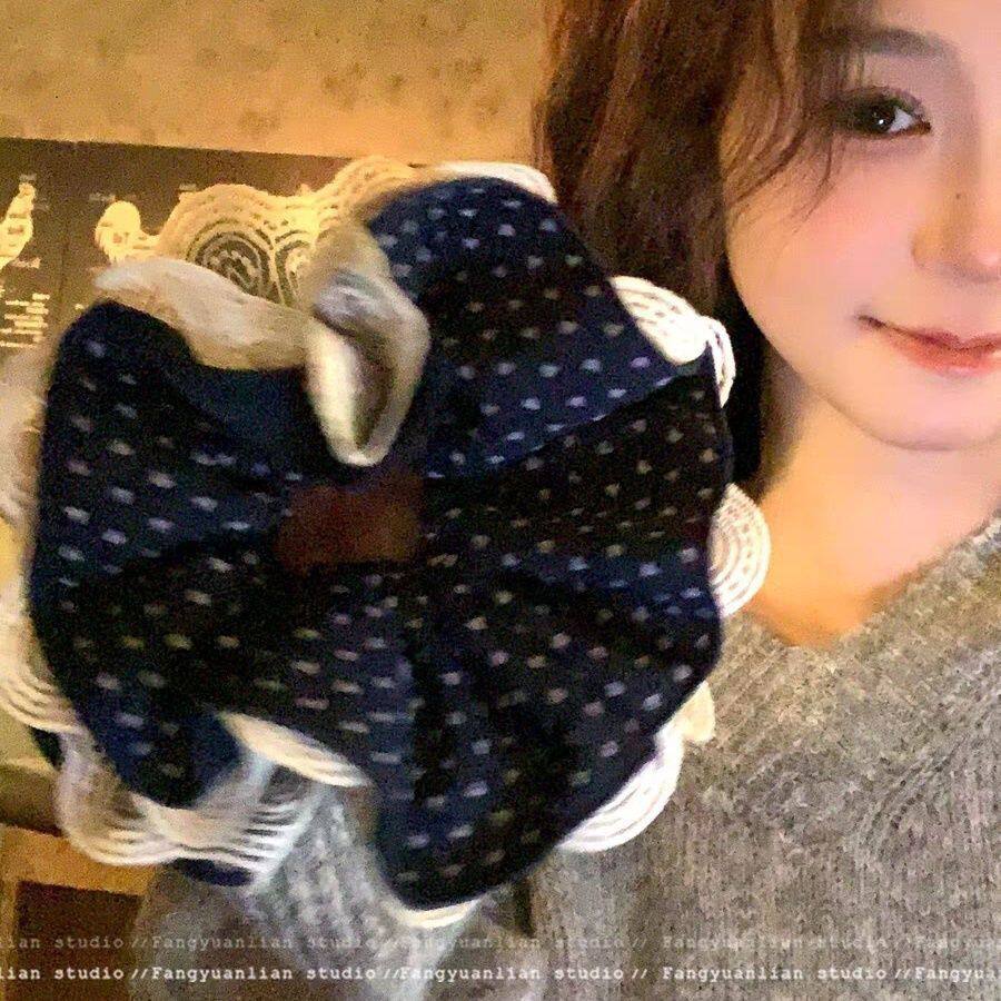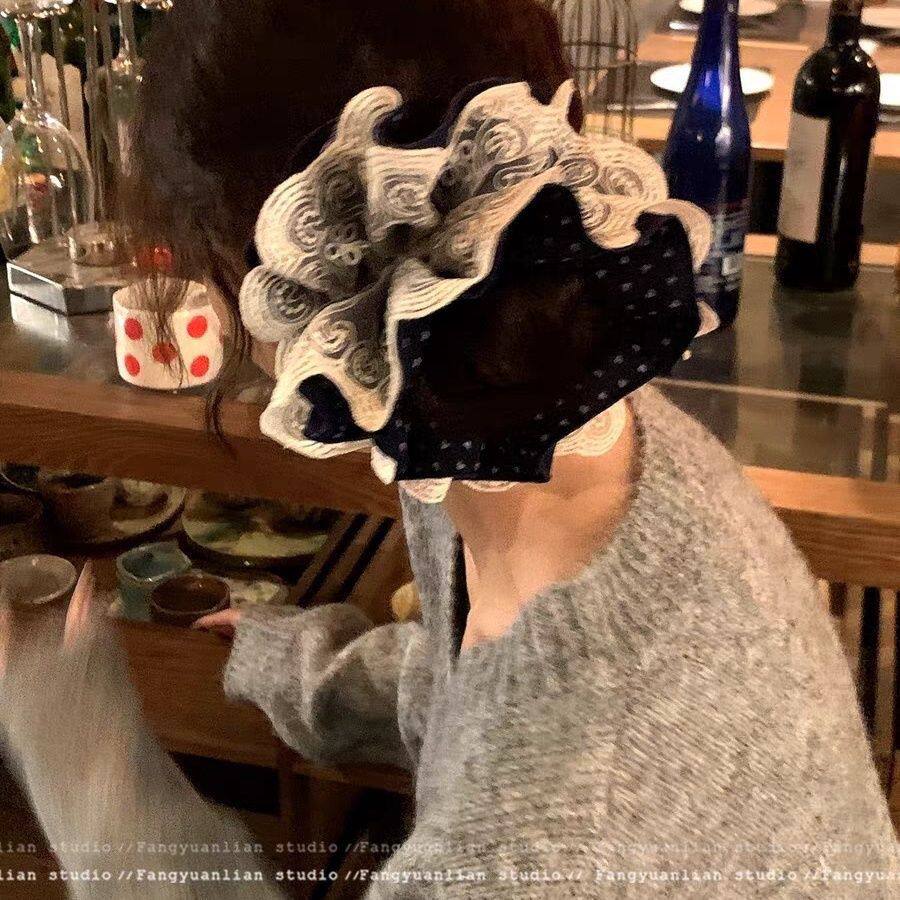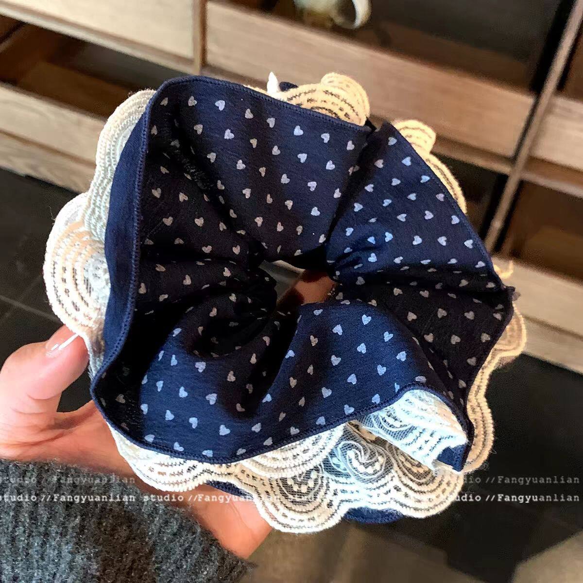 重工韩系蕾丝四层波点藏青色高级大肠发圈头发超大头绳头饰