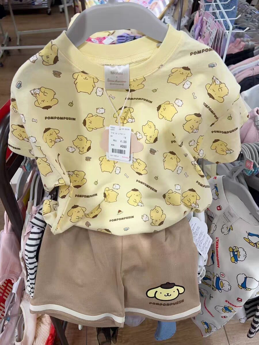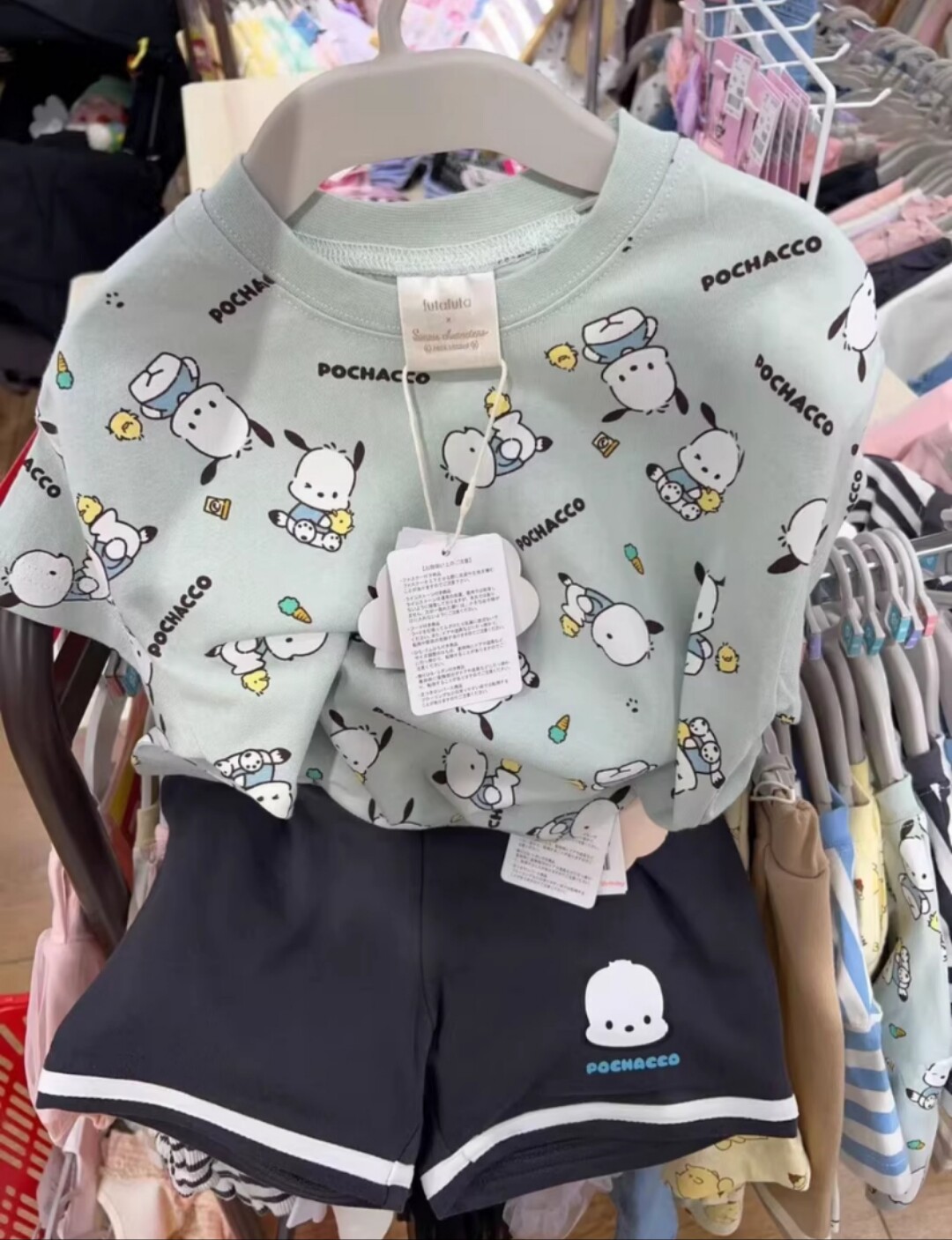 现货日单Futa男女宝纯棉三丽短袖上衣短裤套装帕恰狗布丁狗网红鸭