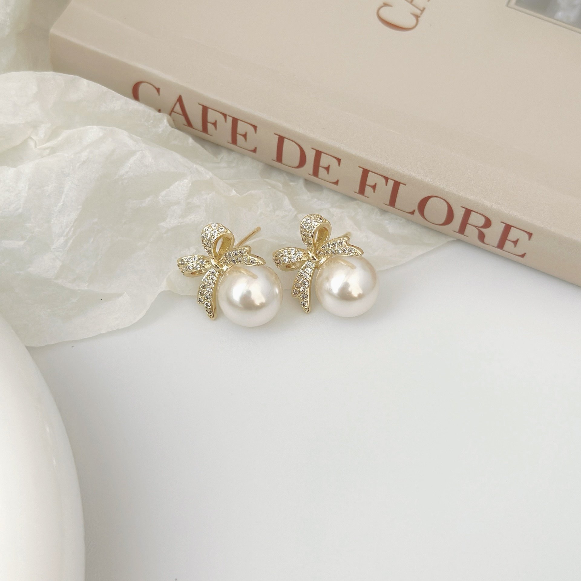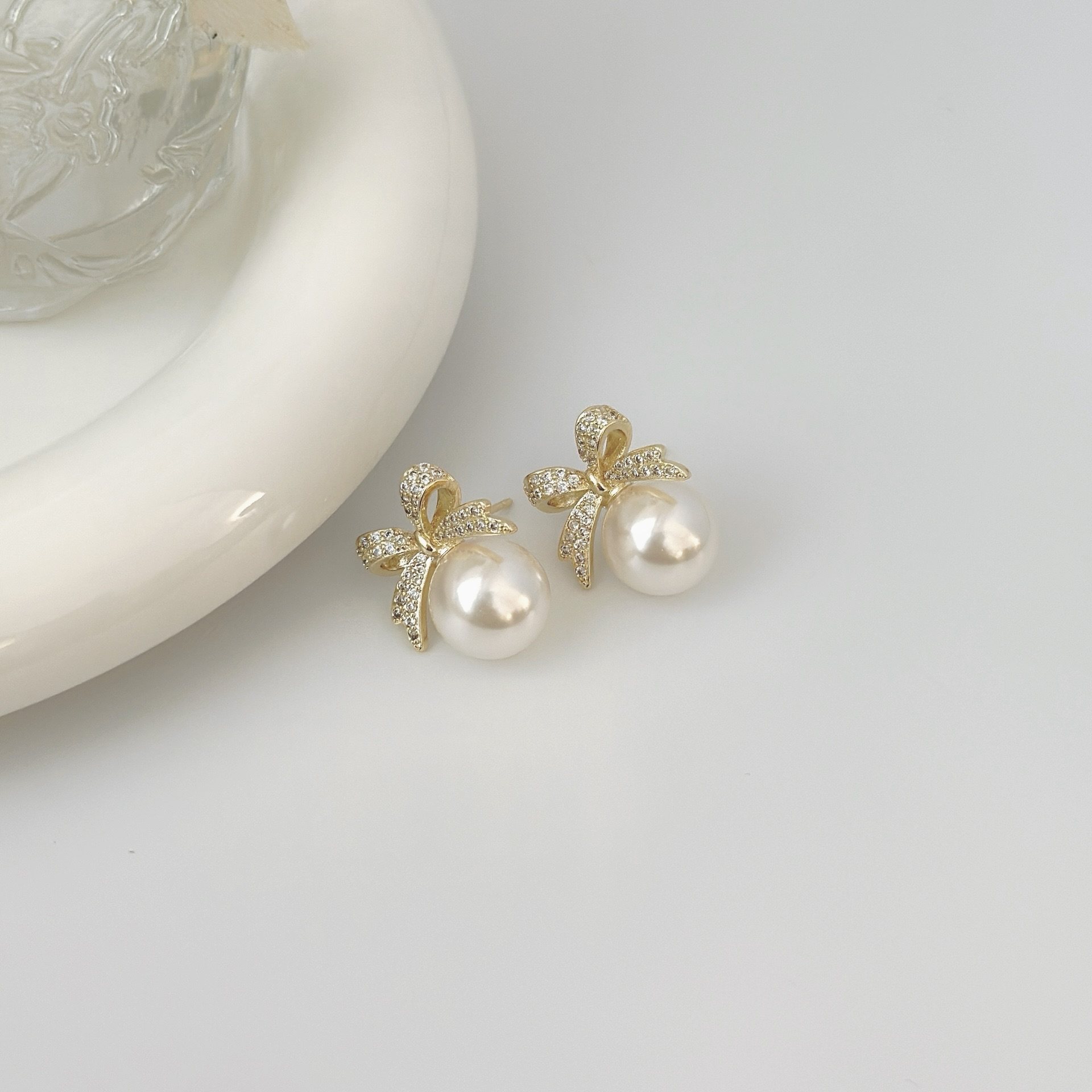 微镶锆石蝴蝶结珍珠耳钉气质轻奢高级感耳环女小众设计百搭耳饰品