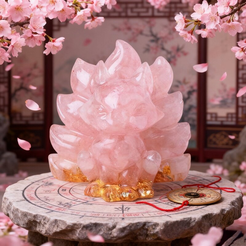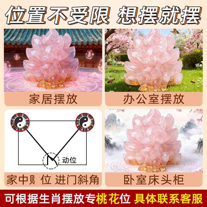 新中式水晶桃花摆件卧室招桃花位国学装饰品九尾狐摆件粉水晶狐狸
