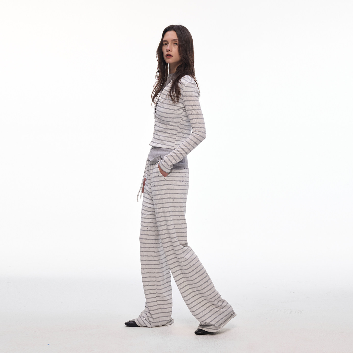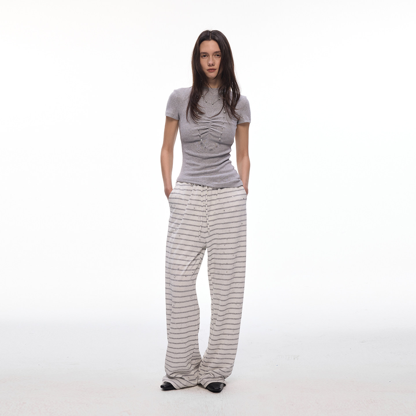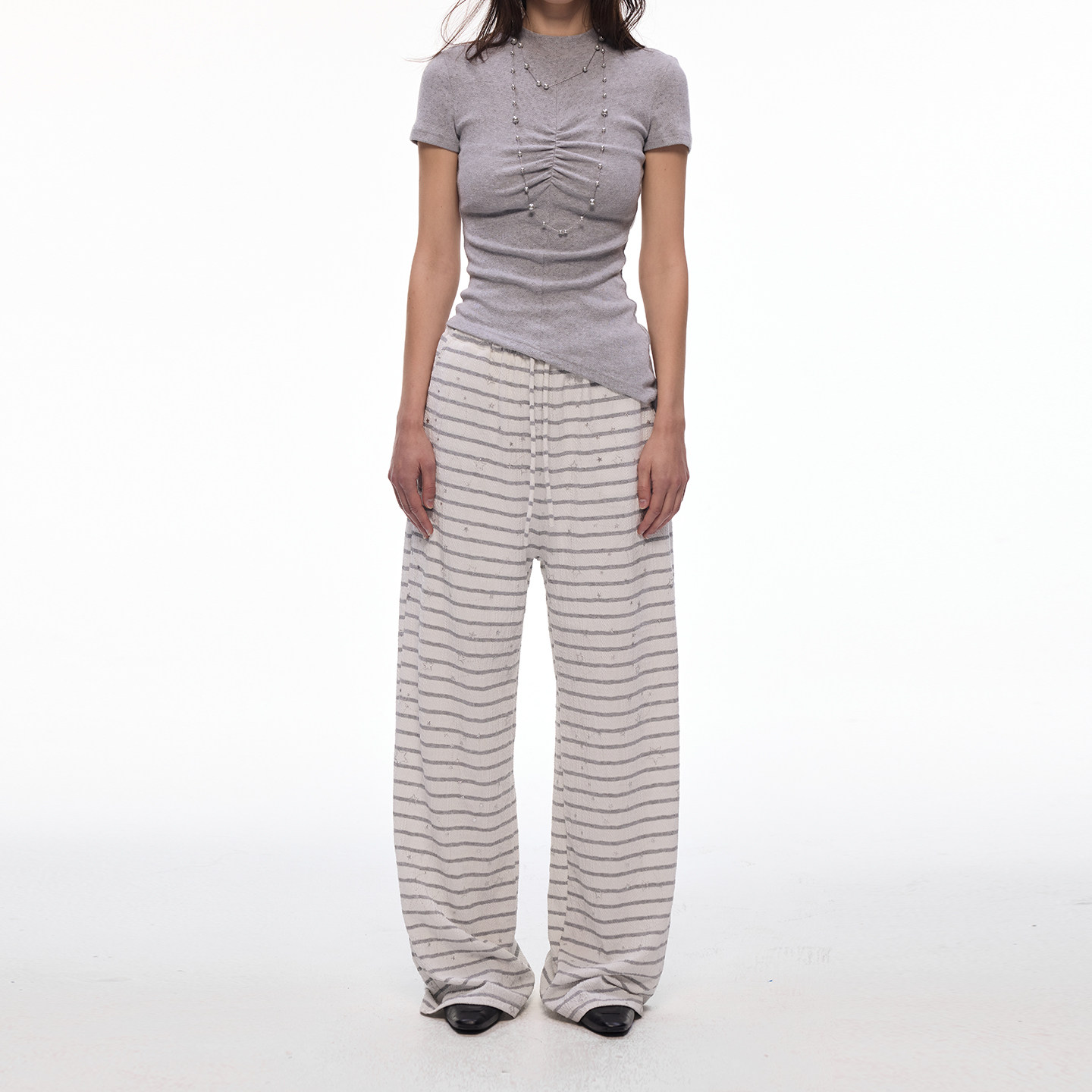 【闪闪星】BiLLconch灰白条纹休闲阔腿裤女松紧腰垂感拖地长裤