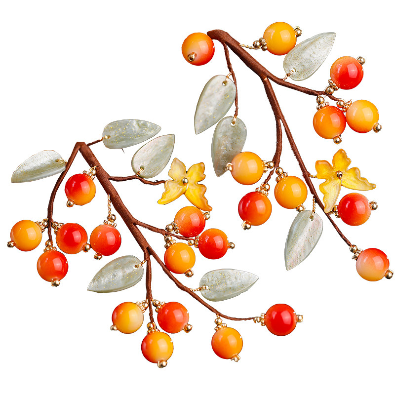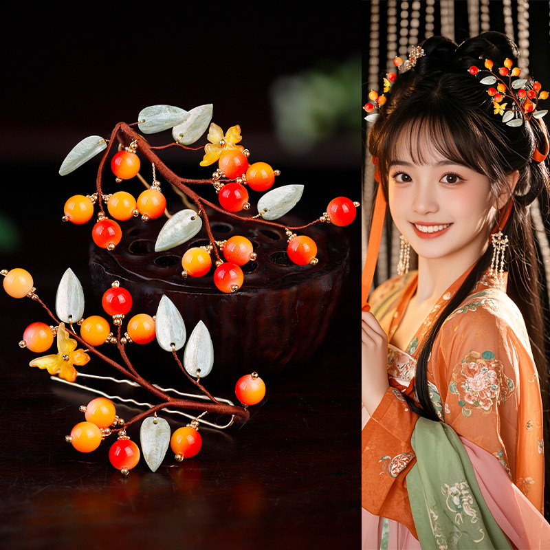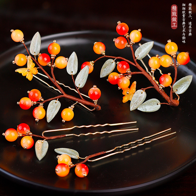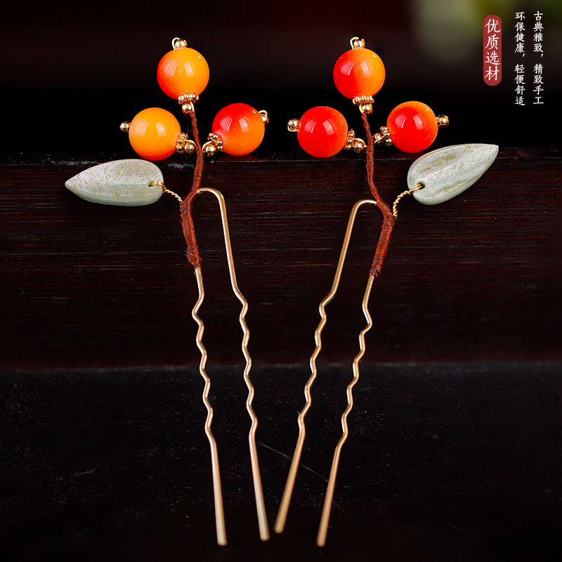 唐风掩鬓点缀U形钗古风发饰汉服头饰红橙色果子发钗旗袍日常配饰