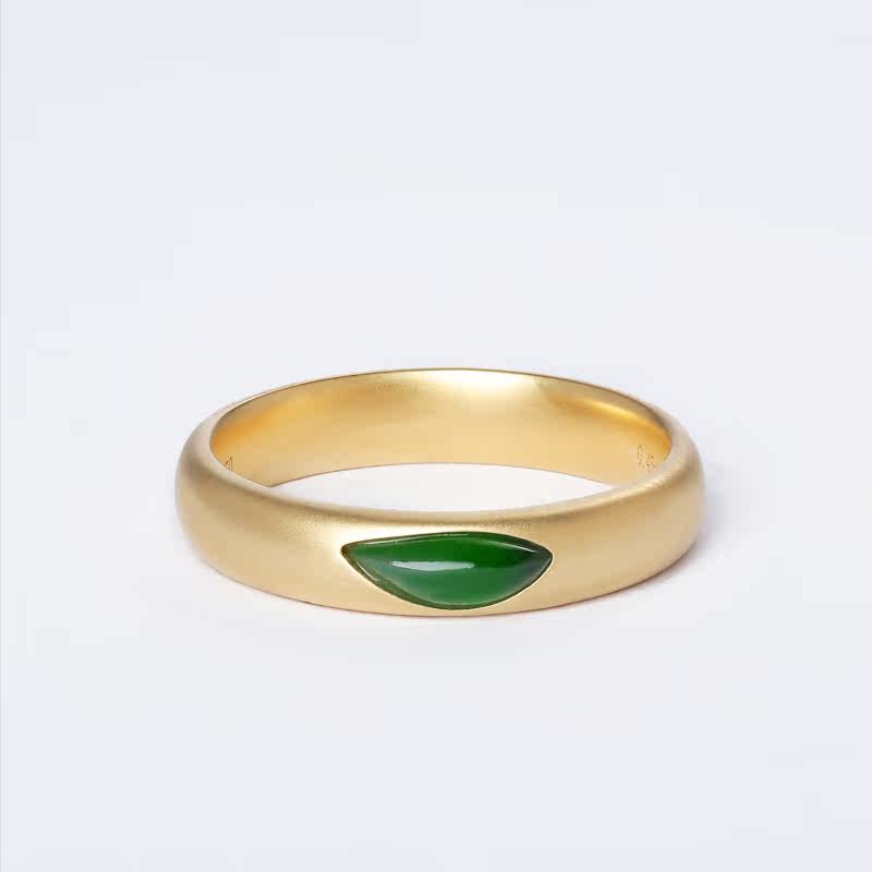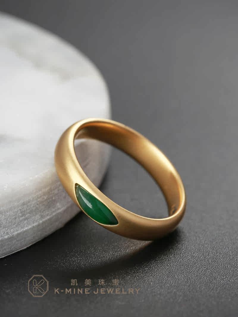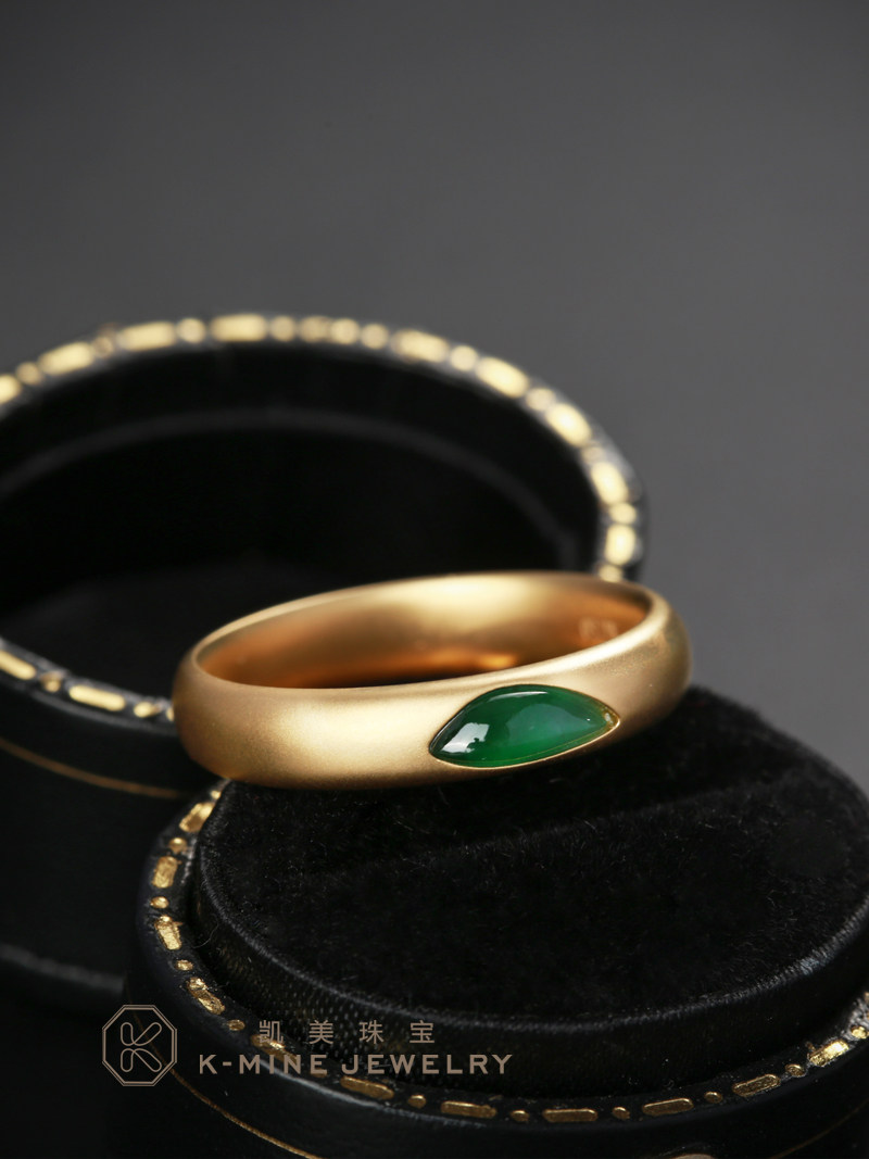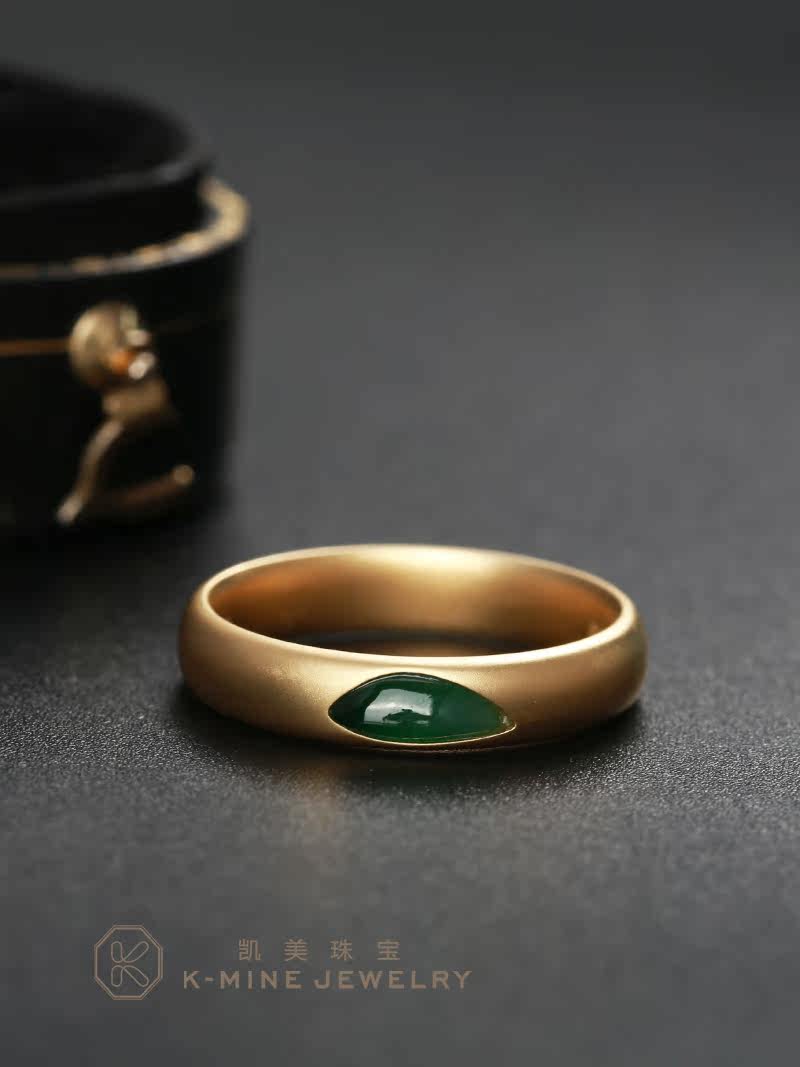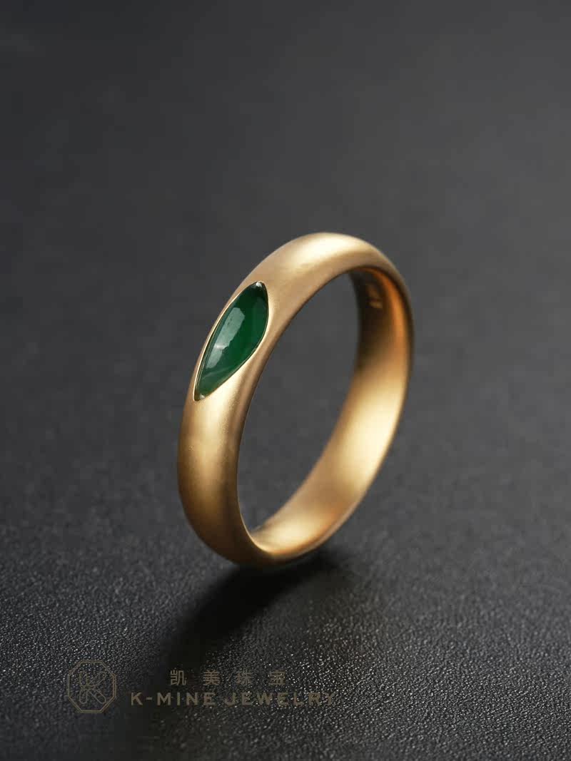 正品纯18k黄金圈戒镶嵌随形缅甸满绿翡翠磨砂面支持定制带证书