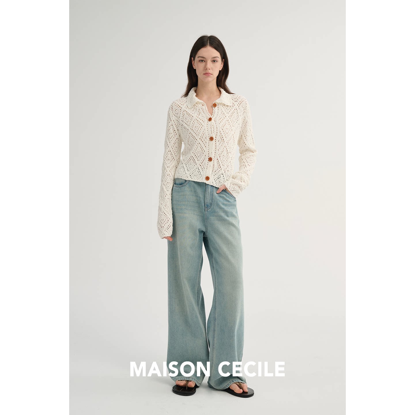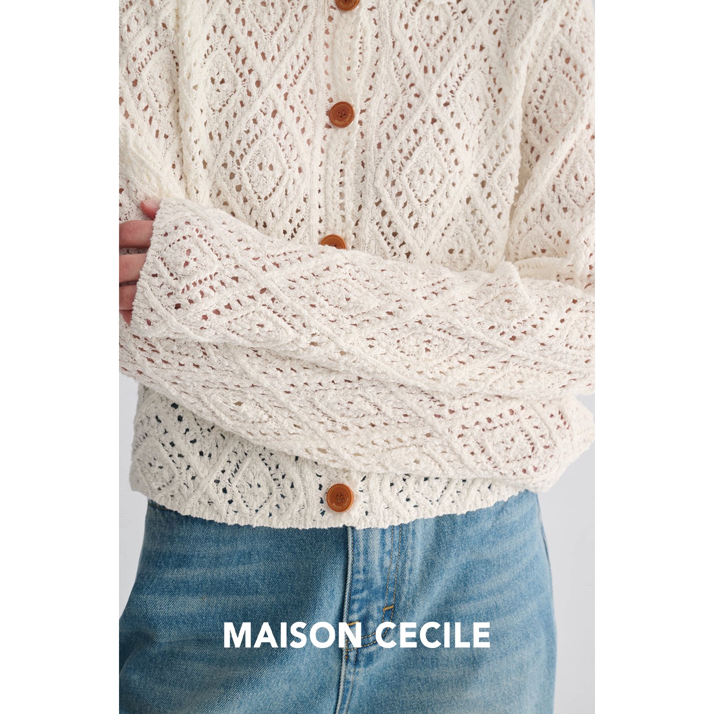 MAISON CECILE 重工镂空钩花翻领显比例针织长袖开衫