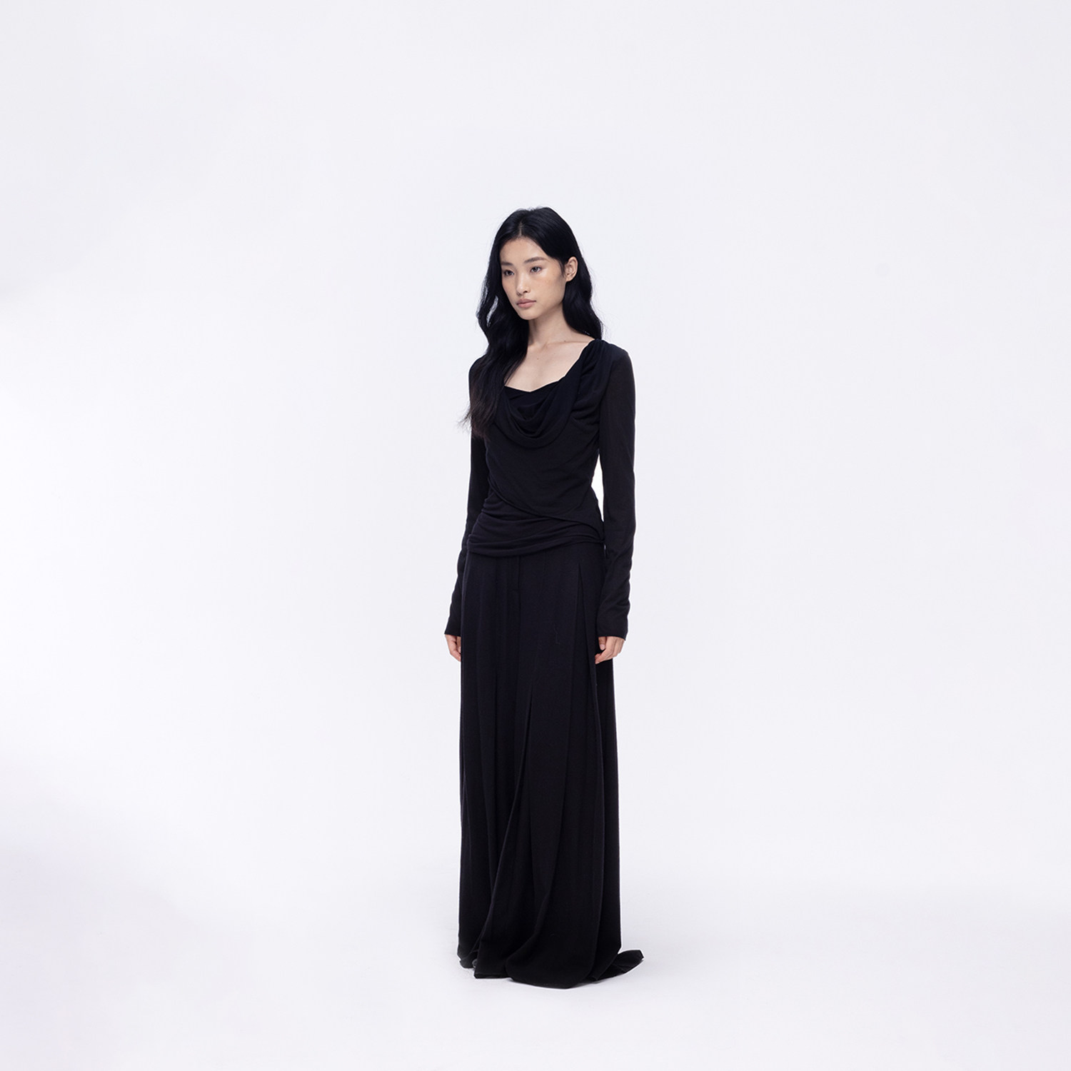 Elywood针织拼蕾丝荡领上衣修身显瘦一字领黑色打底衫气质穿搭女
