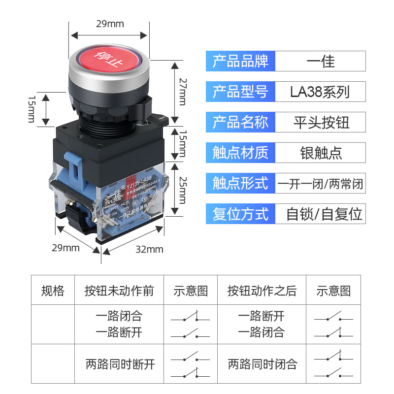 一佳按钮开关自复位LA38-11BN一开一闭电源自锁启动点控按钮22mm