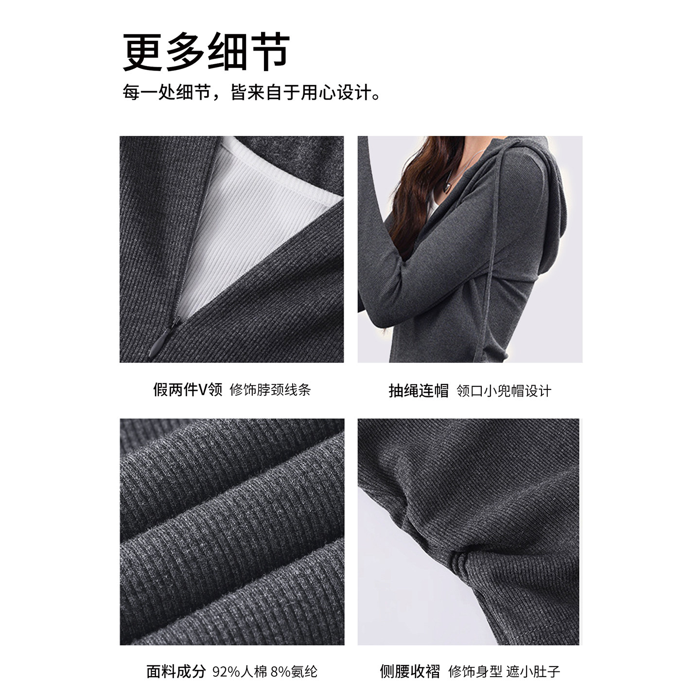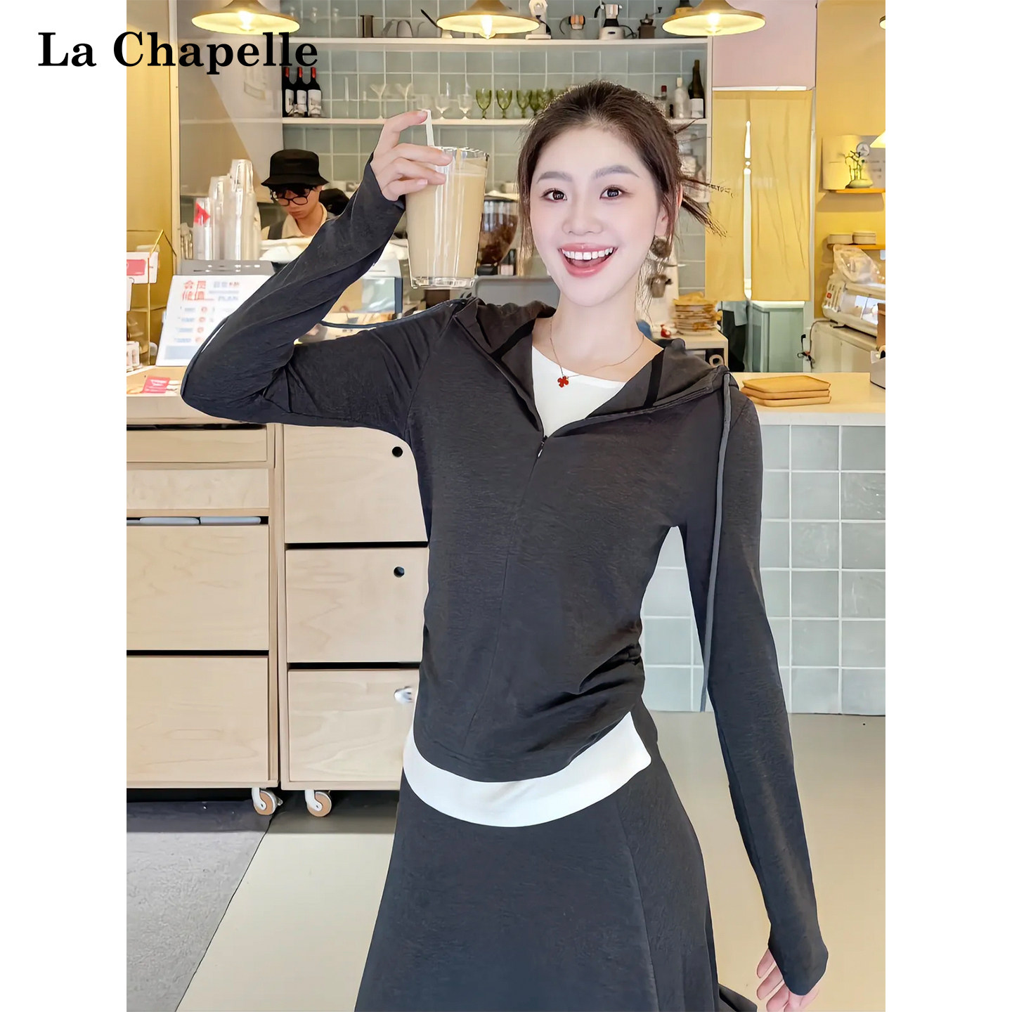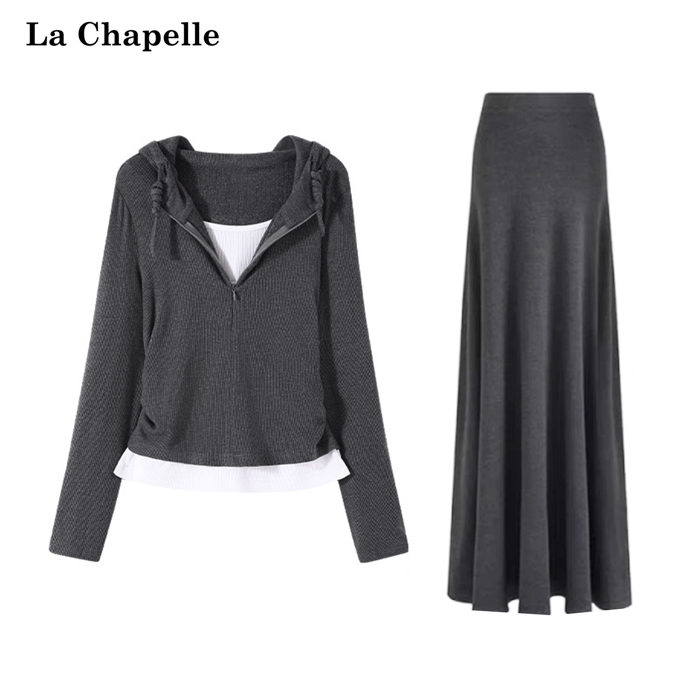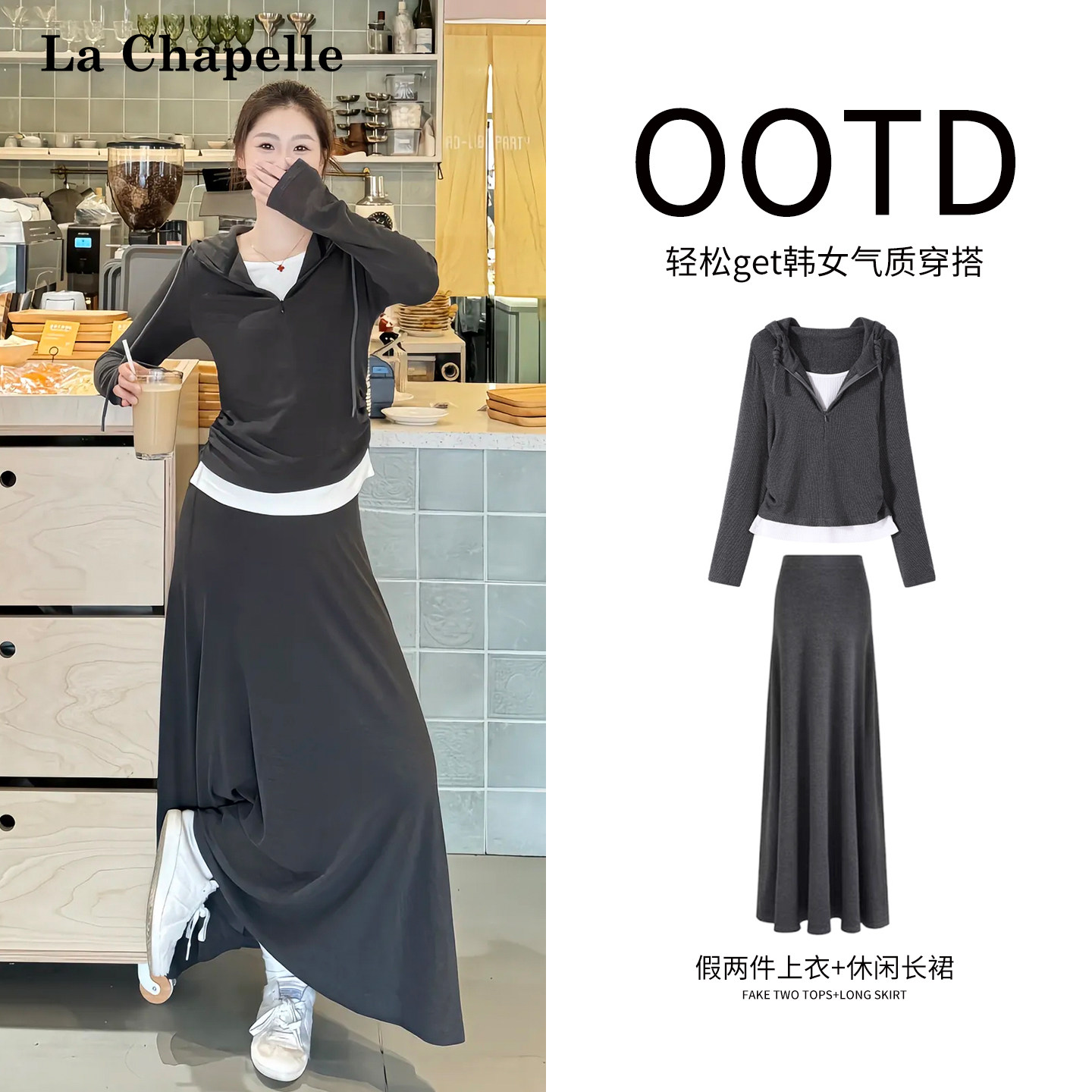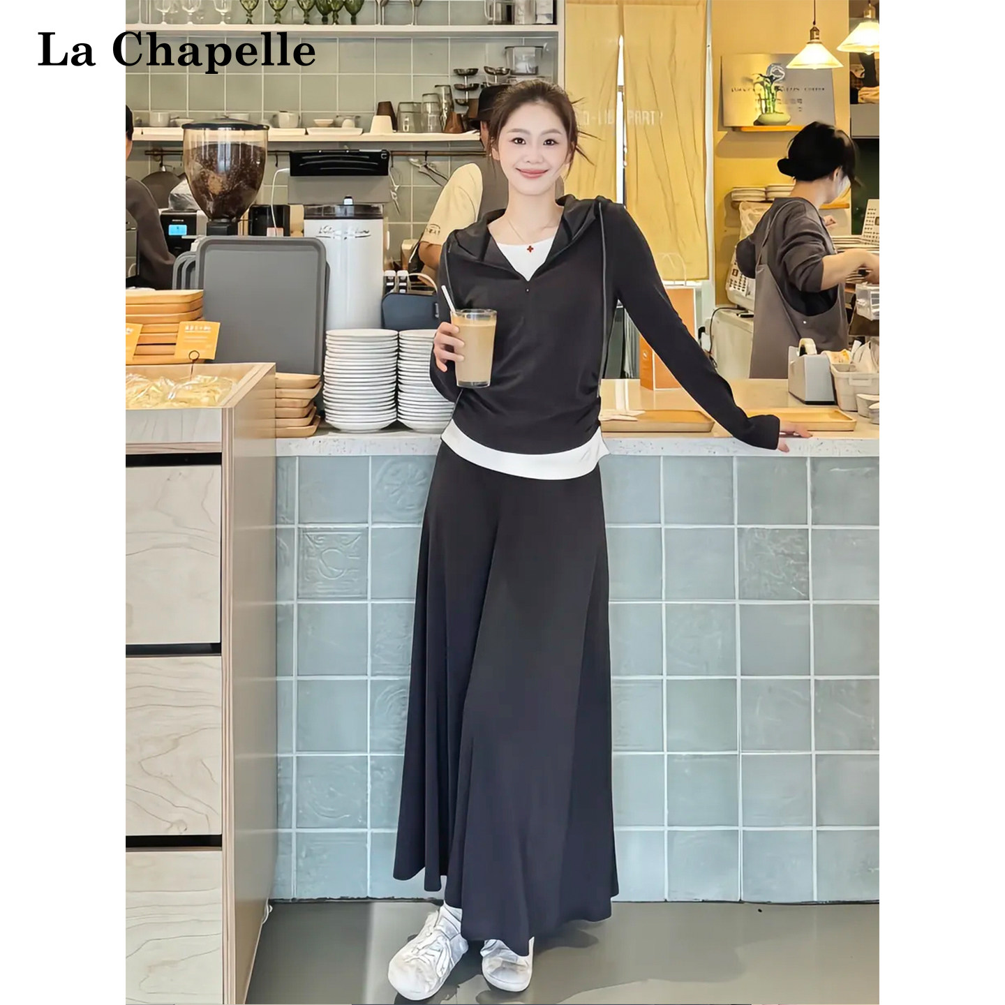 拉夏贝尔假两件长袖卫衣阔腿裤套装女秋季气质修身上衣半裙两件套