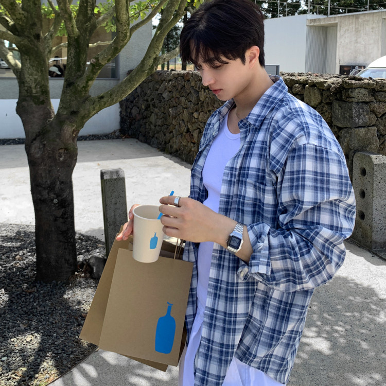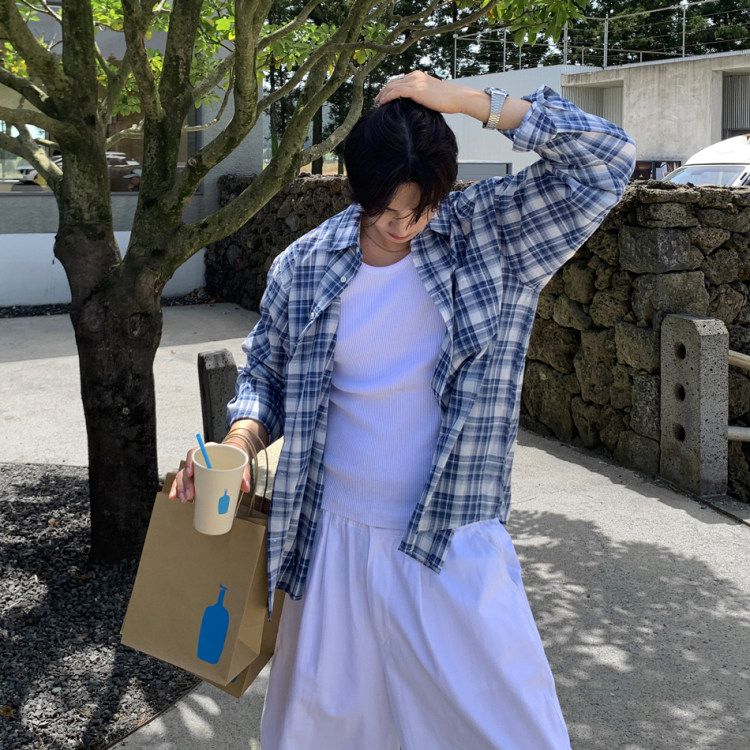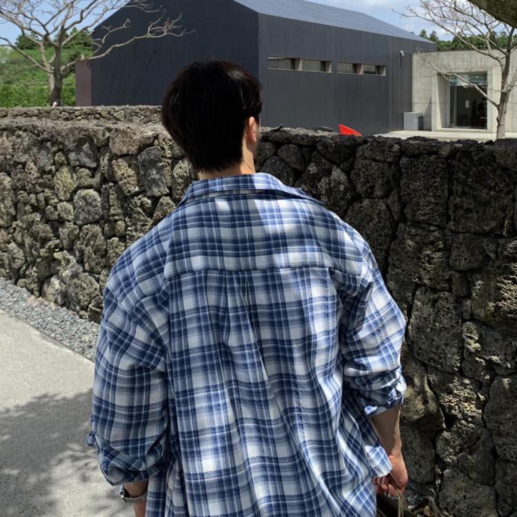 ANAN韩国东大门代购春夏高品时尚轻柔慵懒风复古格子长袖衬衫男