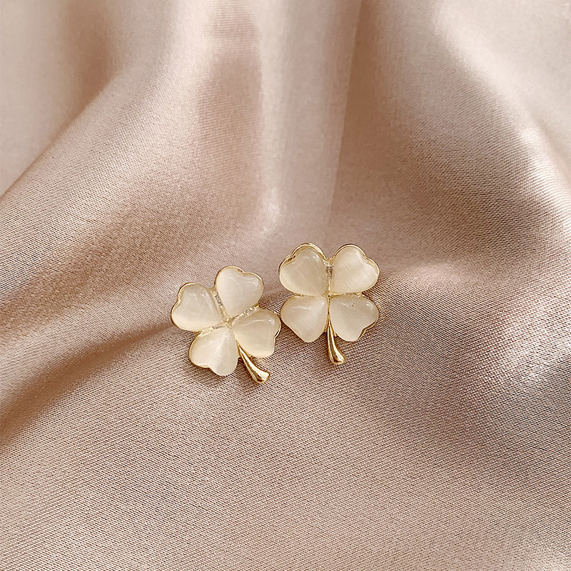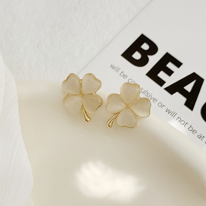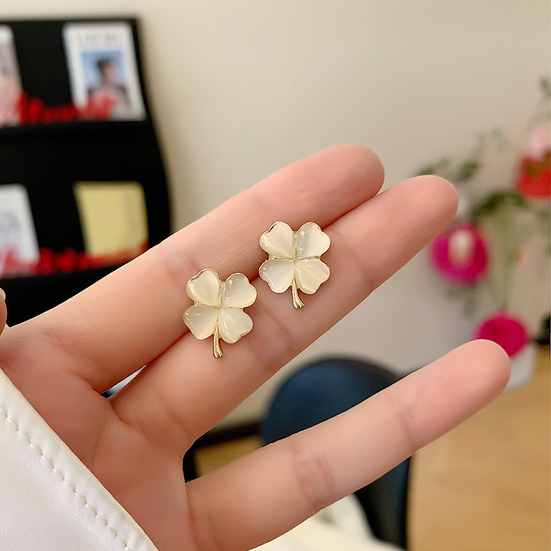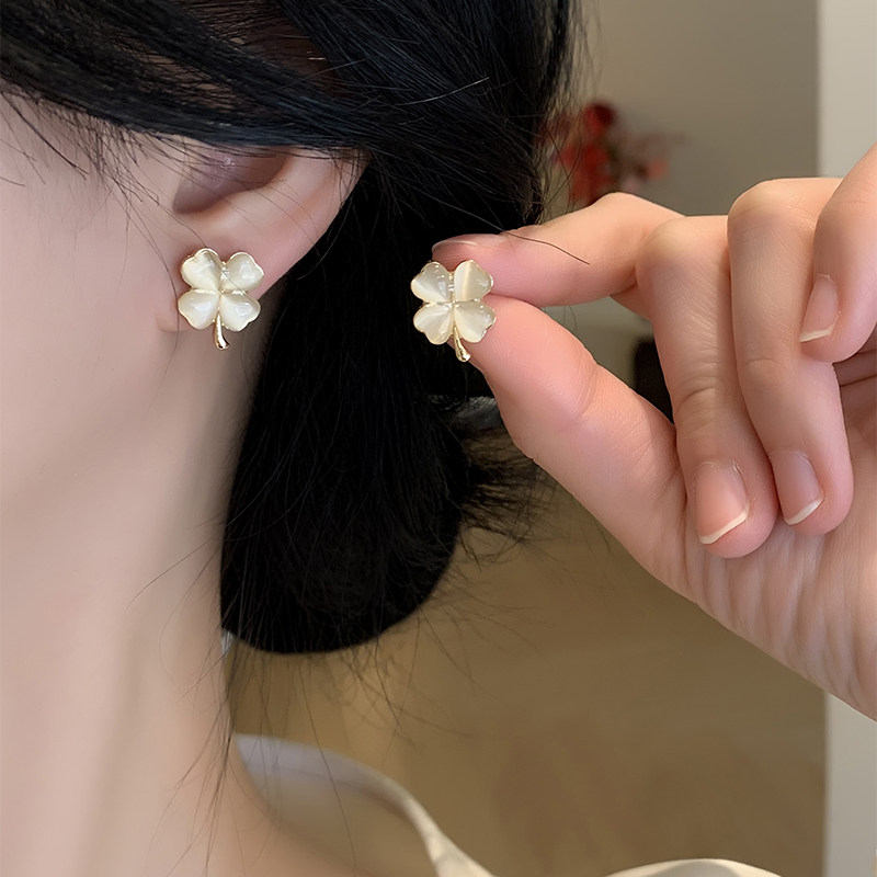 四叶草轻奢耳环精致气质小众耳钉猫眼石高级幸运草耳饰无耳洞耳夹
