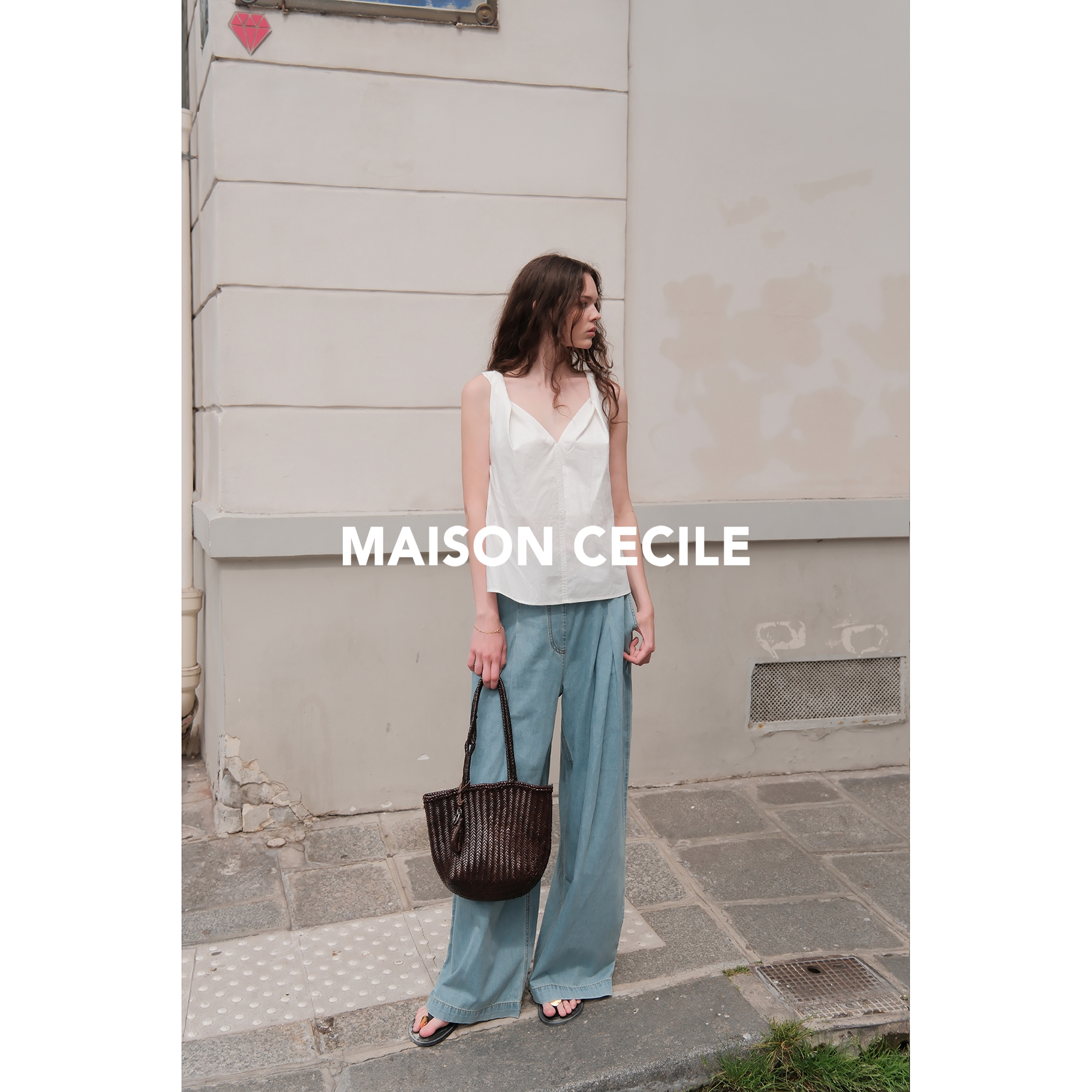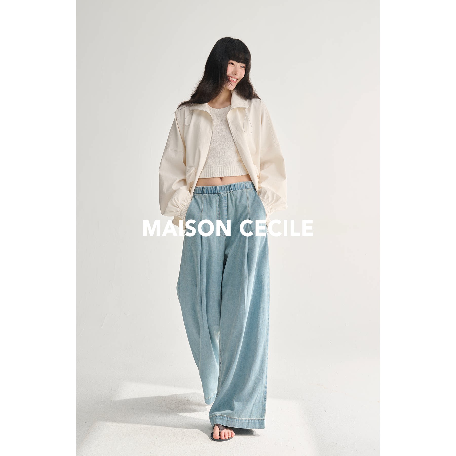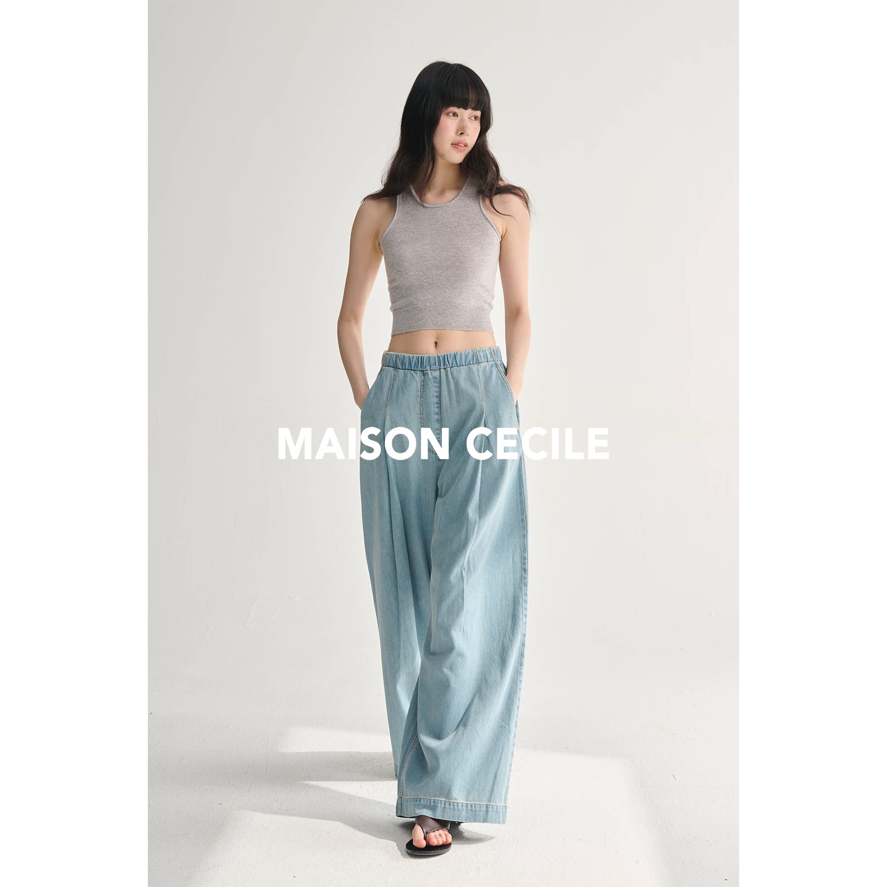 MAISON CECILE 夏日感松弛飘荡松紧腰直筒做旧牛仔裤