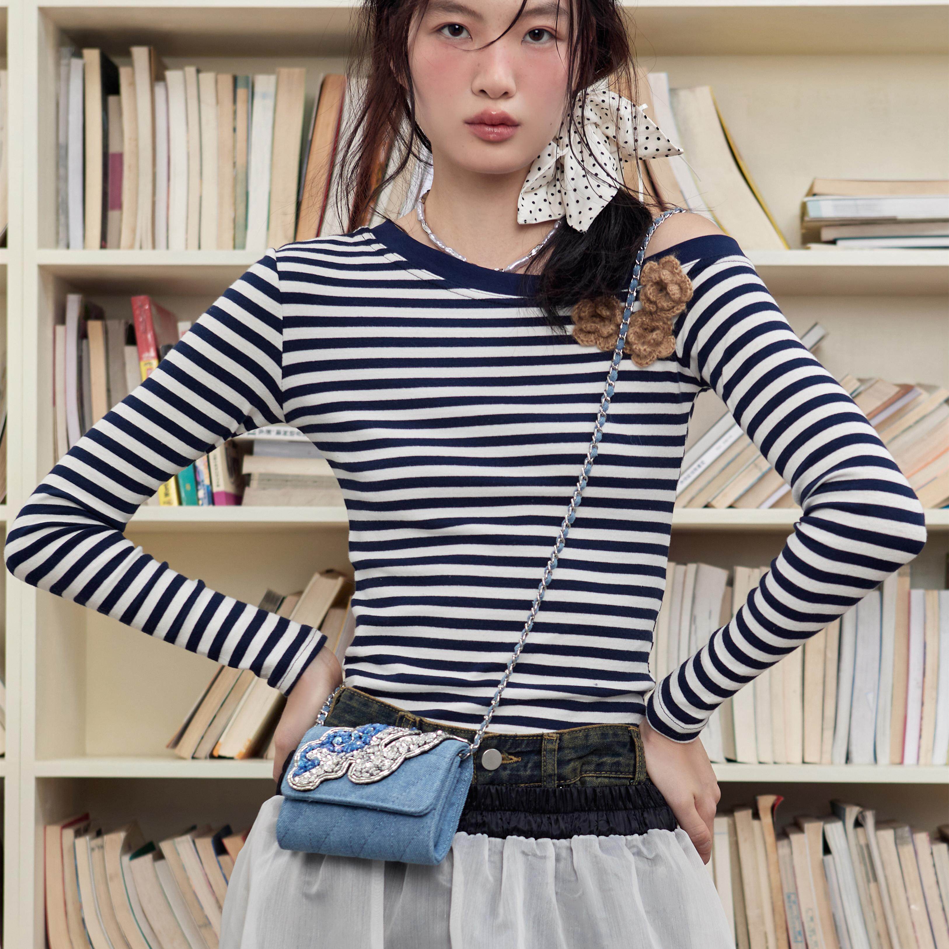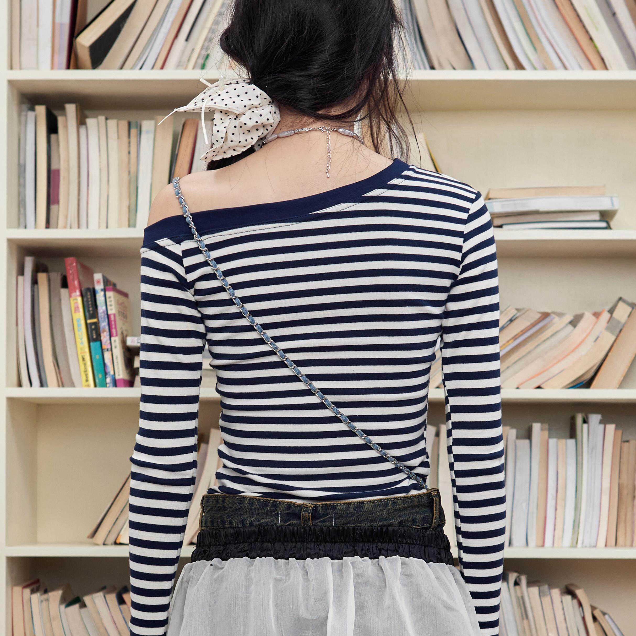 Shiitake 斜肩钩针花朵装饰撞色条纹长袖T恤上衣