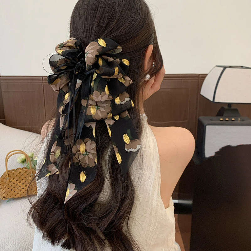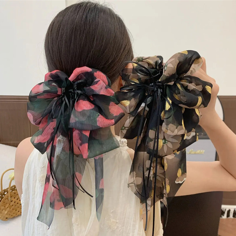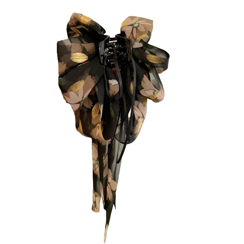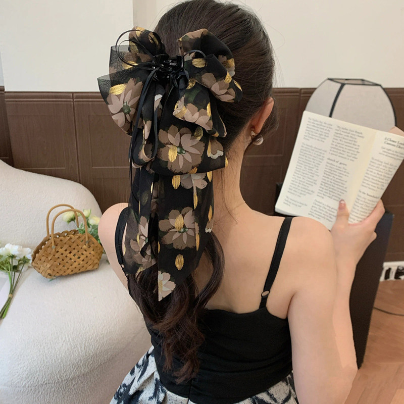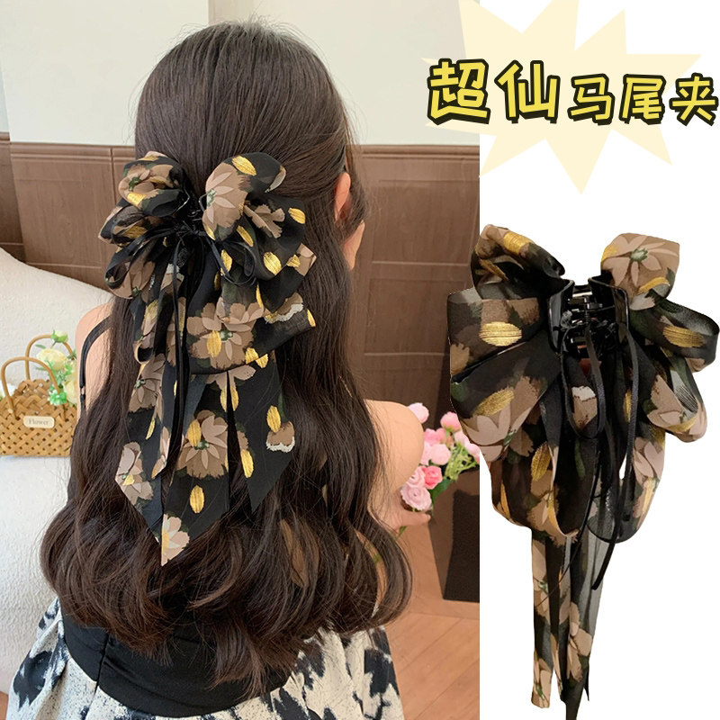 新款金漆云朵马尾抓夹蝴蝶结飘带鲨鱼夹女气质半扎发夹碎花夹子女
