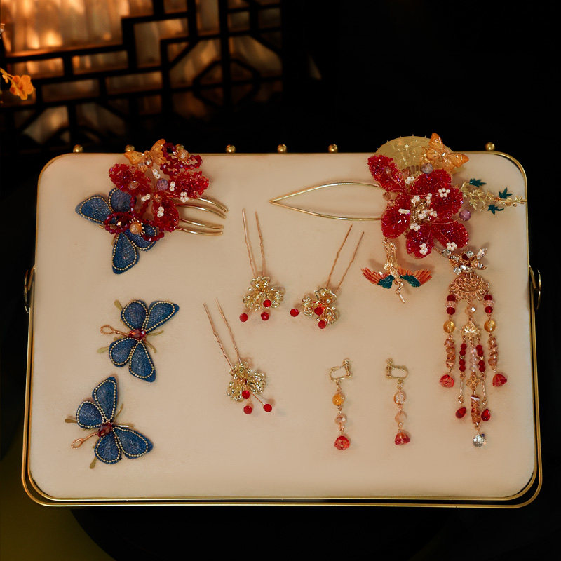 新款新娘头饰古风花朵流苏蝴蝶发簪秀禾服红蓝中式减龄古典发饰品