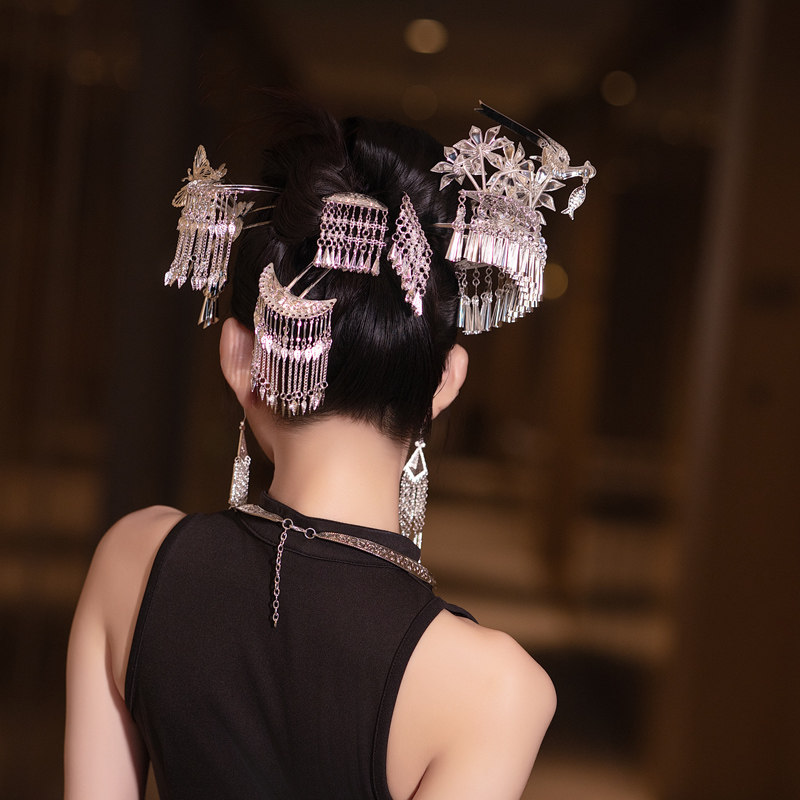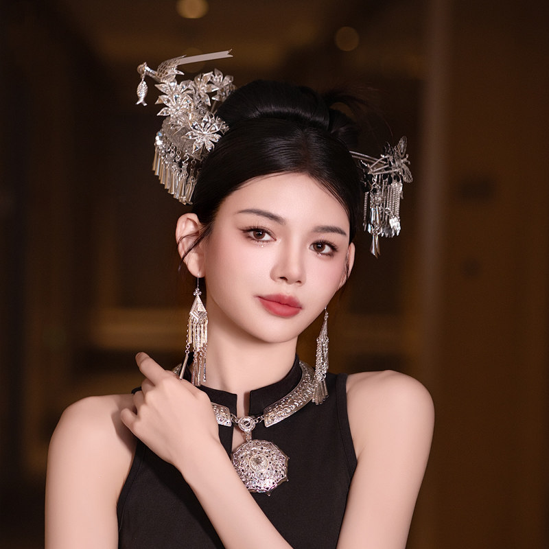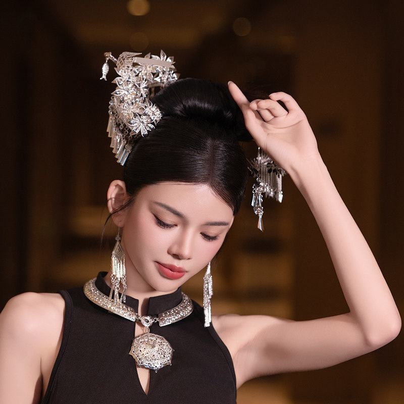 新娘头饰苗族银色发饰凤凰流苏唯美气质盘发发簪结婚民族风配饰品