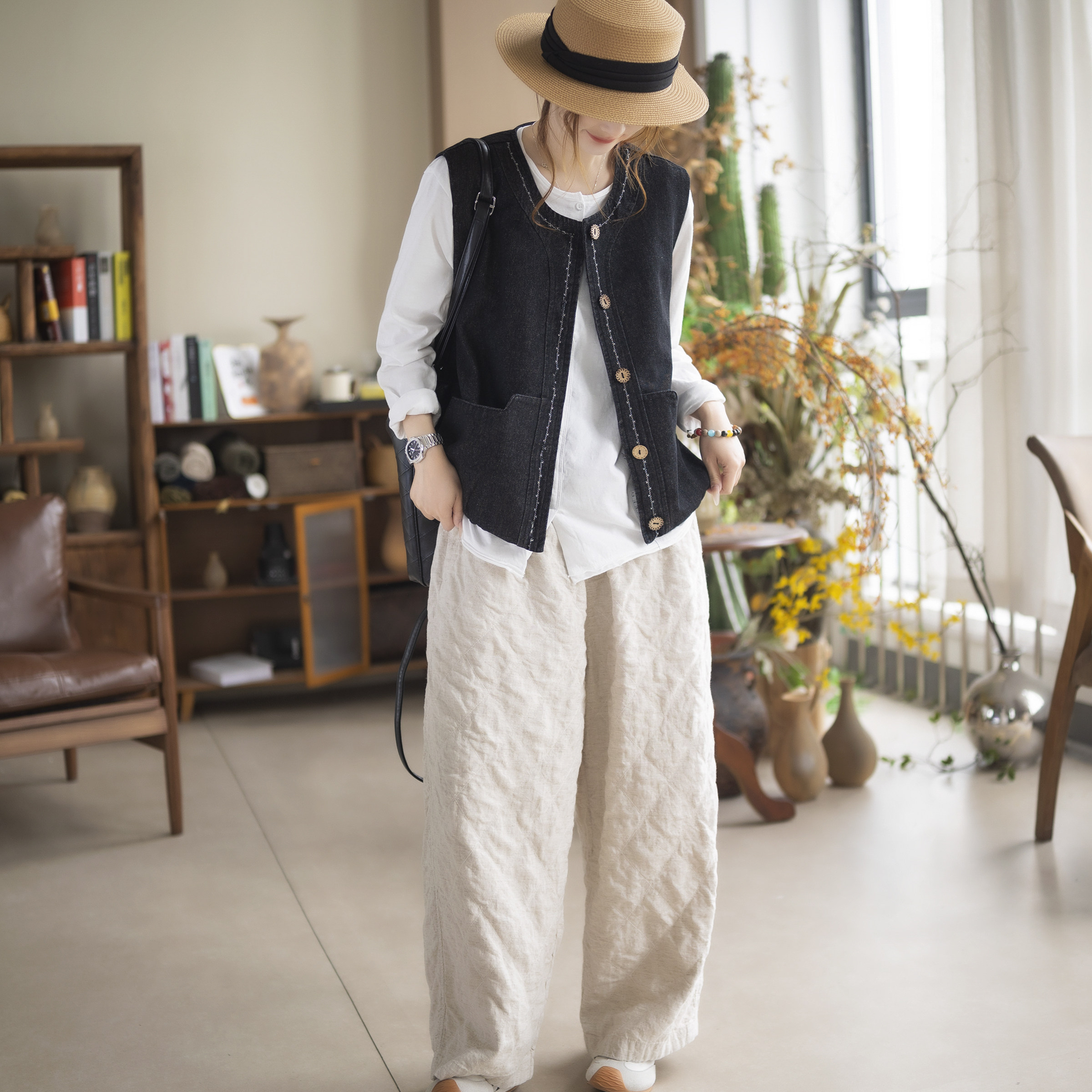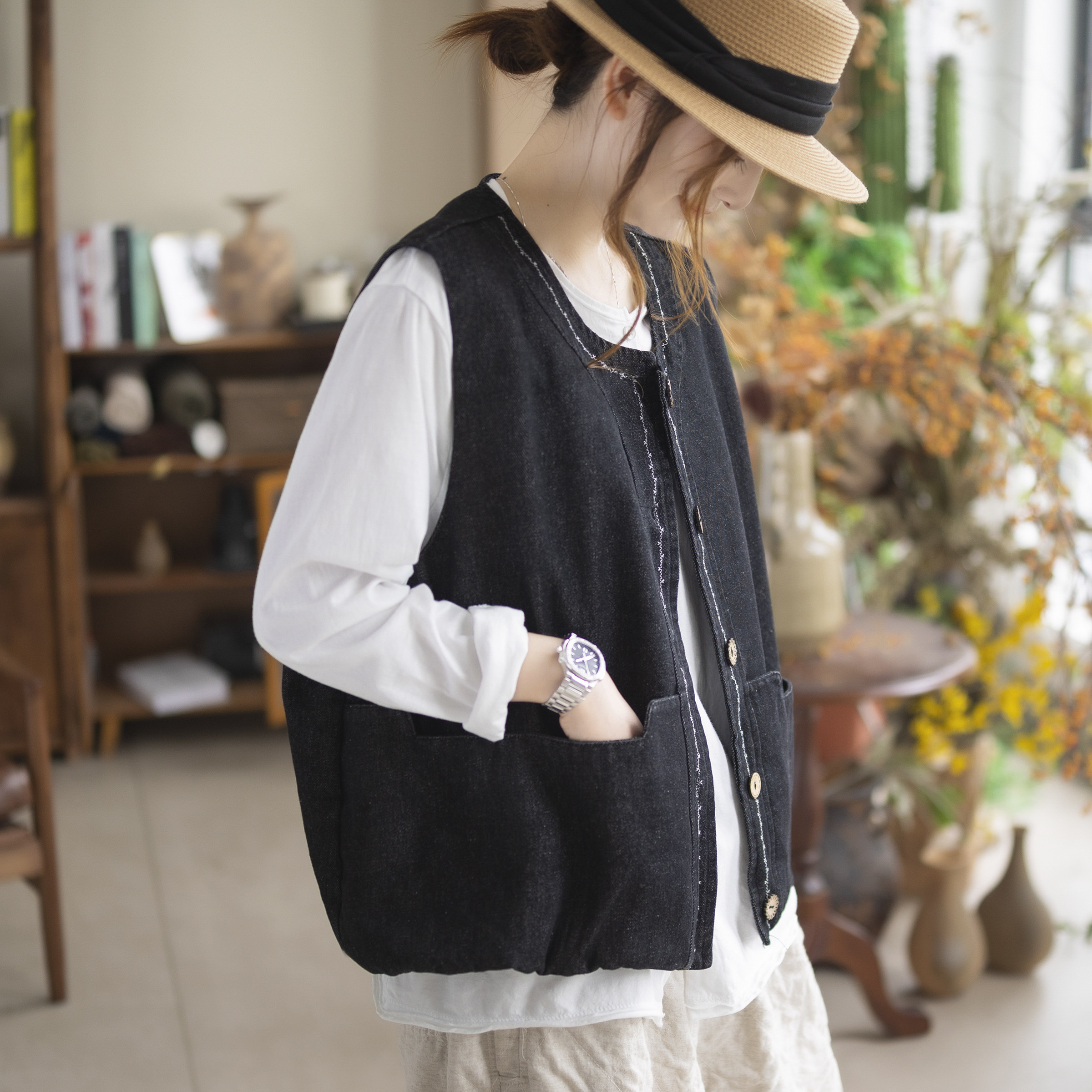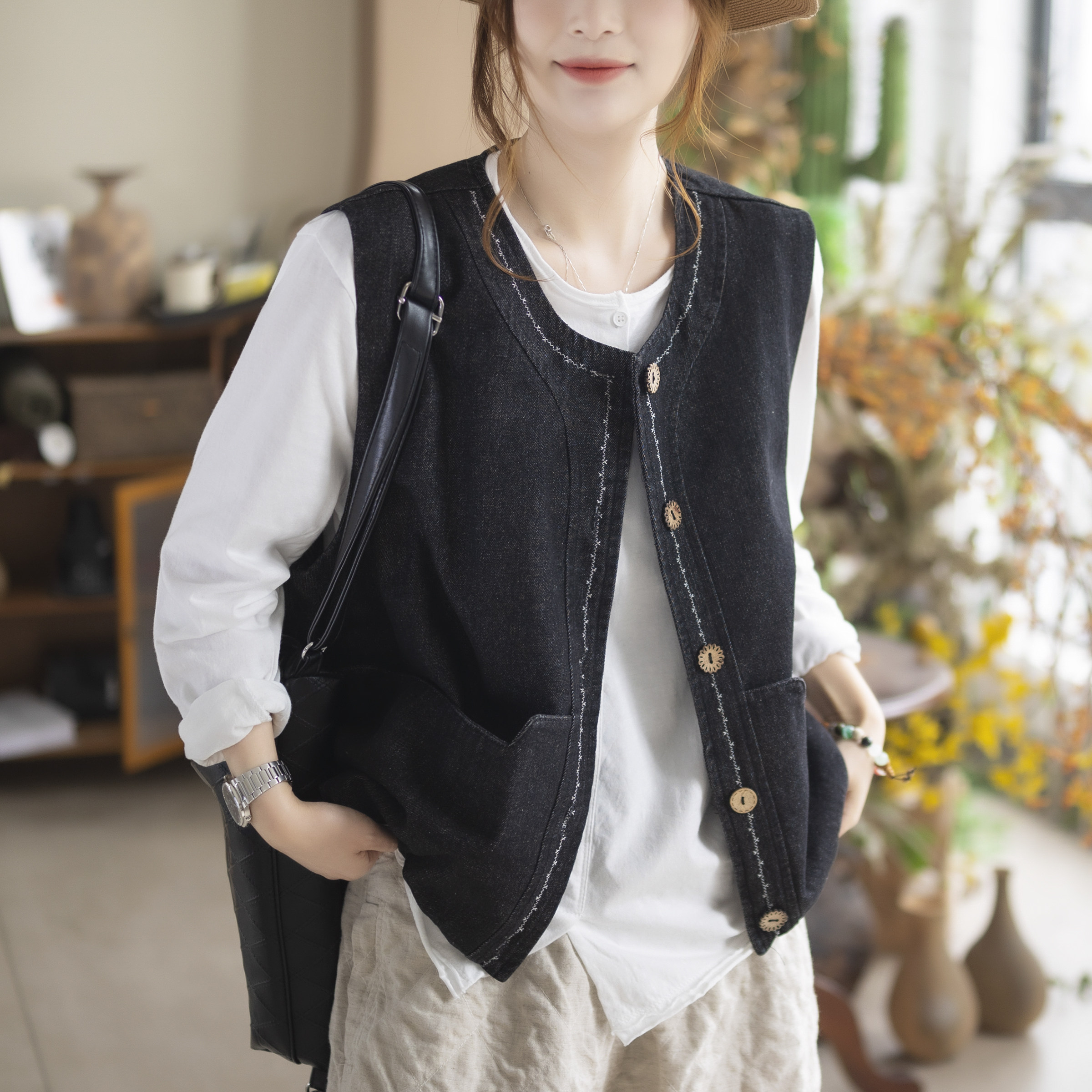 咖咪羽马甲女春秋新款女士无袖坎肩百搭复古纯色休闲女装上衣马夹