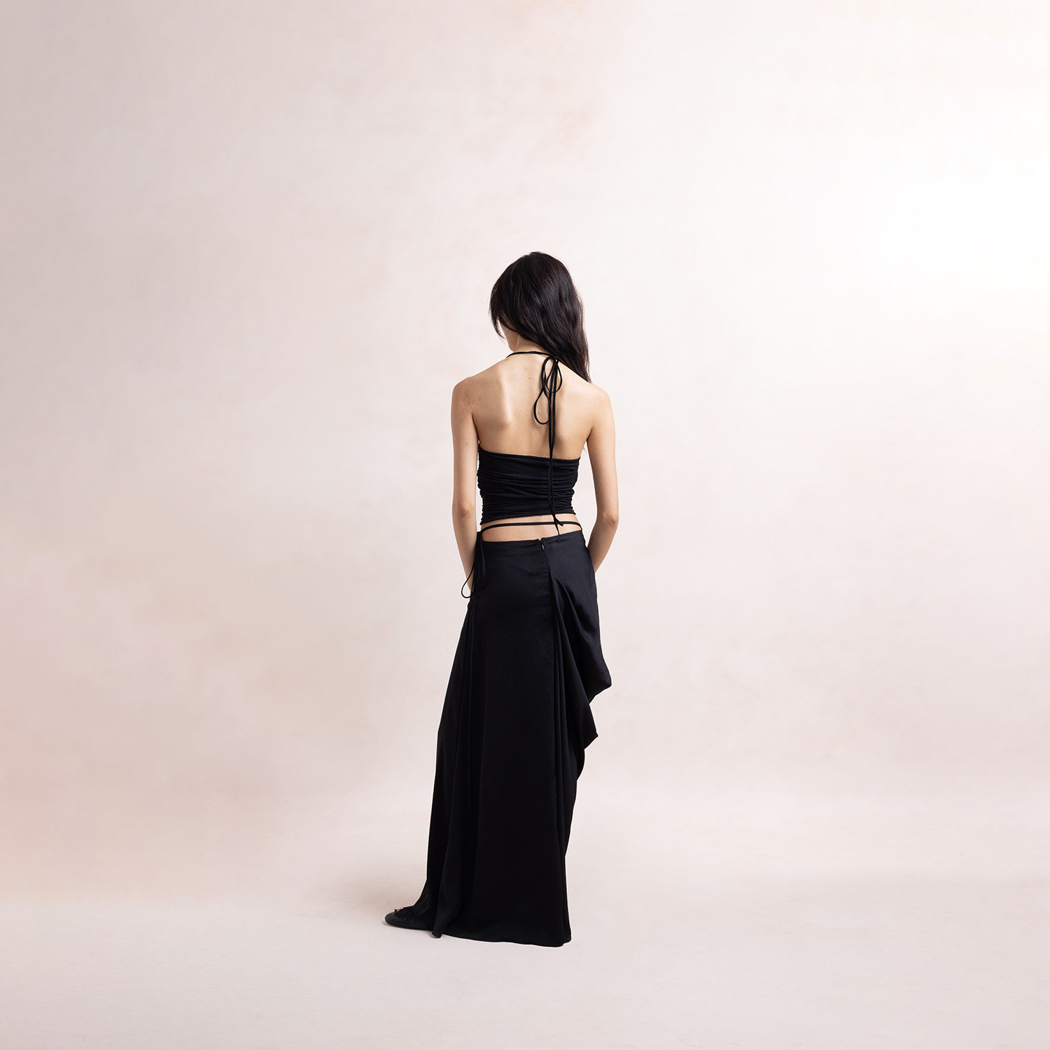 Elywood黑色抽褶挂脖上衣设计师品牌短款黑色内搭可外穿吊带背心