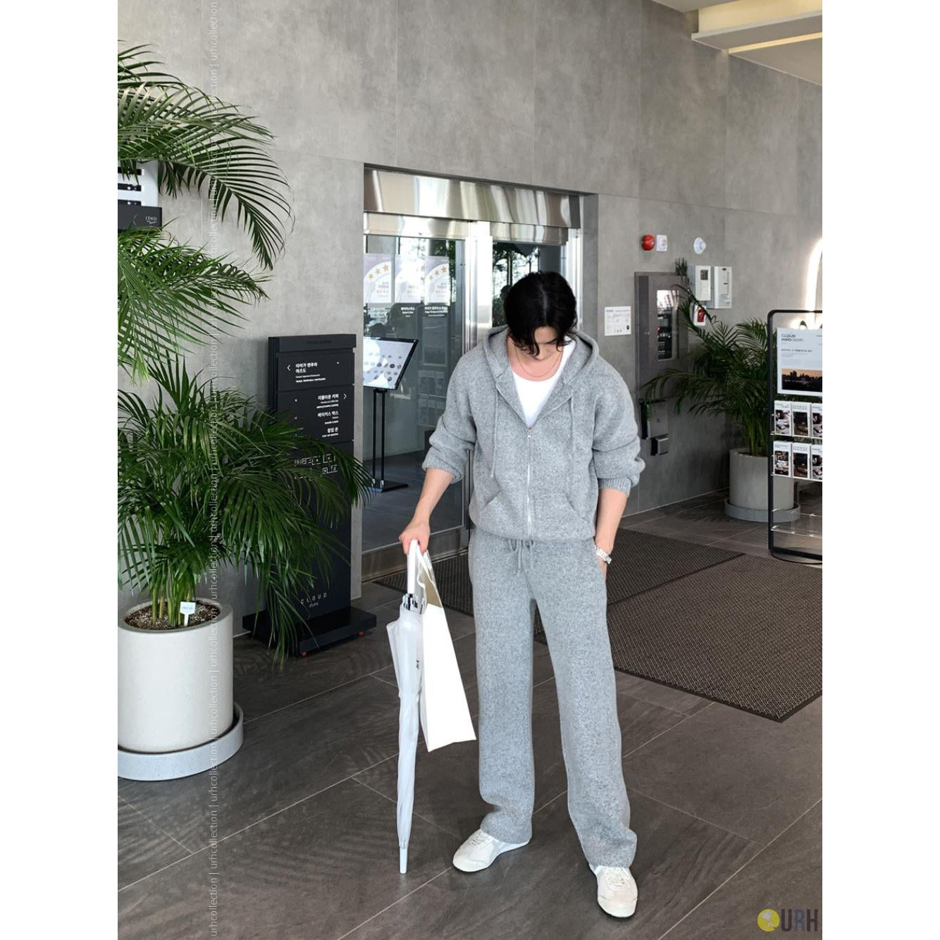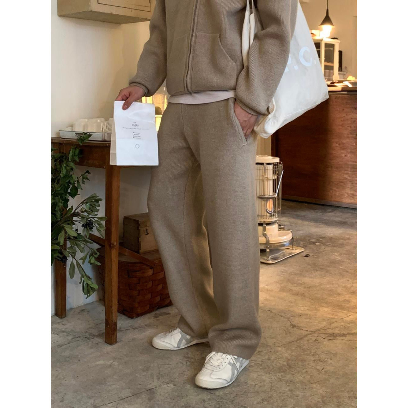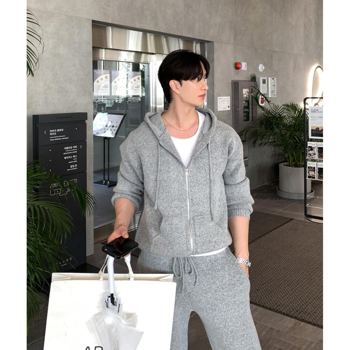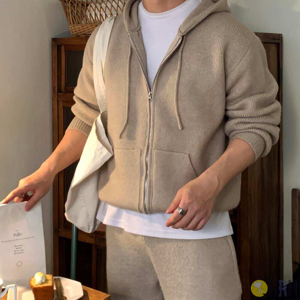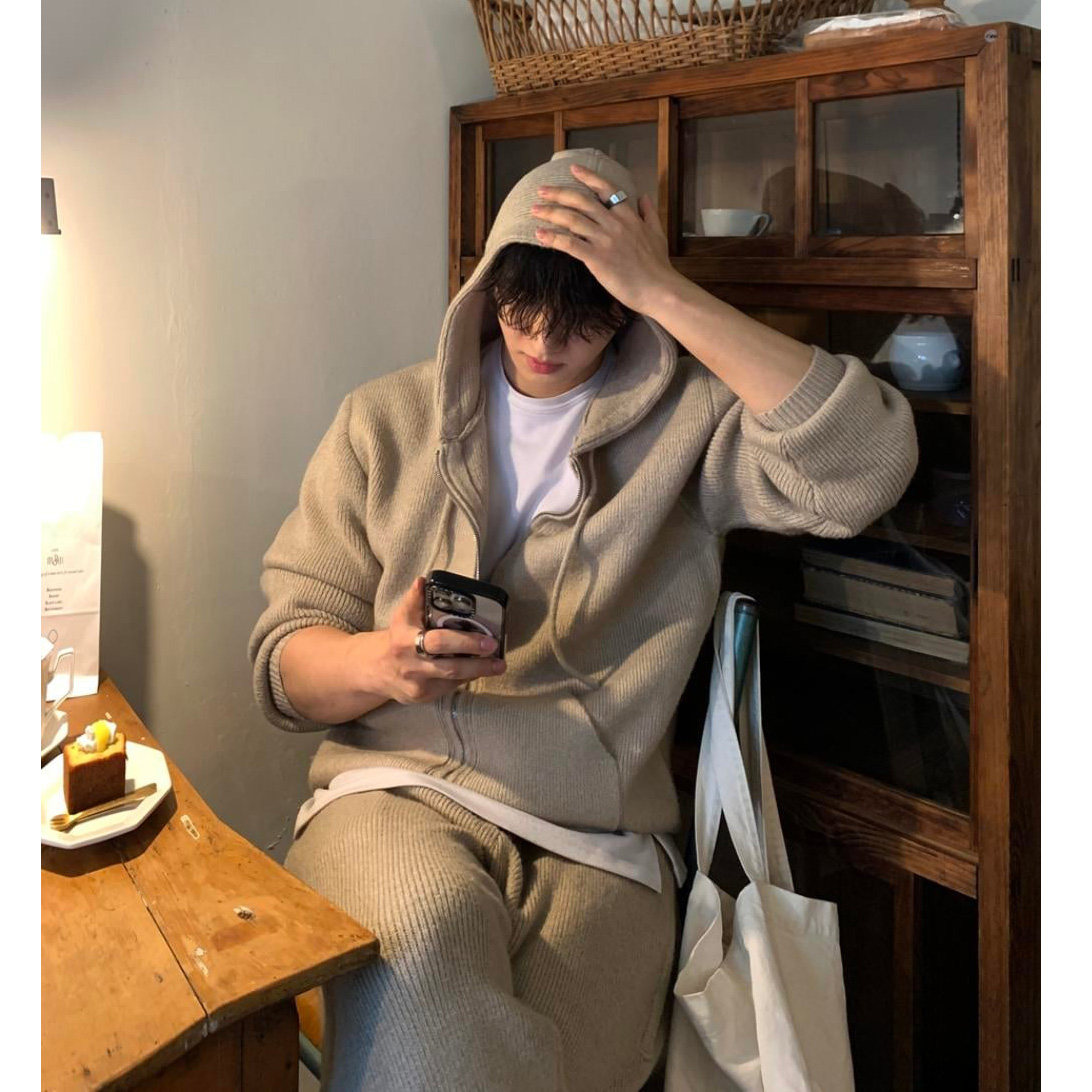 韩国东大门代购春秋时尚潮流连帽拉链针织开衫松紧腰直筒休闲裤男