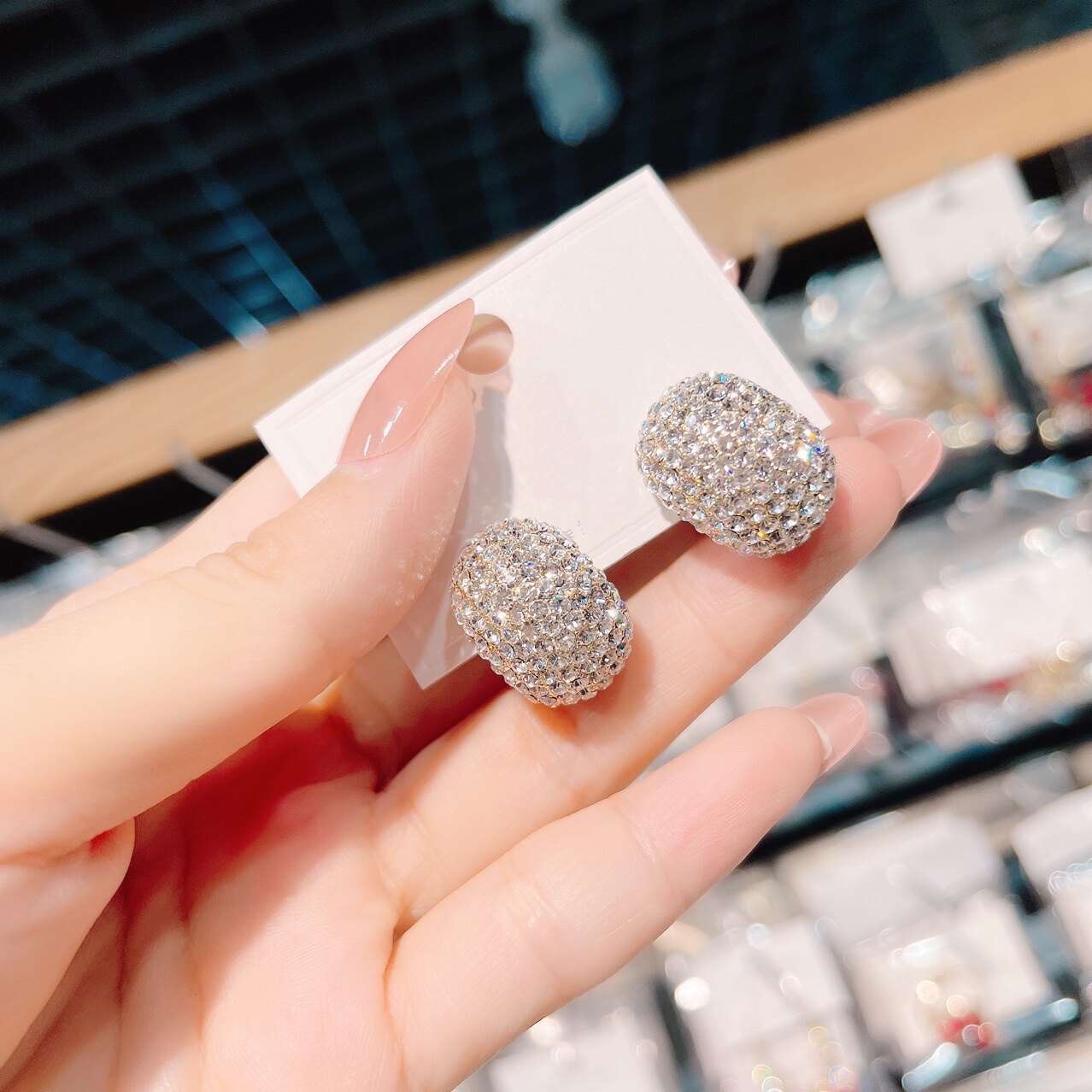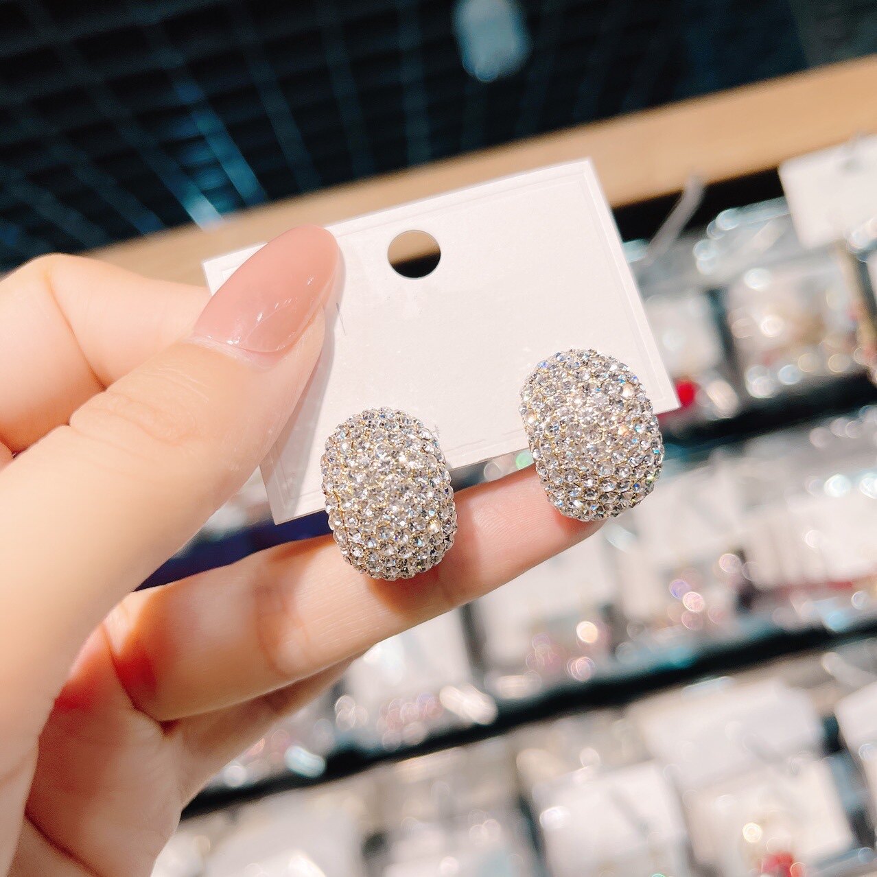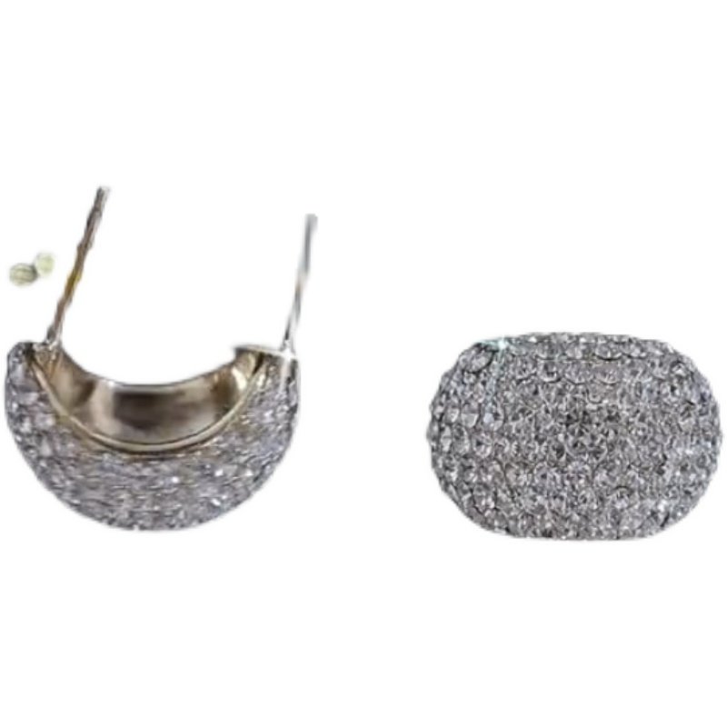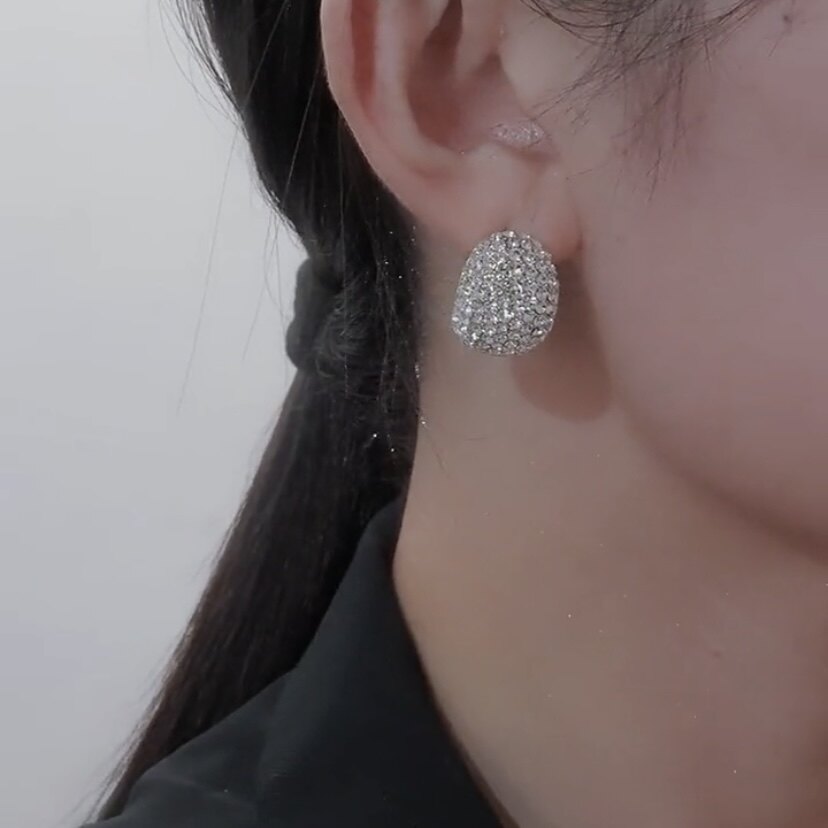 S925银针时尚休闲耳饰新款满钻小蚕豆耳钉女式简约气质耳环通勤