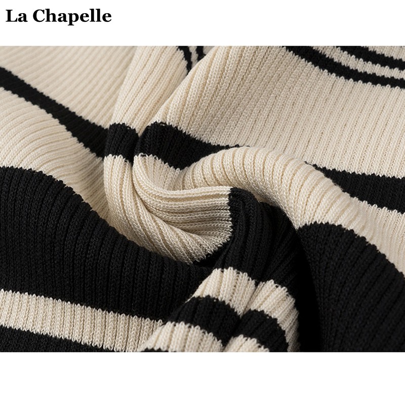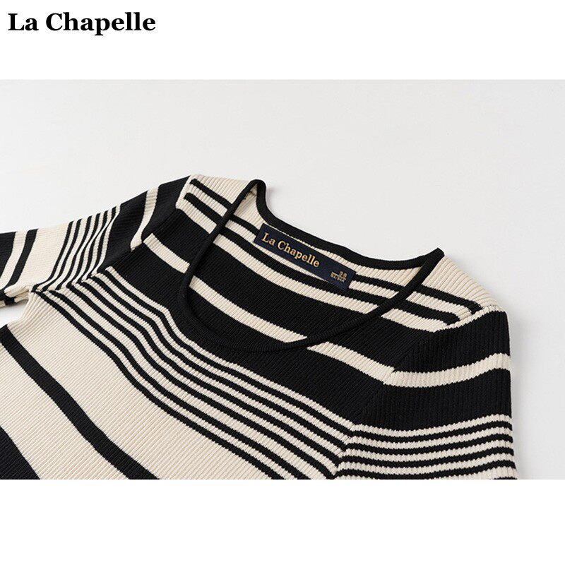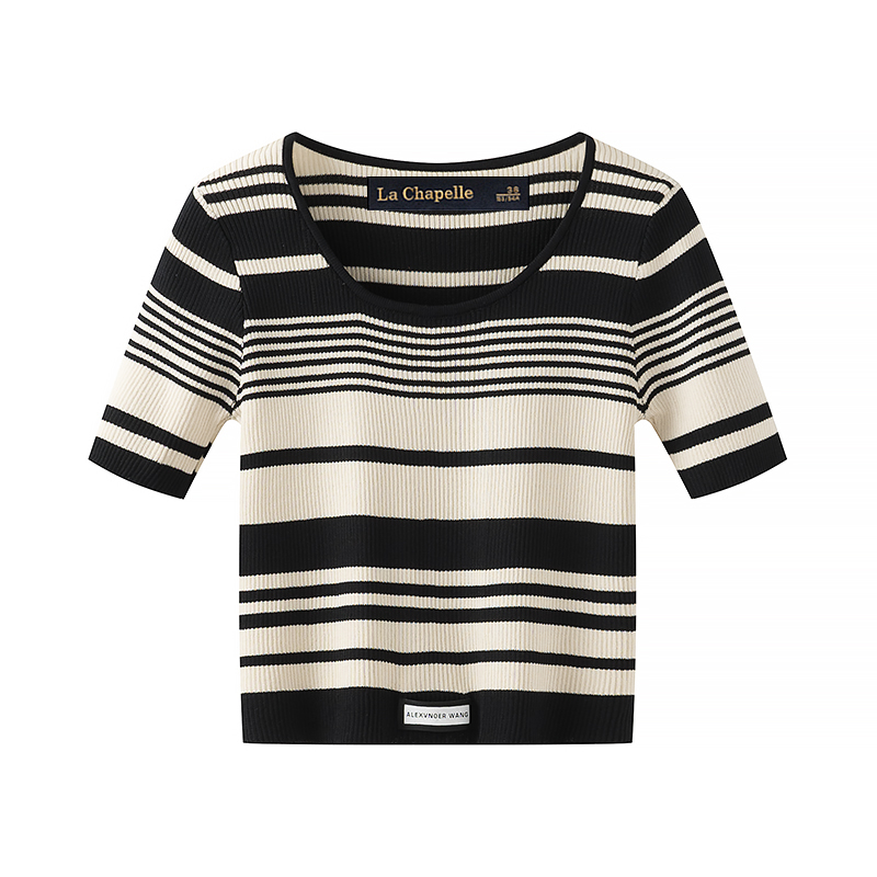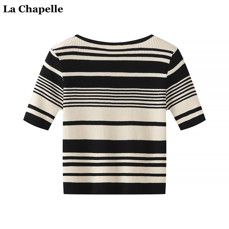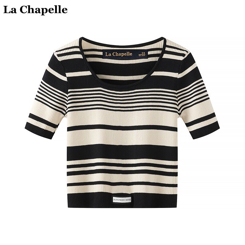 拉夏贝尔/La Chapelle夏季新款条纹短袖针织衫T恤女短款修身上衣