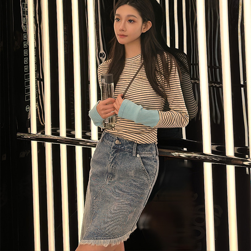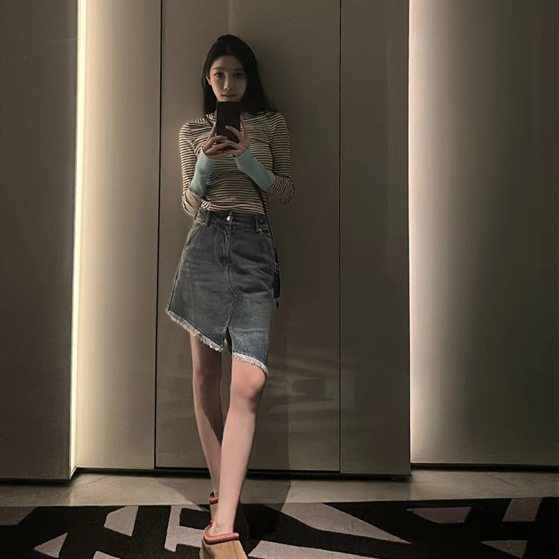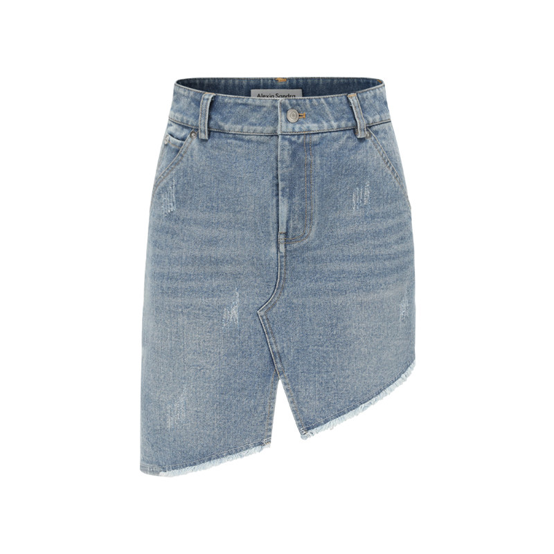 Alexia Sandra春夏新款斜下摆修身A摆不规则牛仔短裙