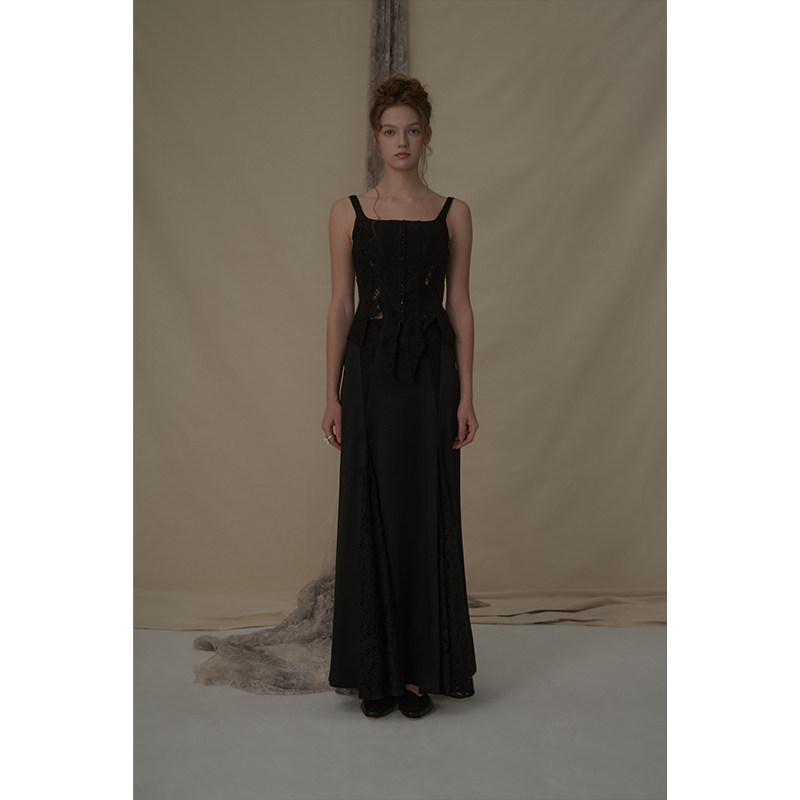 Elywood黑色蕾丝分割醋酸马甲镂空显瘦低领上衣小众原创设计内搭