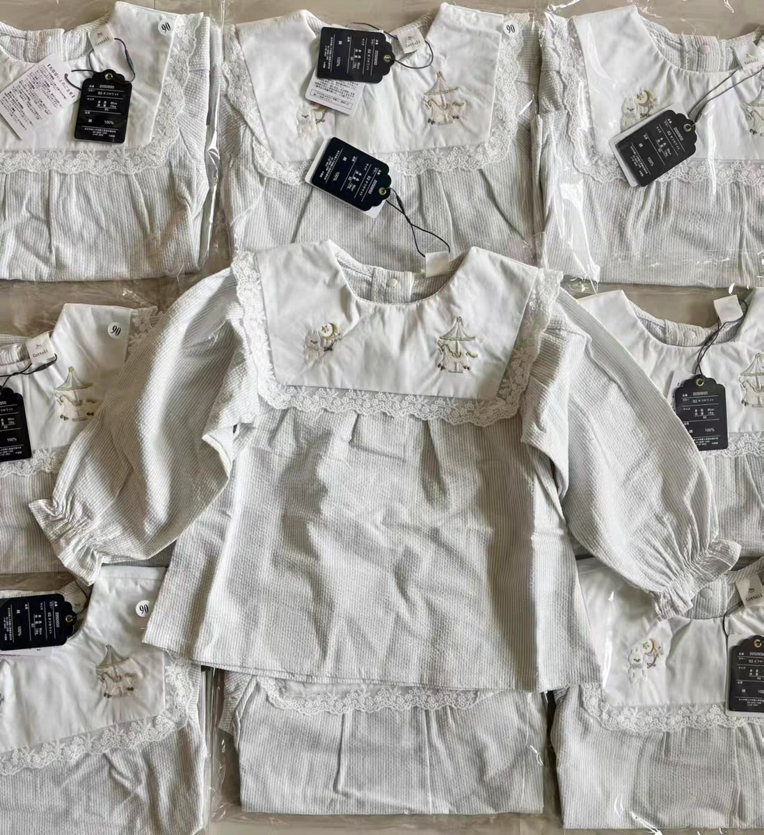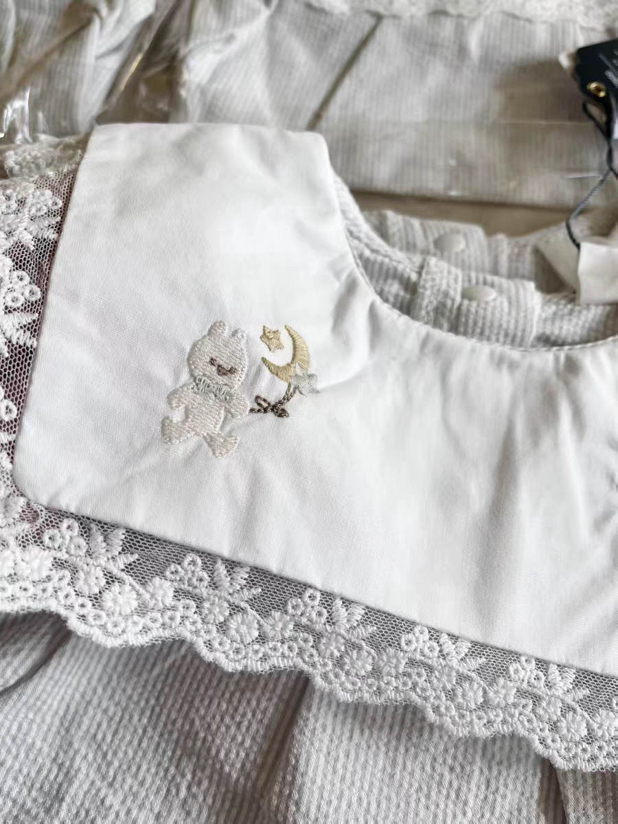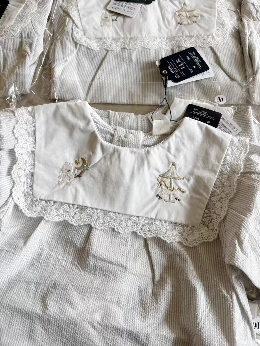 现货发日单小木马刺绣翻领上衣条纹棉布花边娃娃衫女宝婴童衬衫