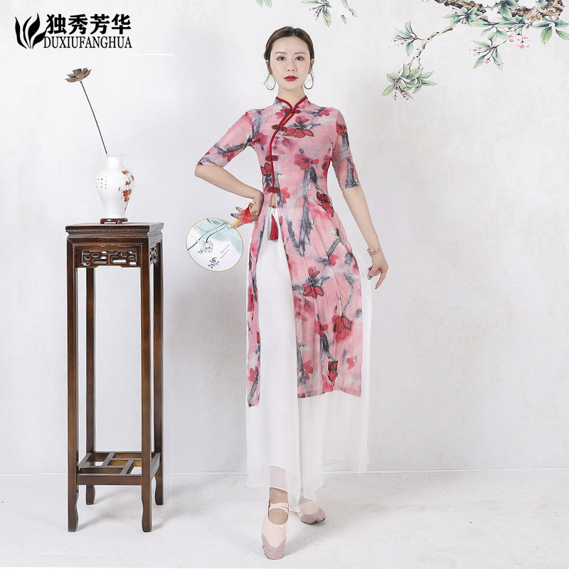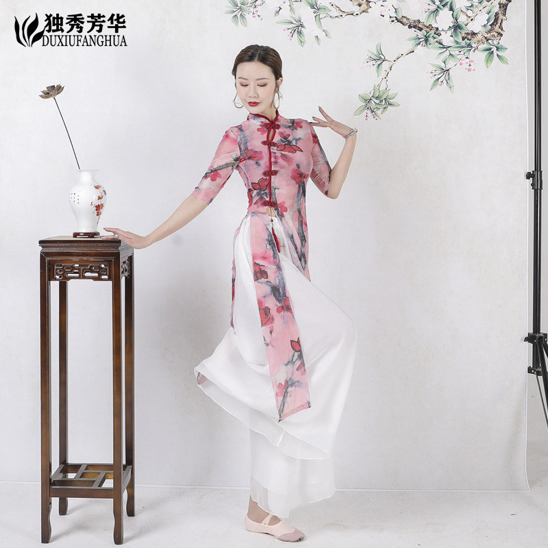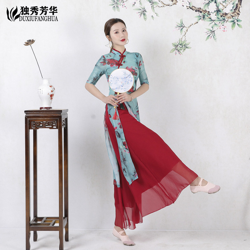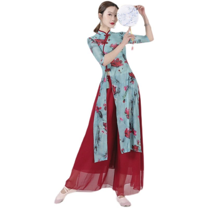 古典舞纱衣长款舞蹈服装开叉旗袍中国民族舞练功服身韵演出服套装