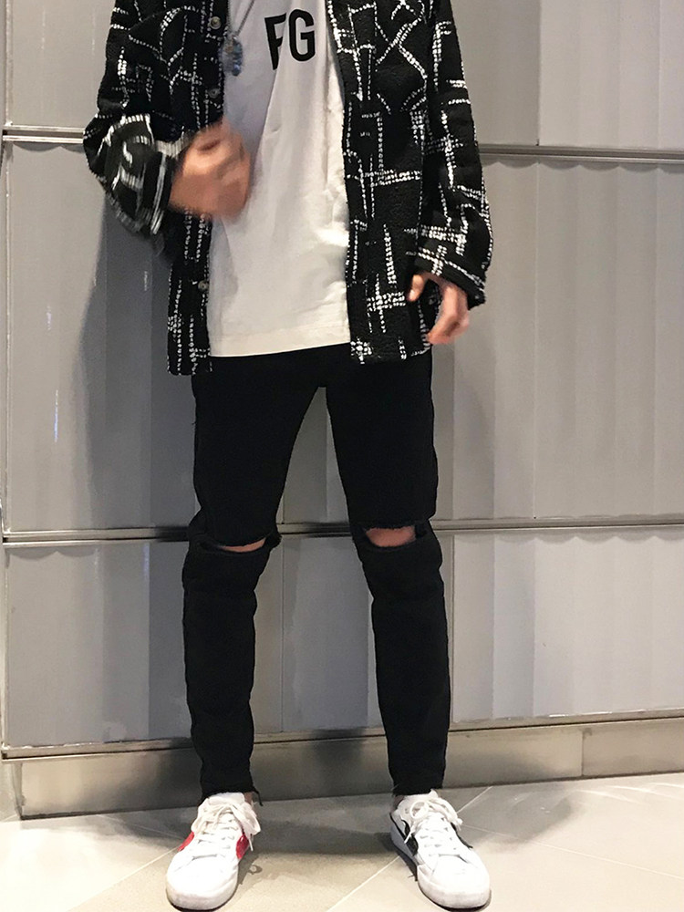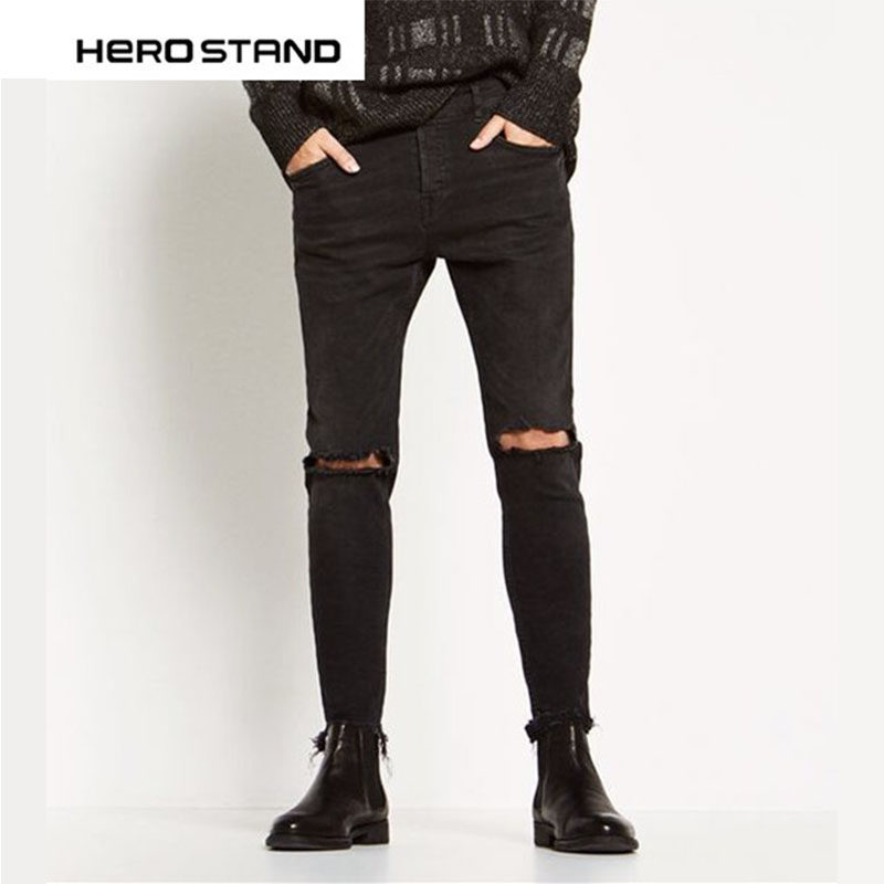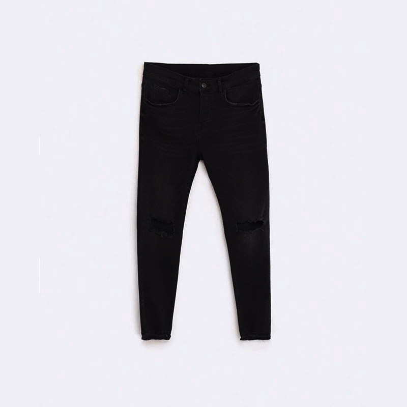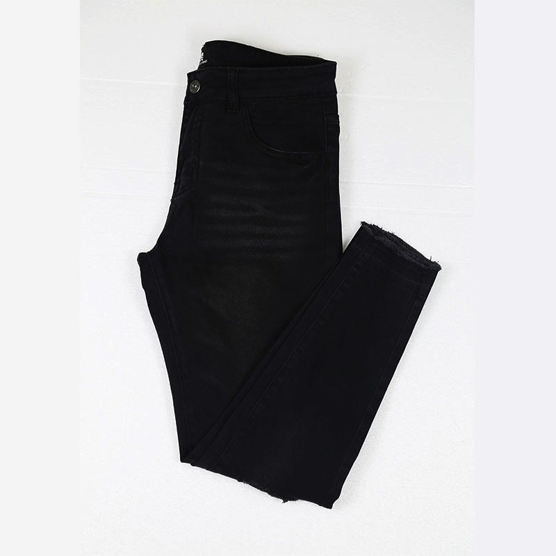 HOSD新品高质量Skinny Fit黑色破洞紧身弹力牛仔裤毛边百搭小脚裤