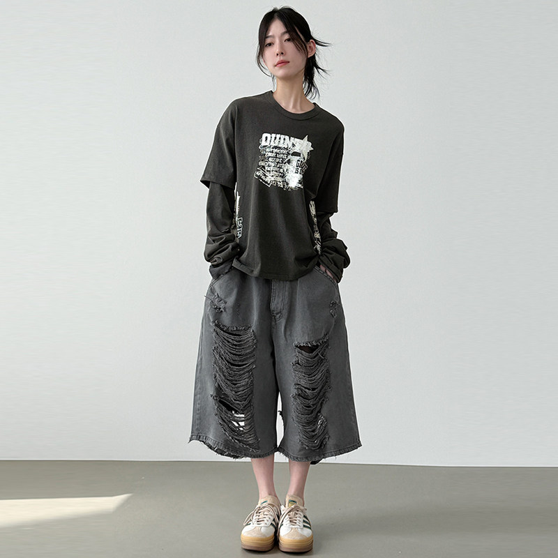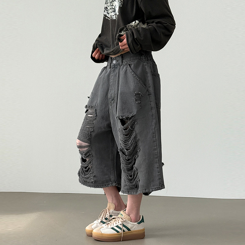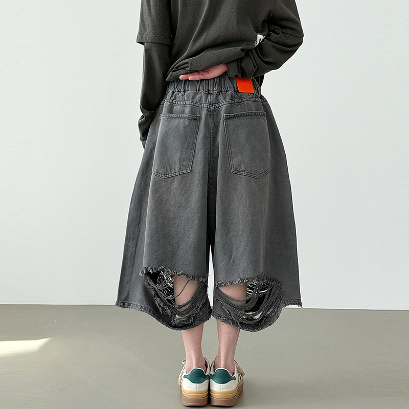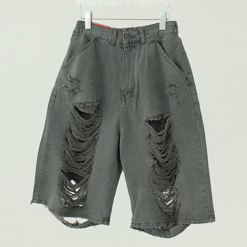 韩代25damage denim bermuda banding pants(unisex)破洞牛仔短裤