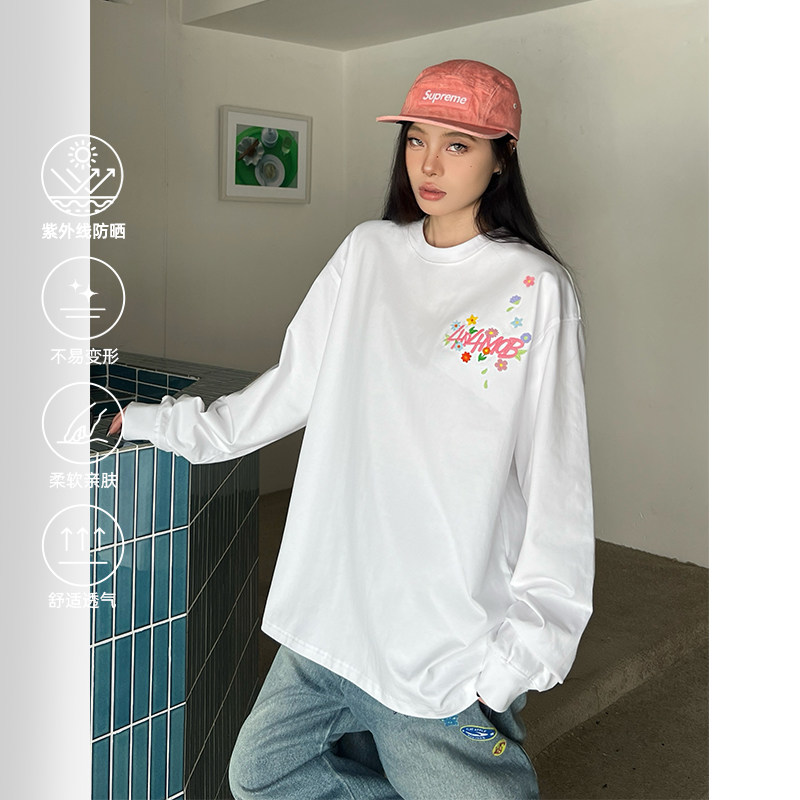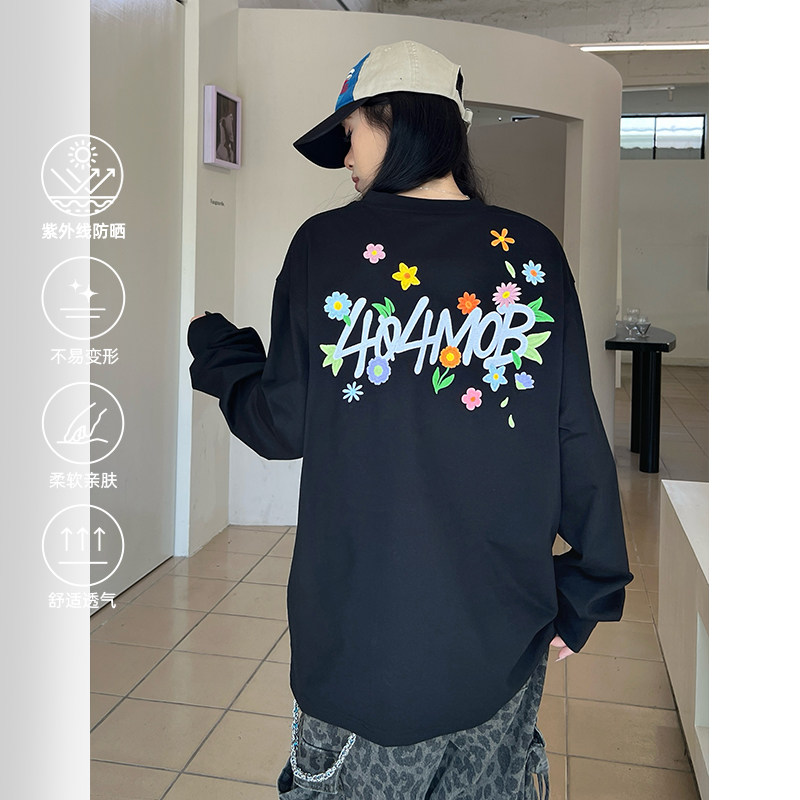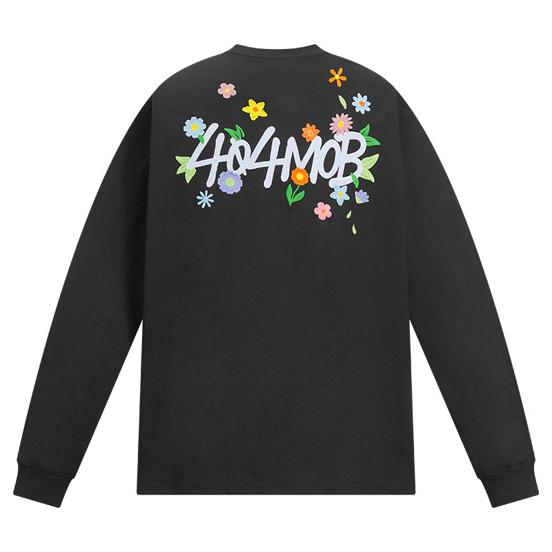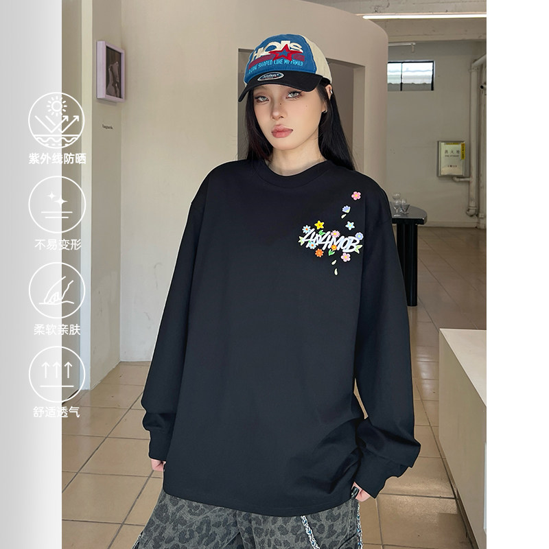 404MOB潮流美式重工花卉刺绣长袖T恤男涂鸦宽松情侣防晒圆领上衣