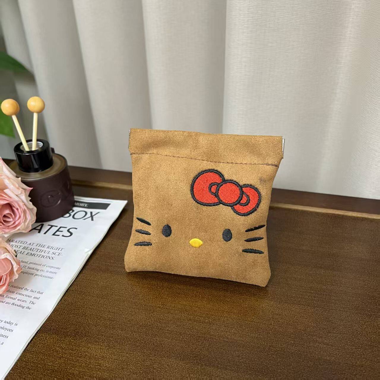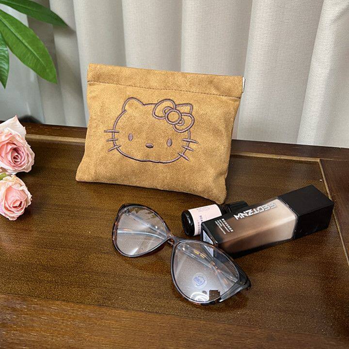 kitty化妆包内胆包弹片自动闭合秋冬新款麂皮绒刺绣大容量洗漱包
