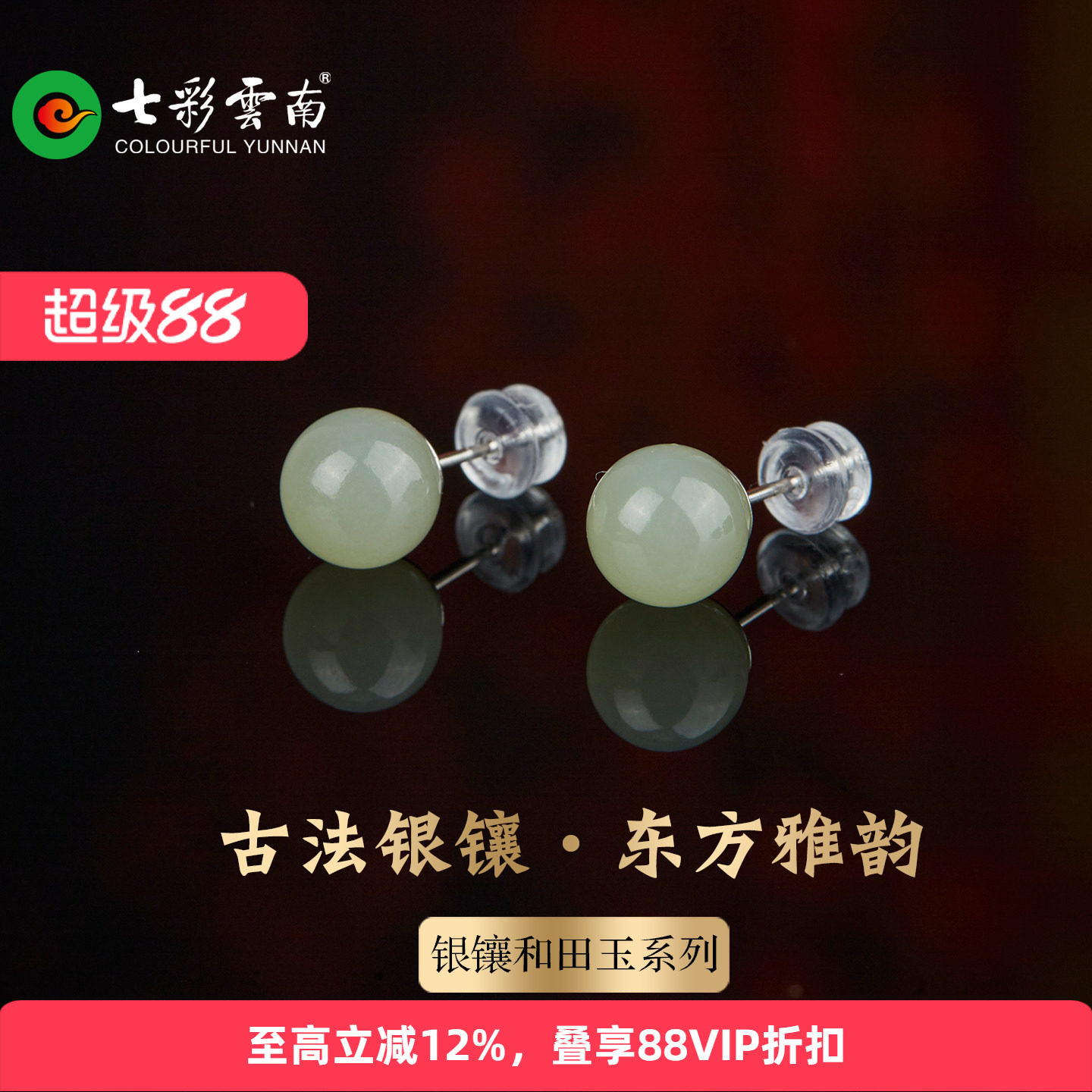 七彩云南和田玉新中式耳钉女古法银镶圆形玉石中国风情人节礼物