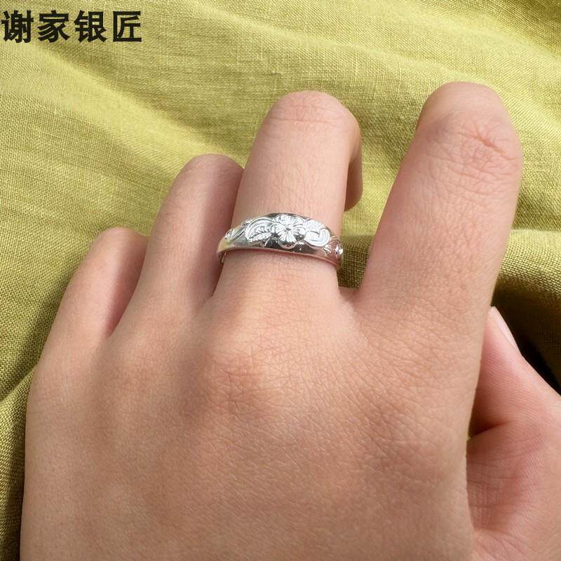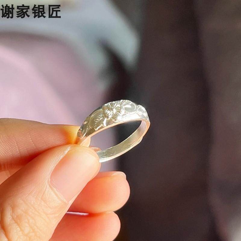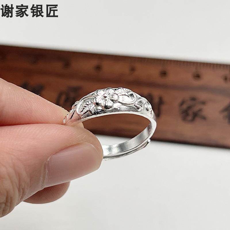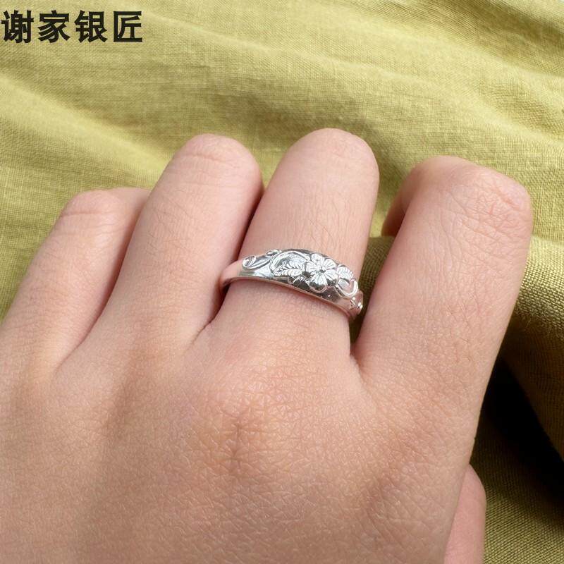 谢家银匠老款梅花手工戒指 999足银复古梅花开口调节戒圈