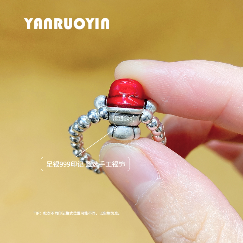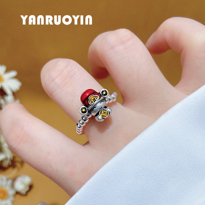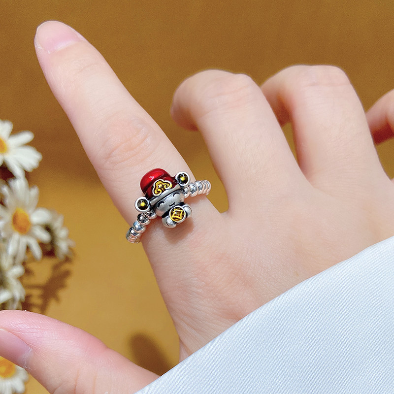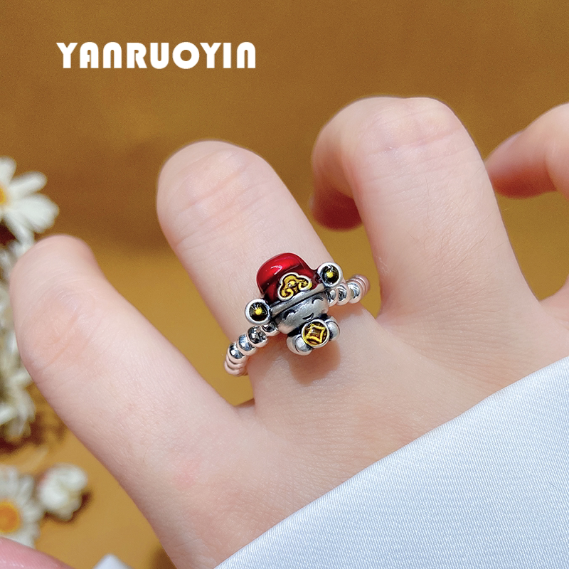 足银财神爷戒指女珐琅彩立体五路财神弹力绳编织百搭纯银食指戒男