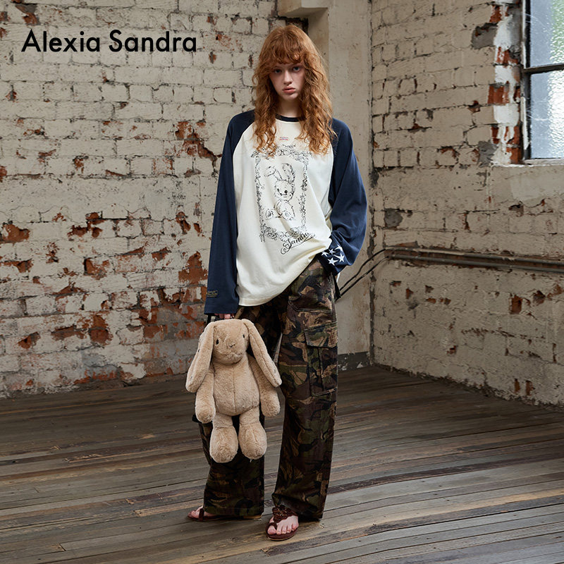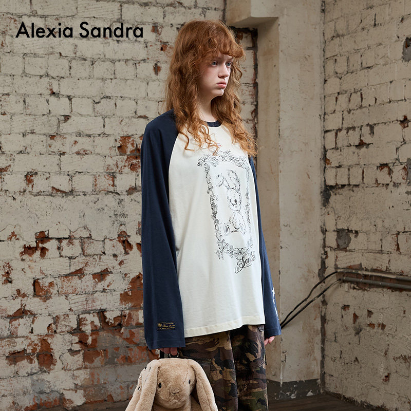 Alexia Sandra经典新款童话小兔Della撞色插肩休闲长袖印花T恤女
